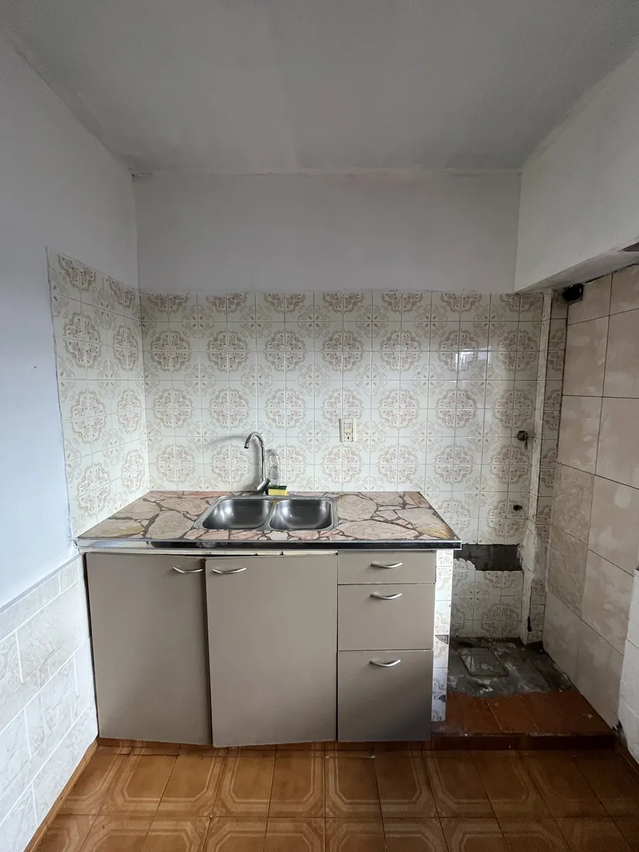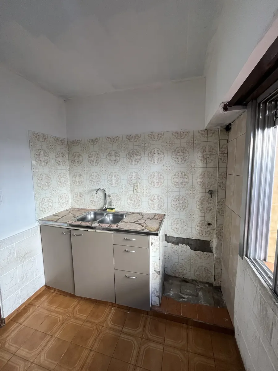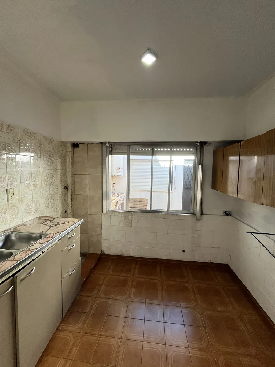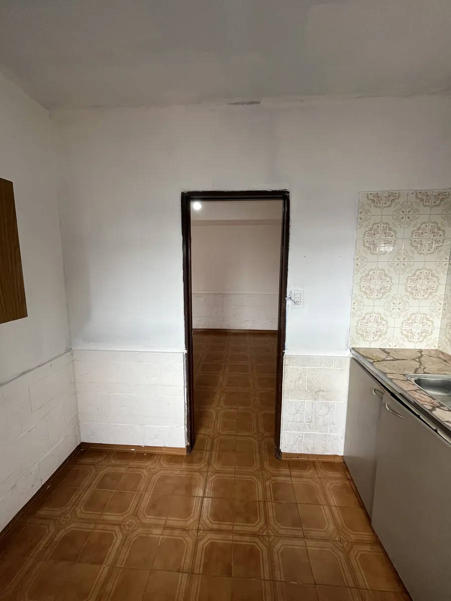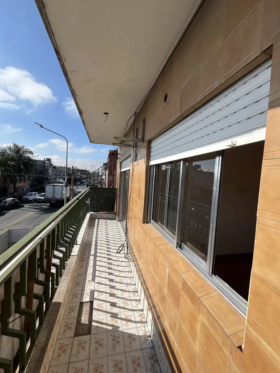 Three-room apartment on the first floor, street-facing, accessed by stairs, in Isidro Casanova. It has a living-dining room without a kitchen appliance, a separate kitchen, 2 bedrooms (one with a balcony), and a full bathroom. The shared outdoor area includes a personal washing pool. Rent is $500,000 per month with quarterly adjustments using the ICL index; building fees are $50,000 and include water and general service charges. Tenant pays electricity and gas, as well as fire and civil liabilit