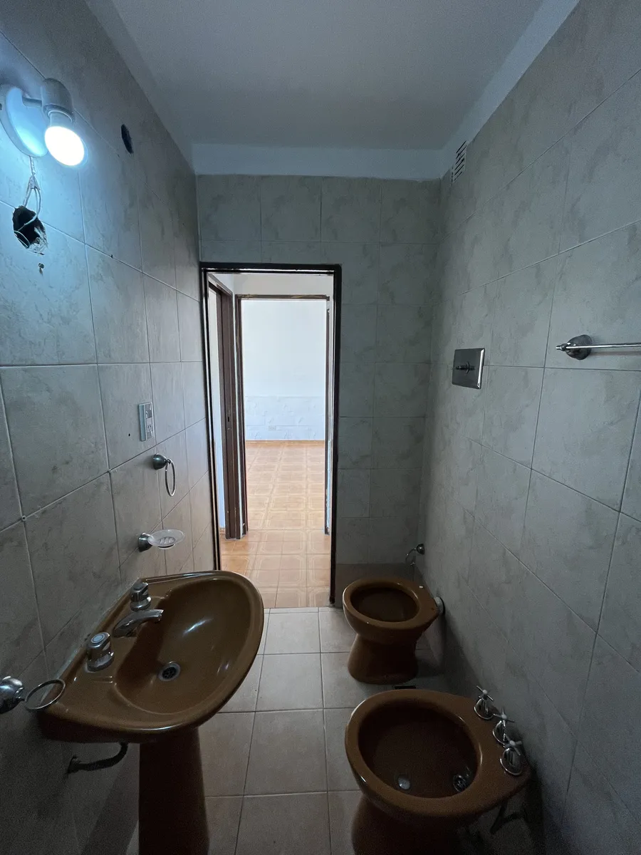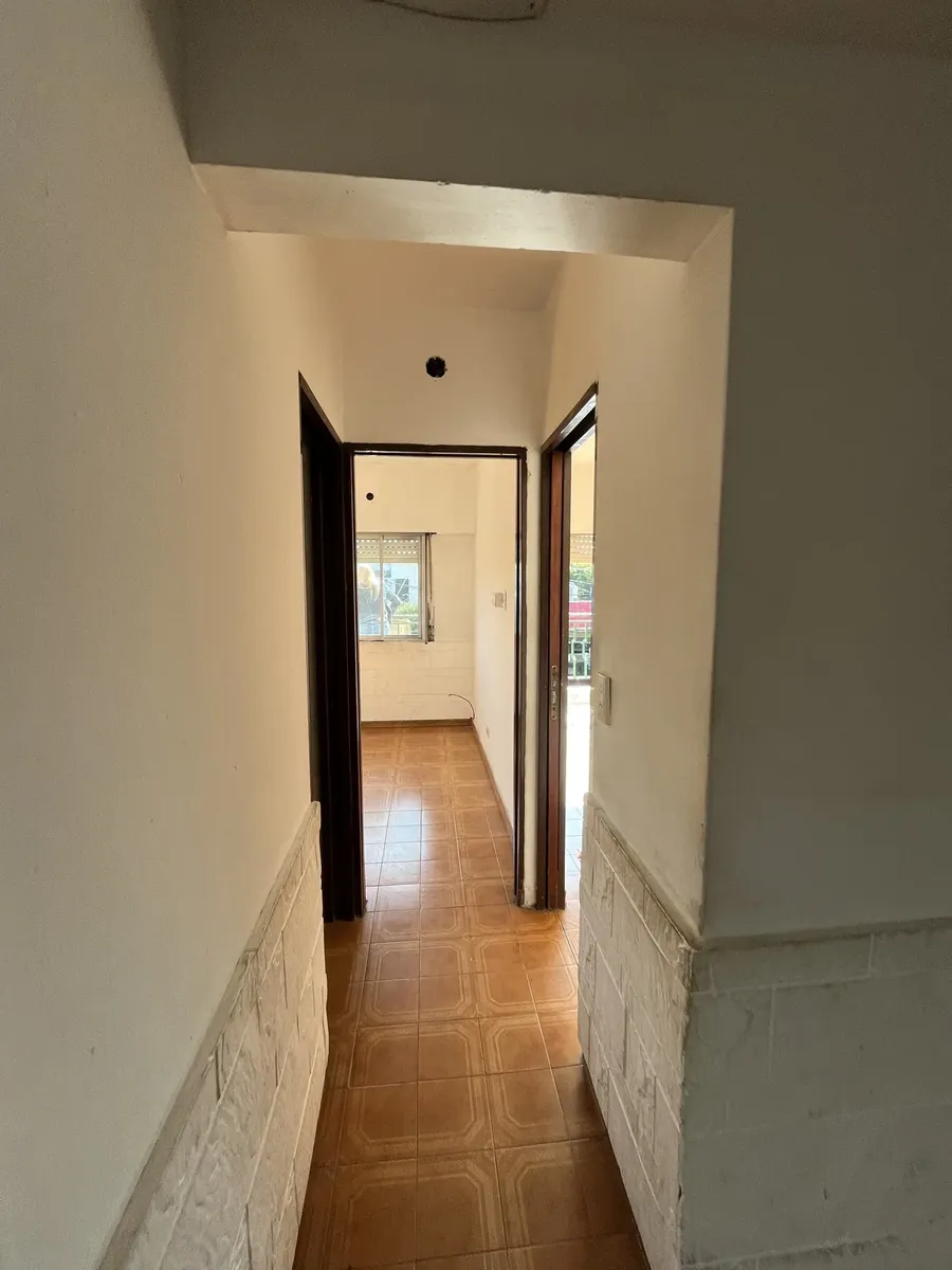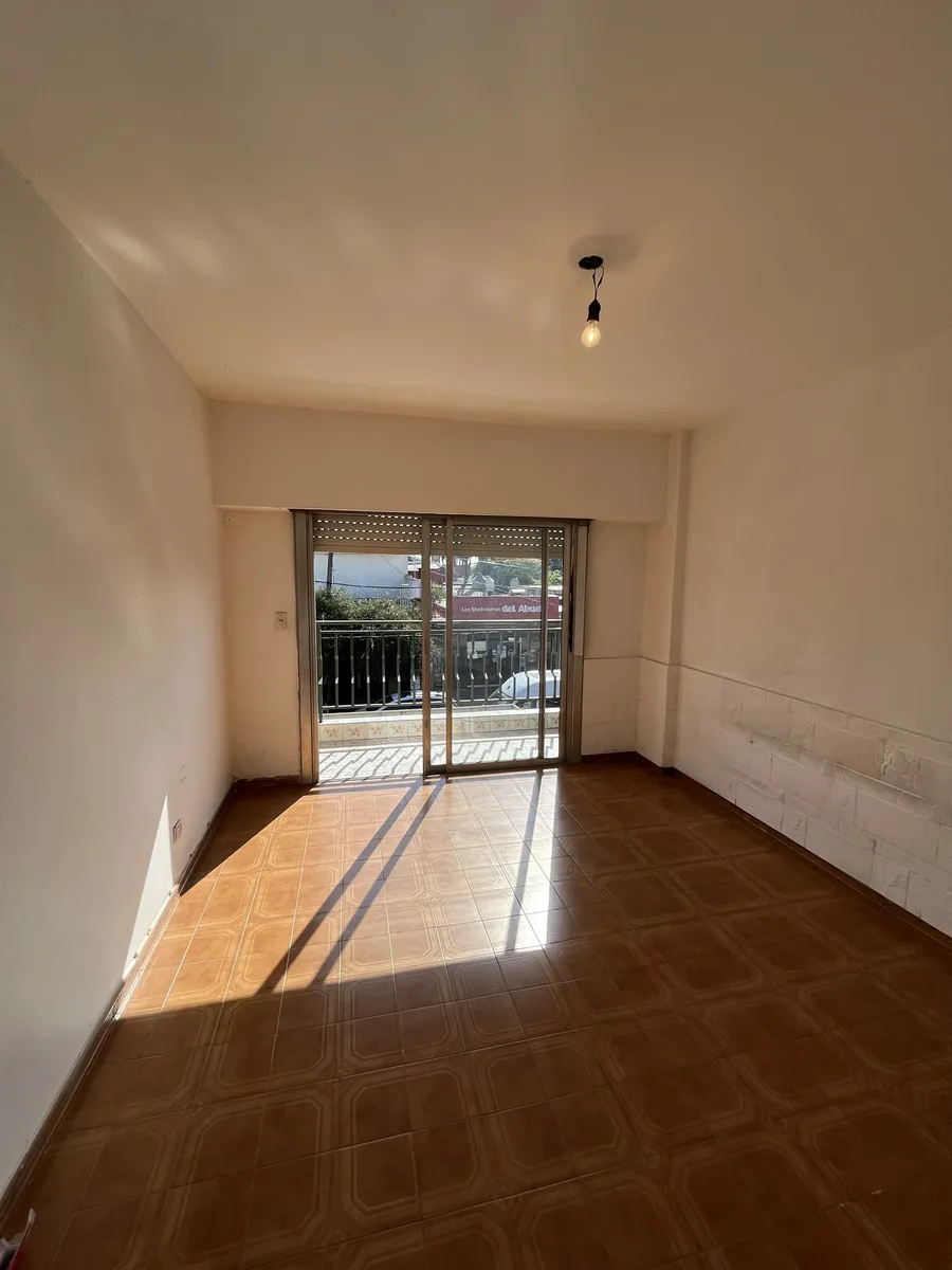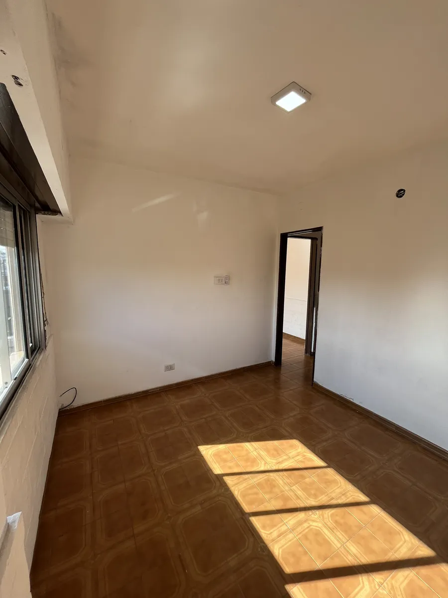 Three-room apartment on the first floor, street-facing, accessed by stairs, in Isidro Casanova. It has a living-dining room without a kitchen appliance, a separate kitchen, 2 bedrooms (one with a balcony), and a full bathroom. The shared outdoor area includes a personal washing pool. Rent is $500,000 per month with quarterly adjustments using the ICL index; building fees are $50,000 and include water and general service charges. Tenant pays electricity and gas, as well as fire and civil liabilit