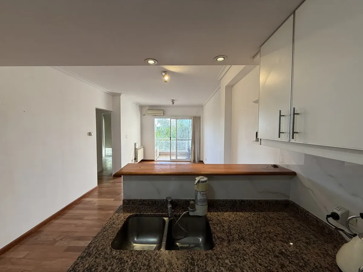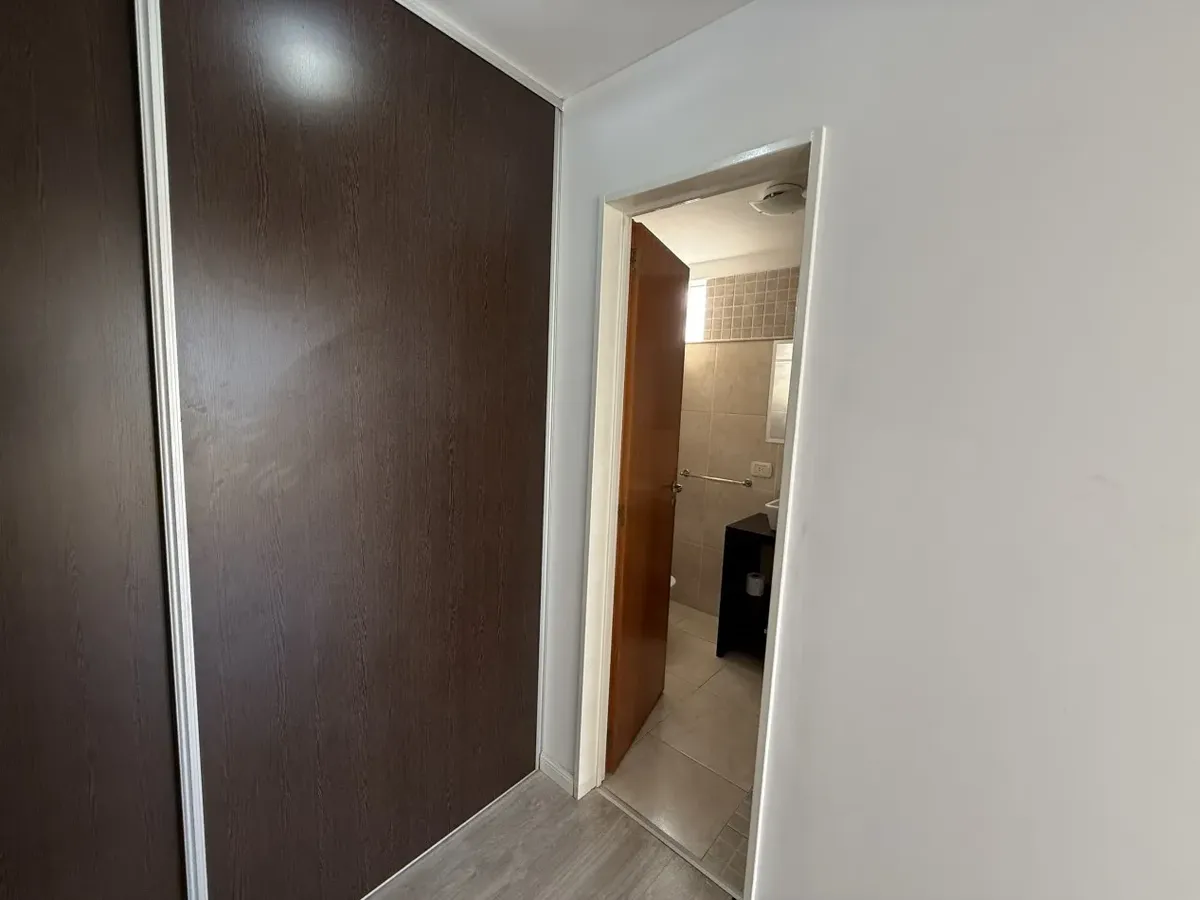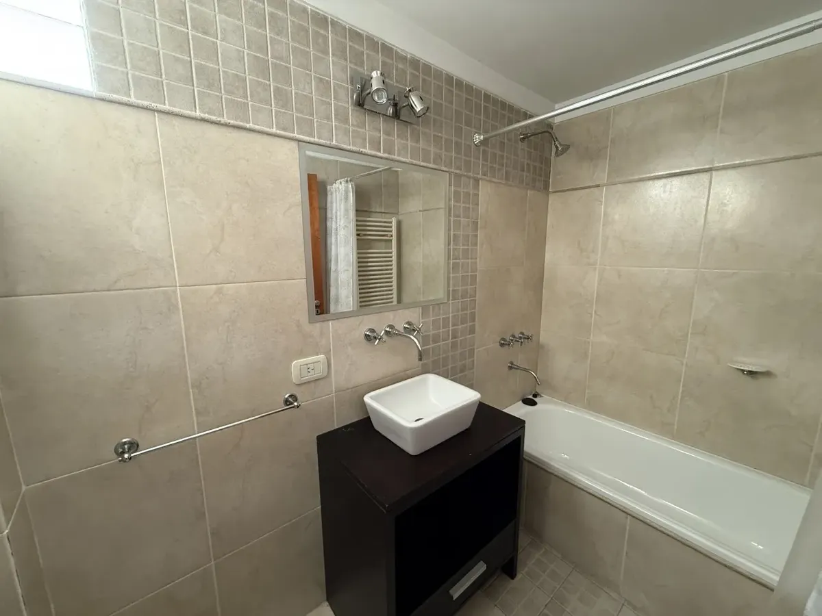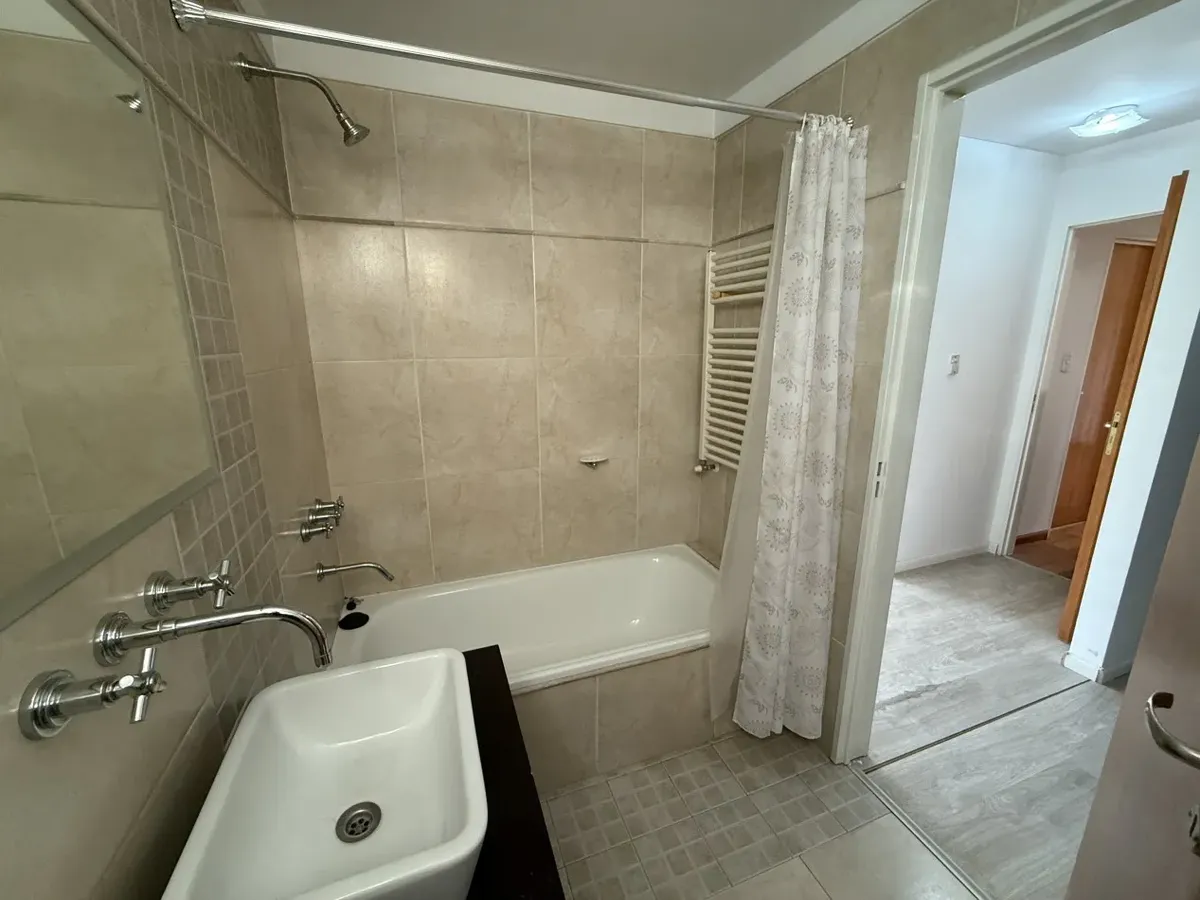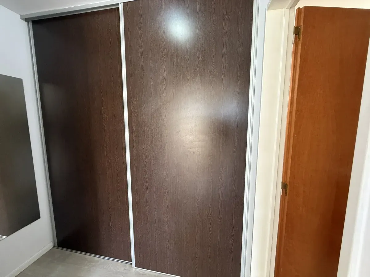 Three-room apartment with 2 bedrooms, 1 en suite with dressing room, and a separate reception bathroom. The living-dining room has parquet floors and opens to a balcony; the kitchen is semi-integrated. The building has a lift and a rooftop with a solarium and grill, with radiators throughout and a split air-conditioning unit in the living room. Pets are not accepted. Rental term is 24 months with adjustments by IPC.