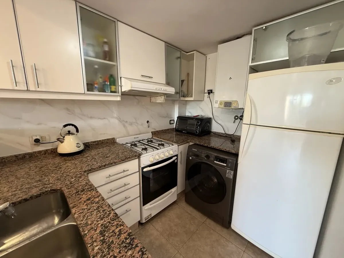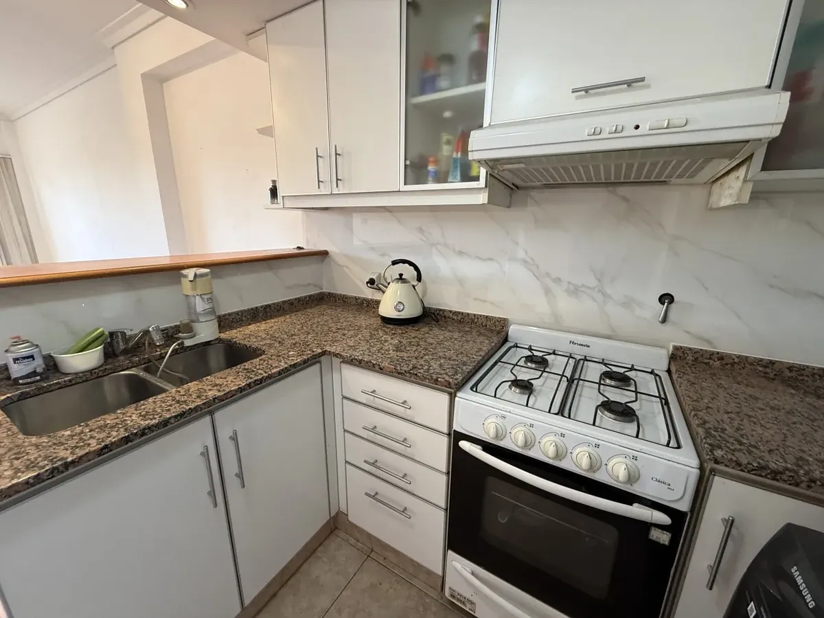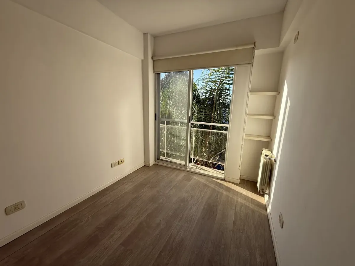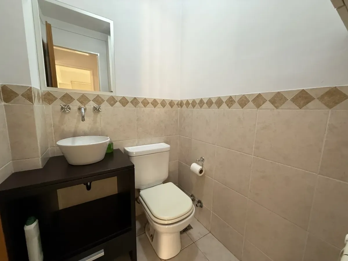 Three-room apartment with 2 bedrooms, 1 en suite with dressing room, and a separate reception bathroom. The living-dining room has parquet floors and opens to a balcony; the kitchen is semi-integrated. The building has a lift and a rooftop with a solarium and grill, with radiators throughout and a split air-conditioning unit in the living room. Pets are not accepted. Rental term is 24 months with adjustments by IPC.