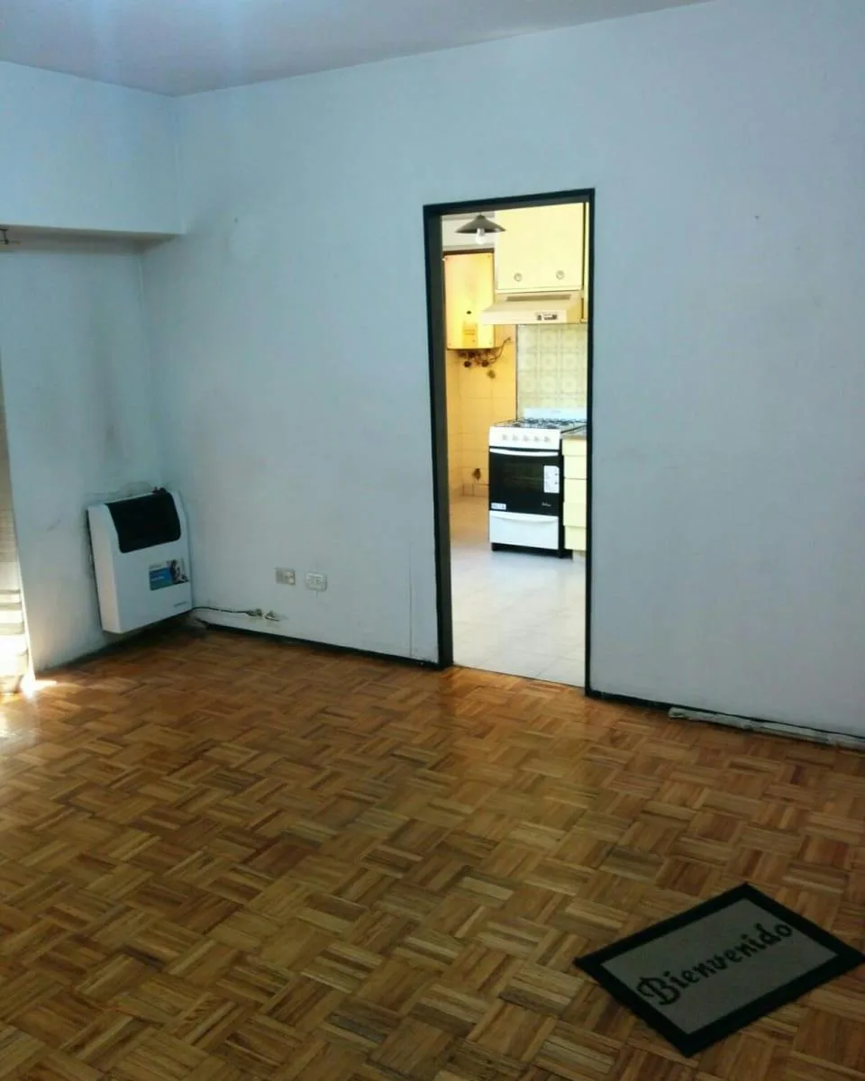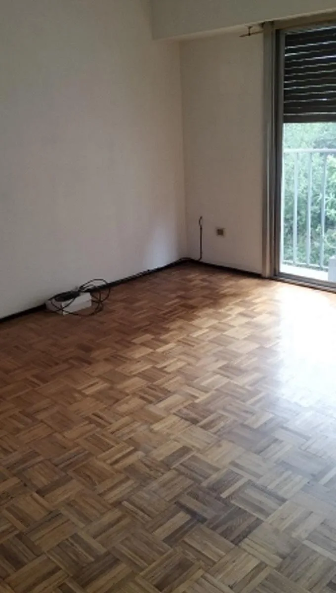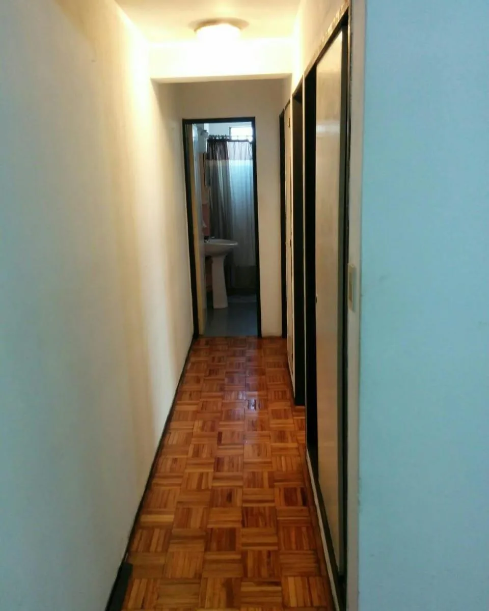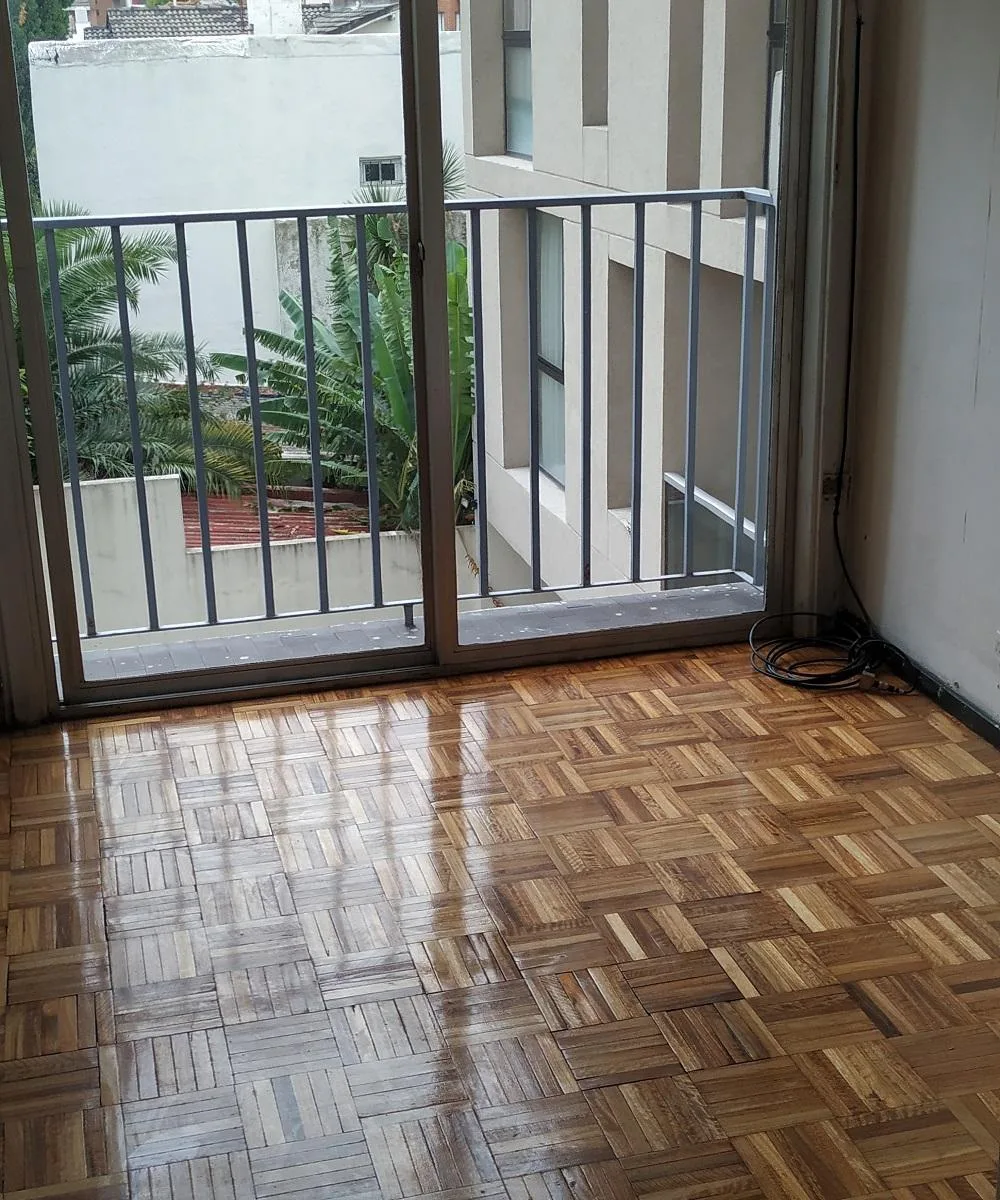 Three-room apartment in central Ramos Mejía, side-facing, with all rooms exterior. Living-dining room has parquet floors with 4.00x4.50 dimensions and a French balcony; separate kitchen is 2.60x2.60 with ceramic tile flooring, plus a 1.20x1.20 laundry area. The main bedroom is 3.00x3.10 with ceramic tile floors, built-in full-wall wardrobes and a French balcony; the second bedroom is 3.40x2.20 with parquet floors and a French balcony. There is a hallway with additional closets and a full bathroo