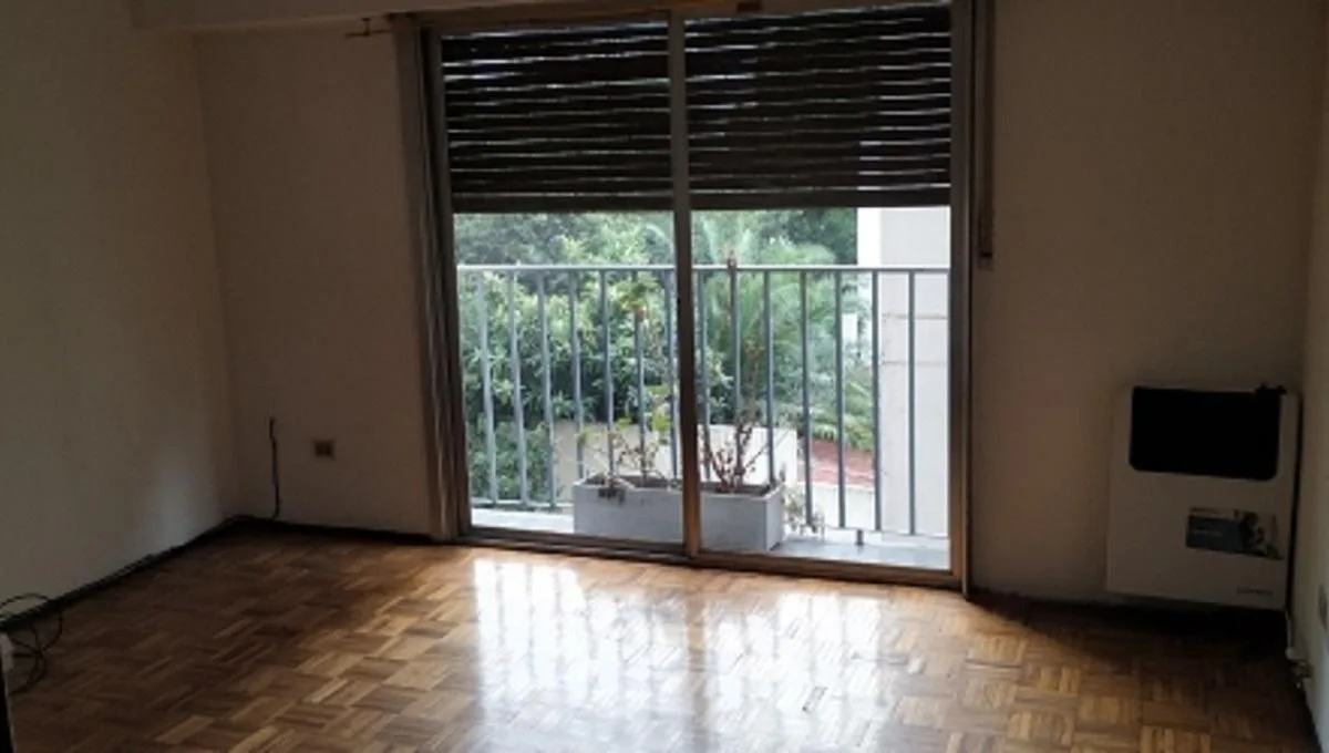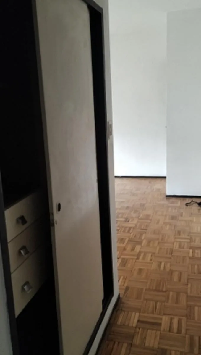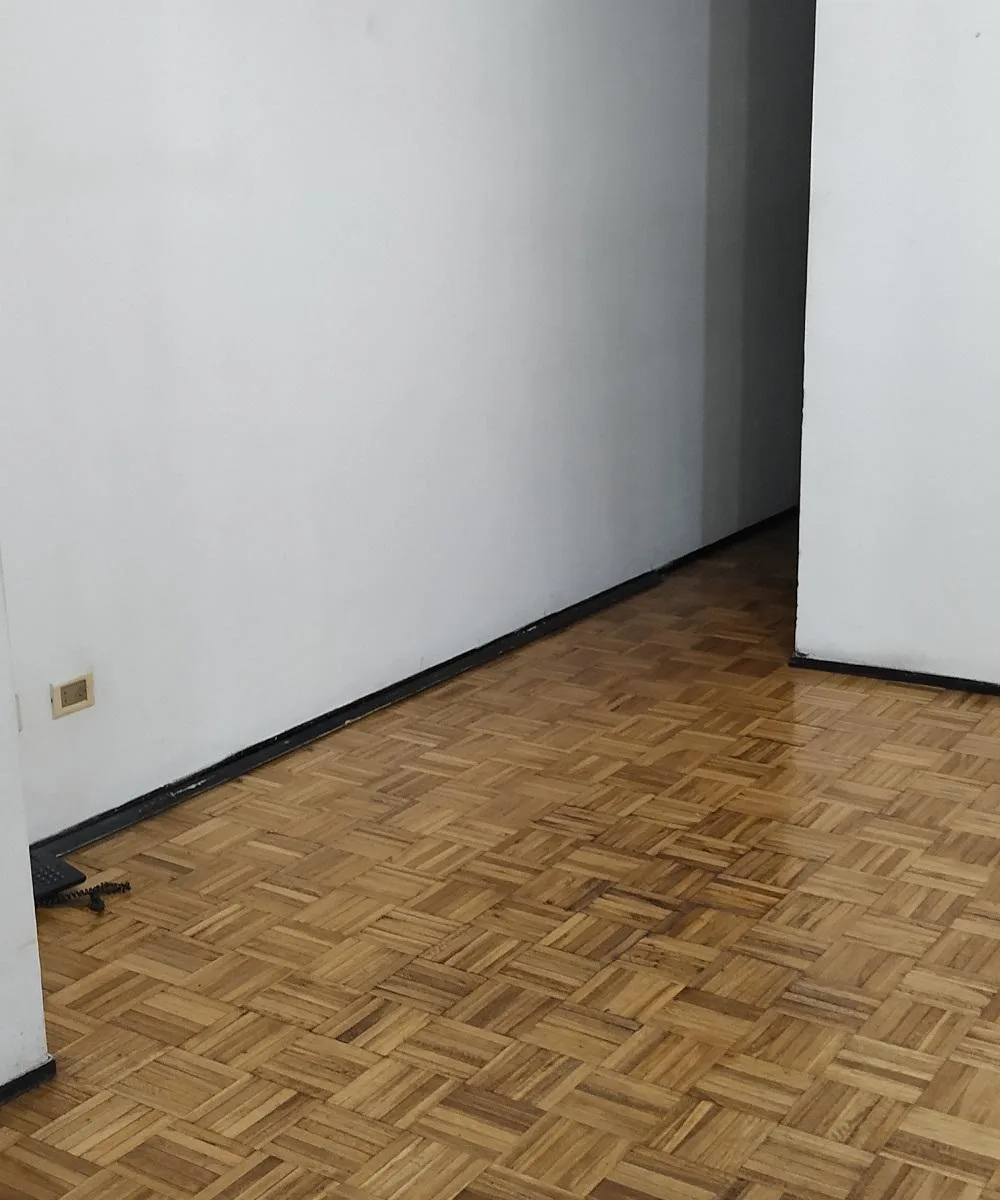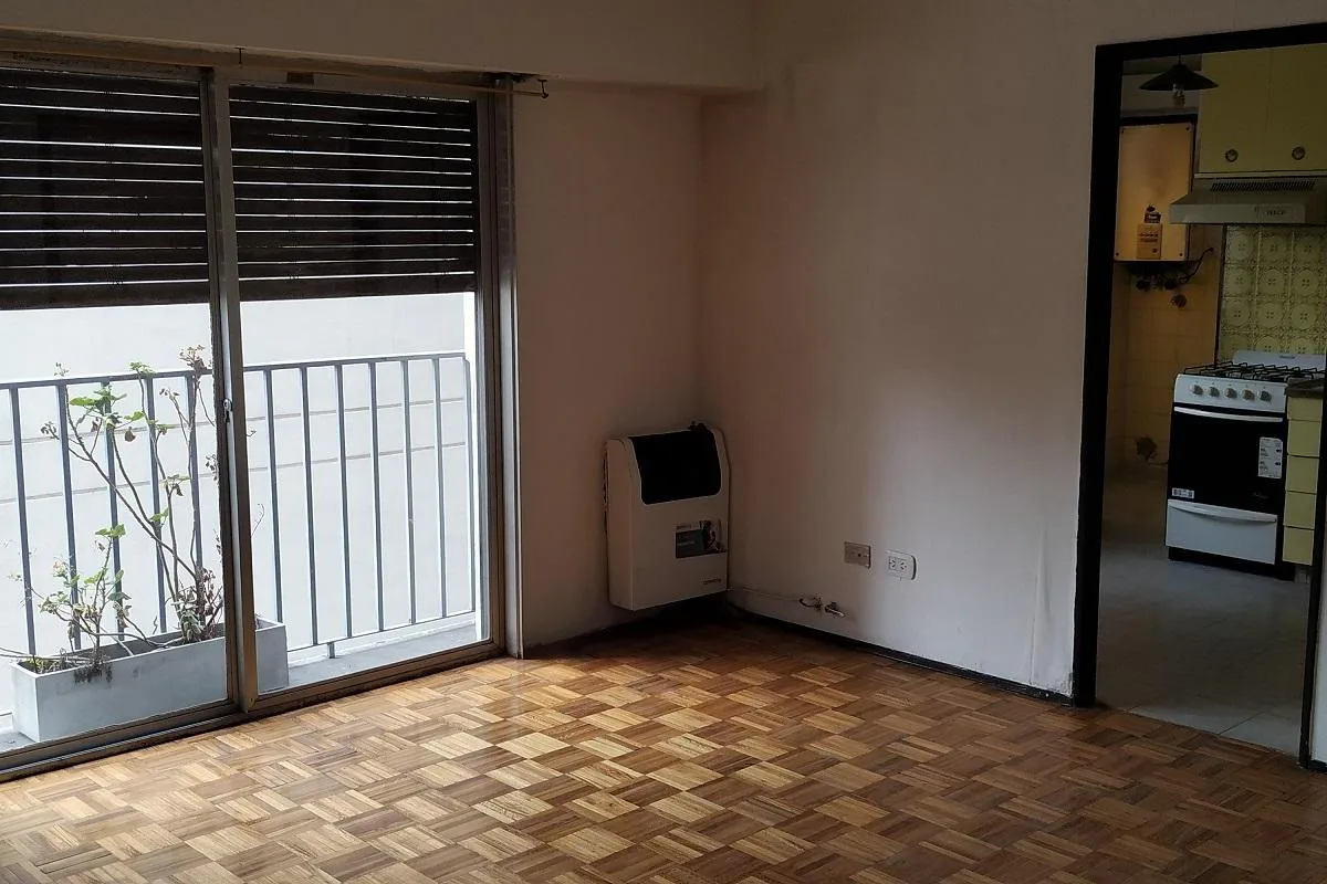 Three-room apartment in central Ramos Mejía, side-facing, with all rooms exterior. Living-dining room has parquet floors with 4.00x4.50 dimensions and a French balcony; separate kitchen is 2.60x2.60 with ceramic tile flooring, plus a 1.20x1.20 laundry area. The main bedroom is 3.00x3.10 with ceramic tile floors, built-in full-wall wardrobes and a French balcony; the second bedroom is 3.40x2.20 with parquet floors and a French balcony. There is a hallway with additional closets and a full bathroo