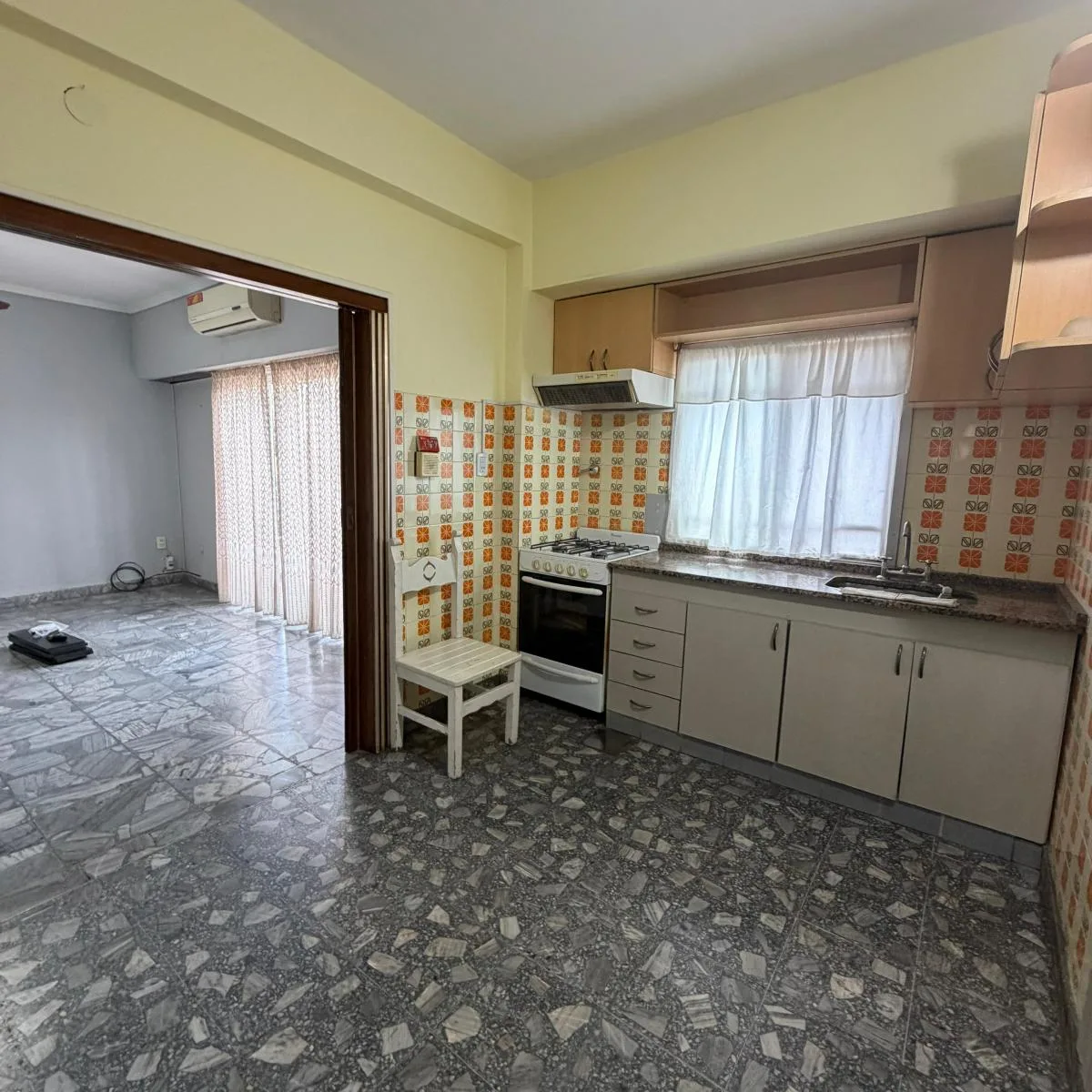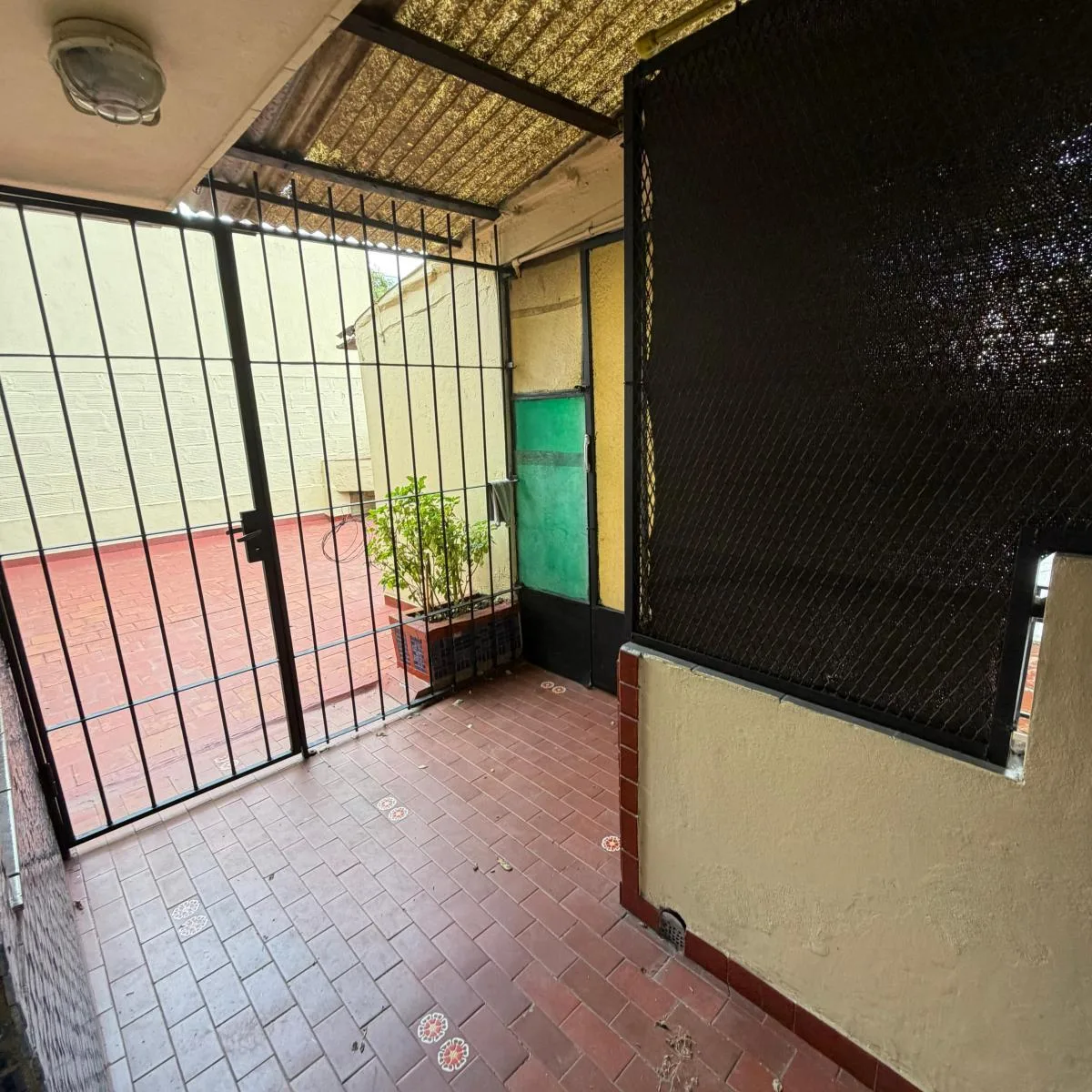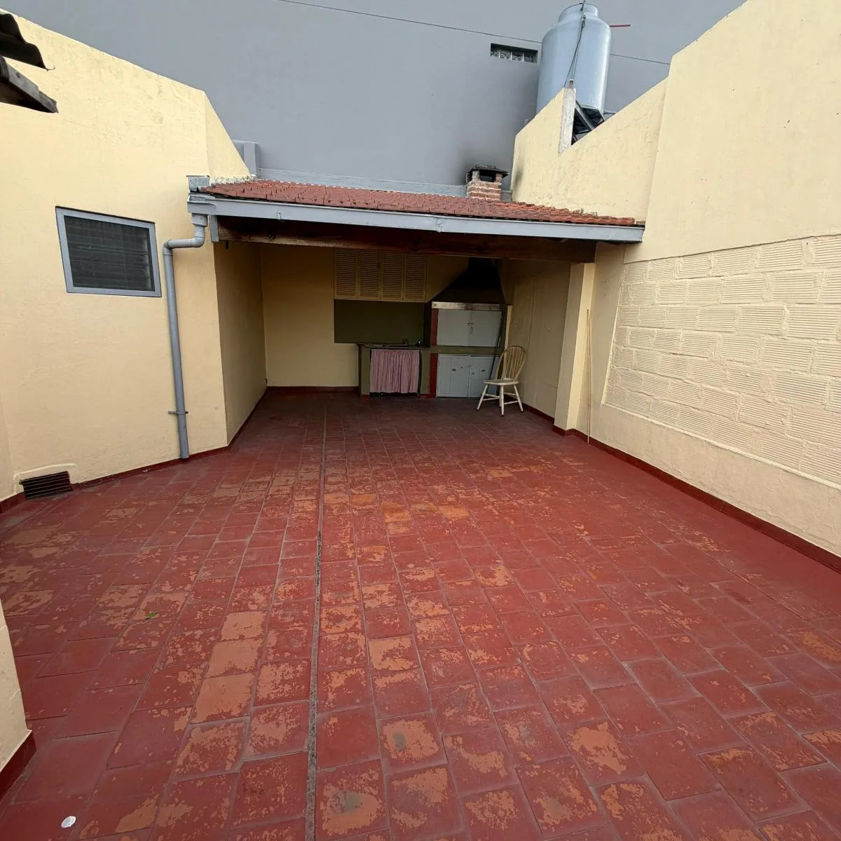 Ground-floor or upper unit with private entrance (PH) arranged as a house-style apartment with 3 rooms. It has a living-dining area with an integrated kitchen, a street-facing balcony, 2 bedrooms, a laundry area, and a patio with a grill. The unit was recently painted.
