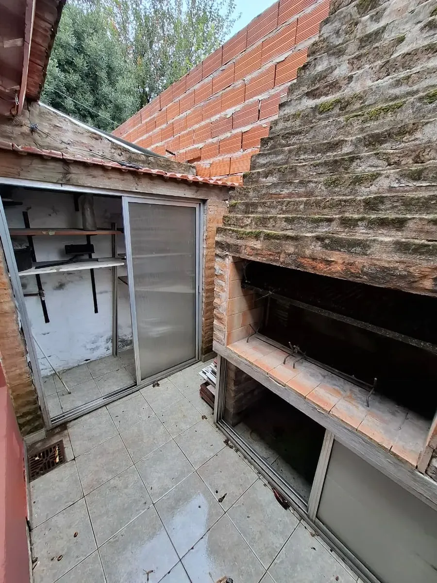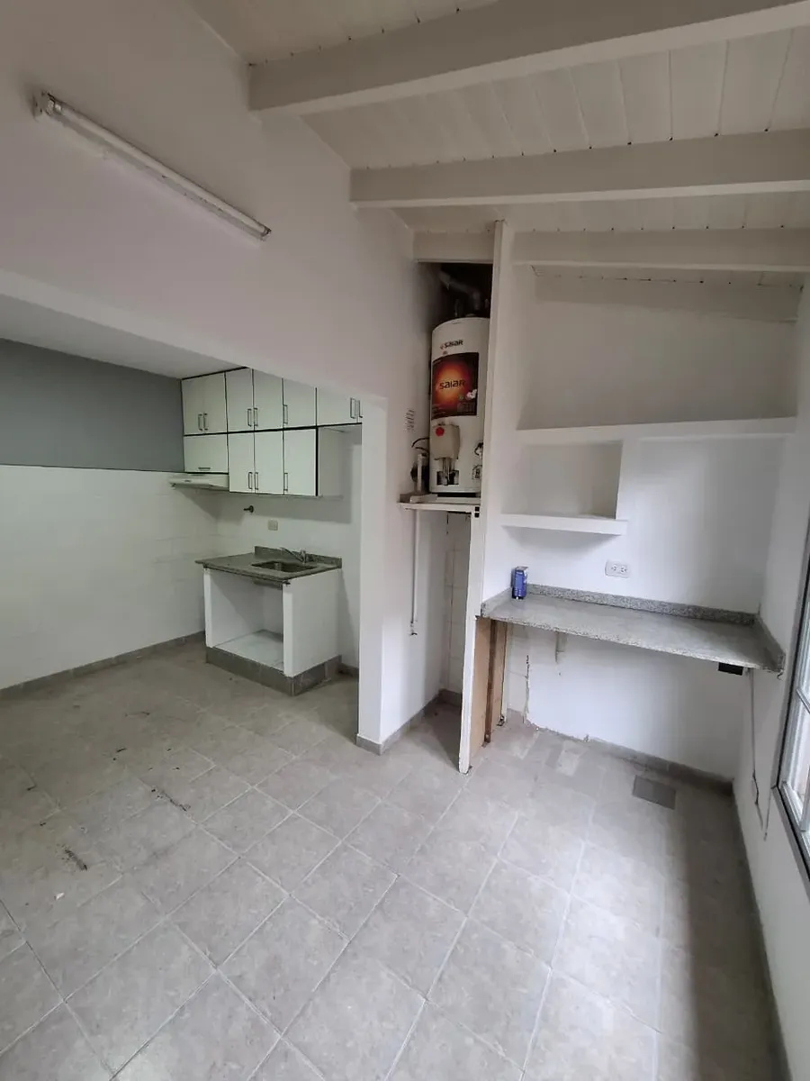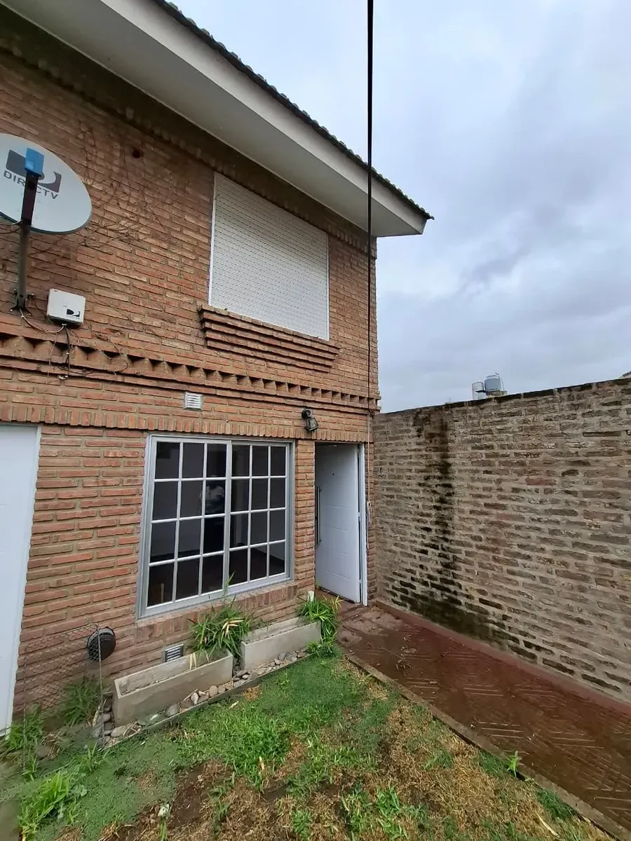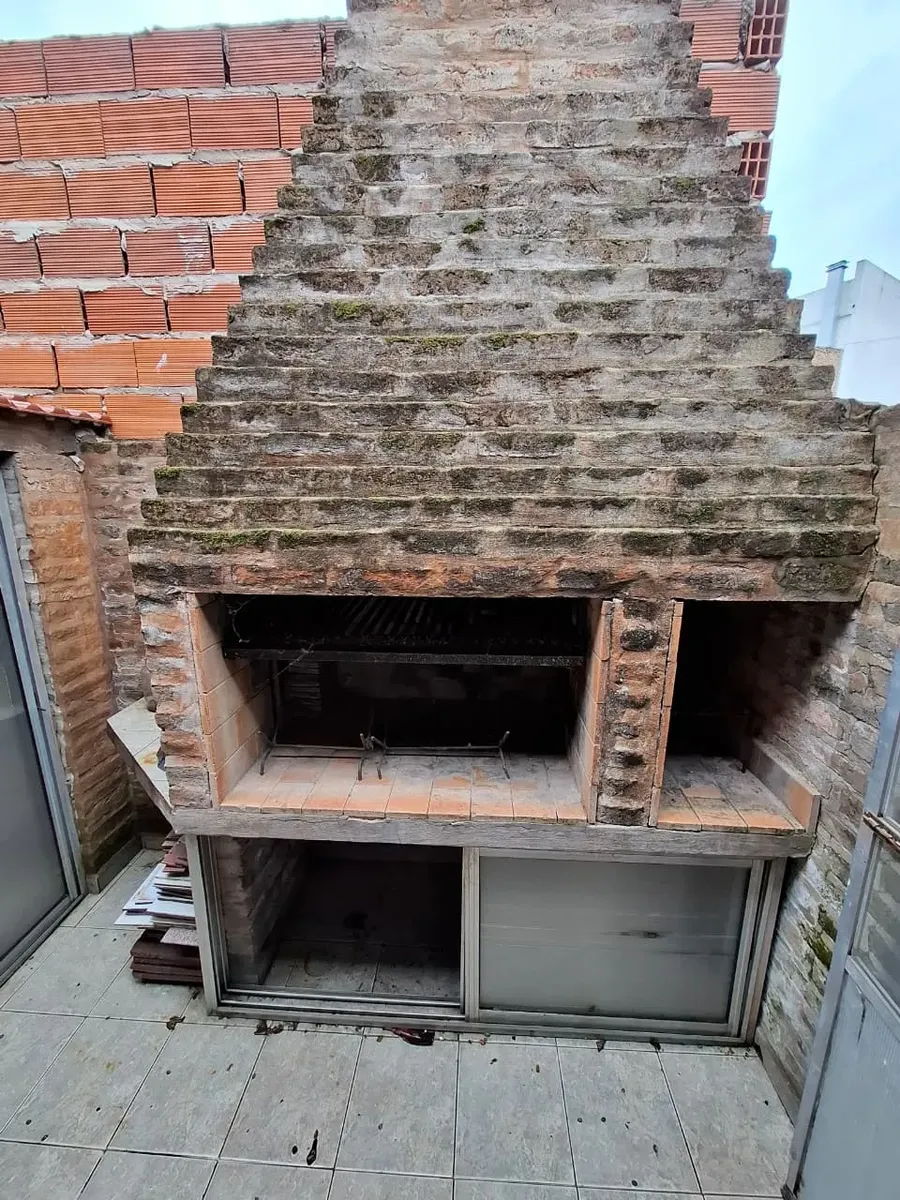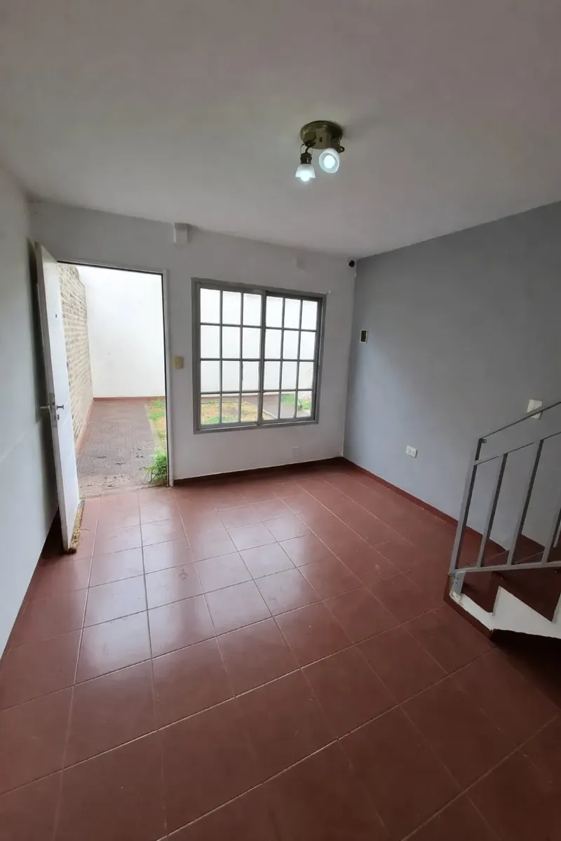 Duplex apartment with three rooms, courtyard-facing (contrafrente) in a property with three units on the same lot. Access is via a shared hallway. Ground floor includes a living room with a installed stove, a full bathroom with bathtub and a connection for a washing machine, and a kitchen with a dining area (no cooking appliance), plus a small patio with a grill and utility storage. Upstairs has 2 bedrooms with built-in wardrobes. No building fees (sin expensas).