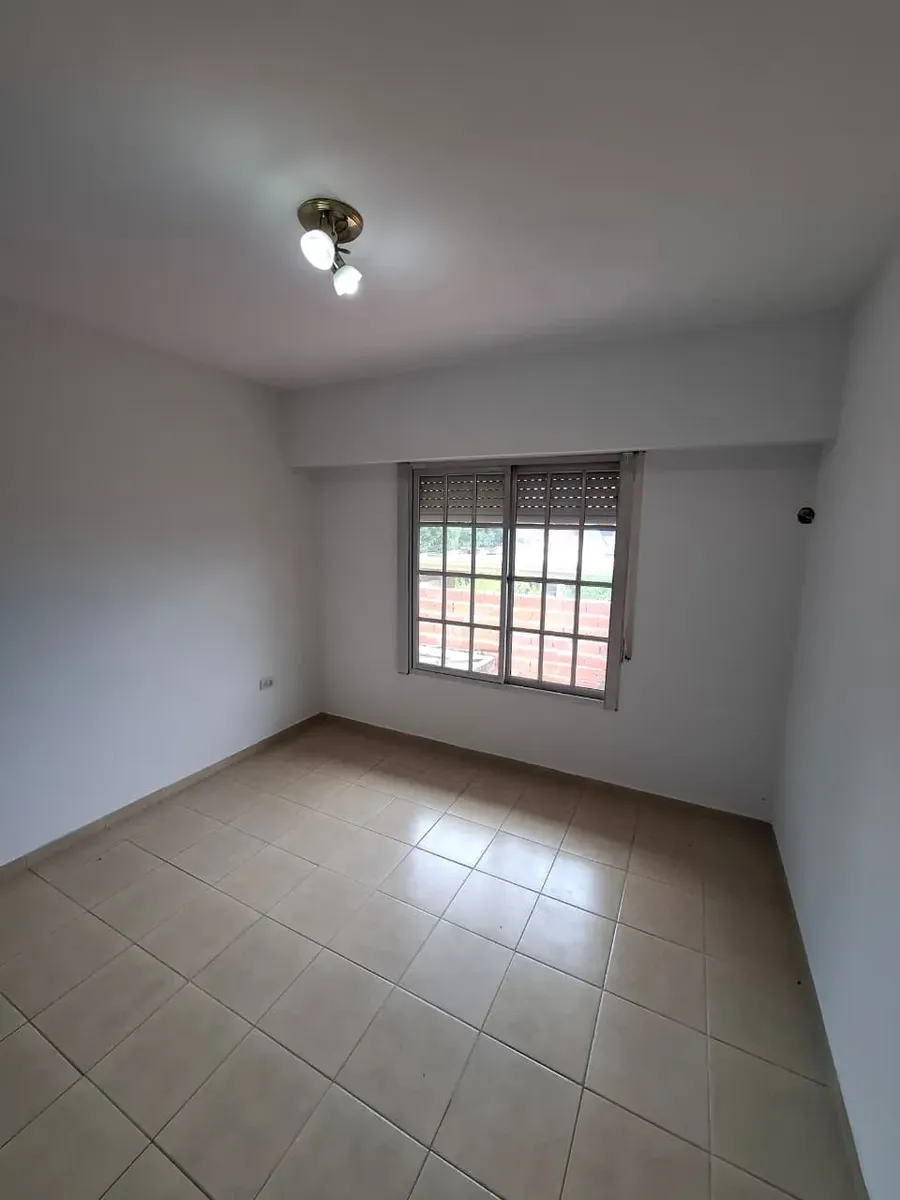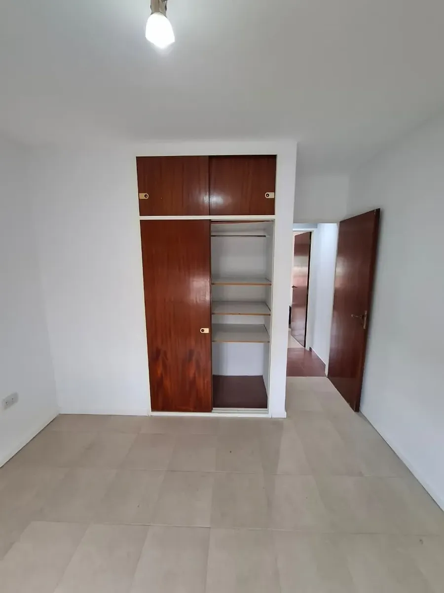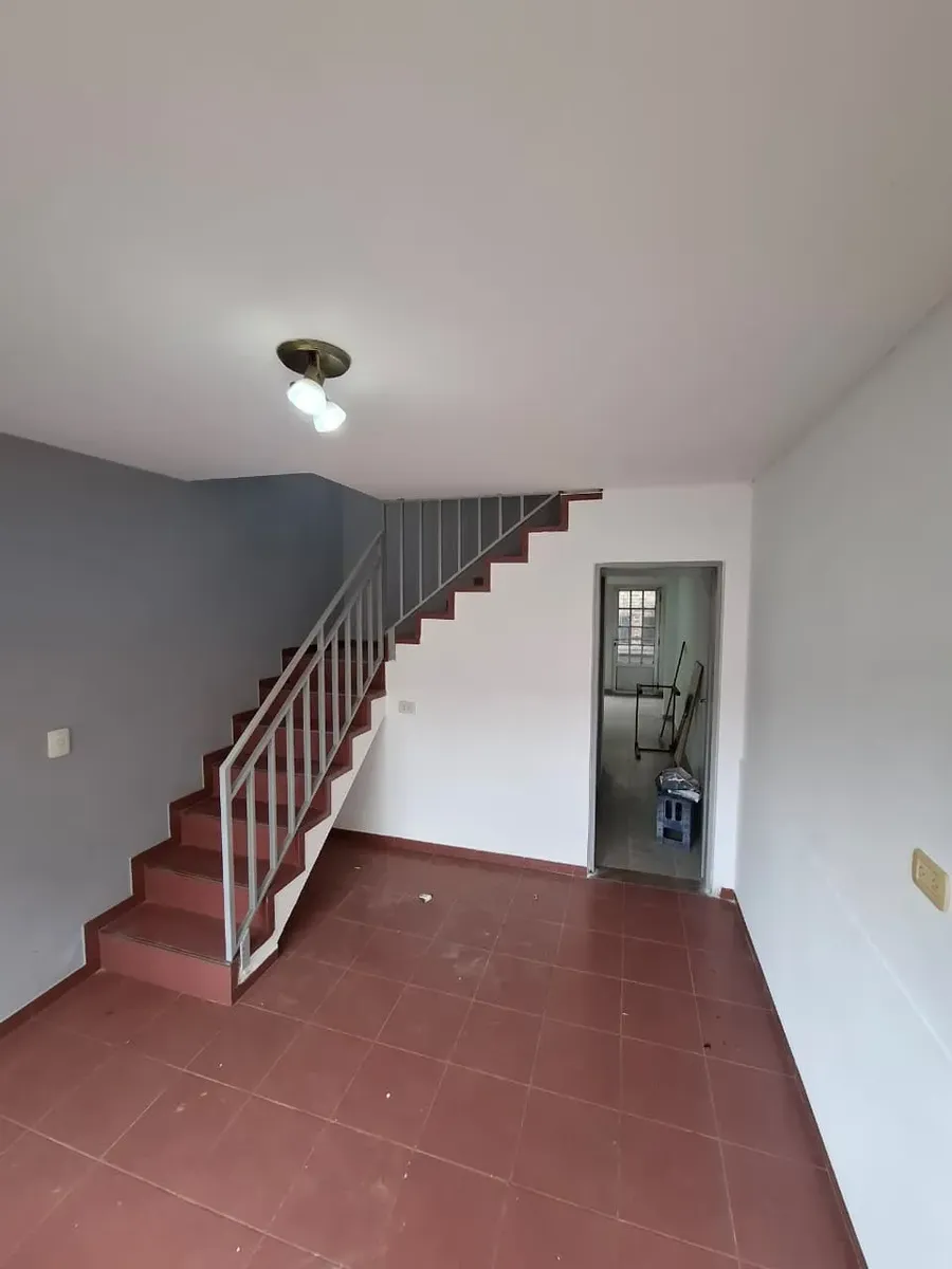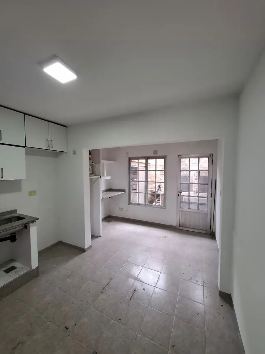 Duplex apartment with three rooms, courtyard-facing (contrafrente) in a property with three units on the same lot. Access is via a shared hallway. Ground floor includes a living room with a installed stove, a full bathroom with bathtub and a connection for a washing machine, and a kitchen with a dining area (no cooking appliance), plus a small patio with a grill and utility storage. Upstairs has 2 bedrooms with built-in wardrobes. No building fees (sin expensas).