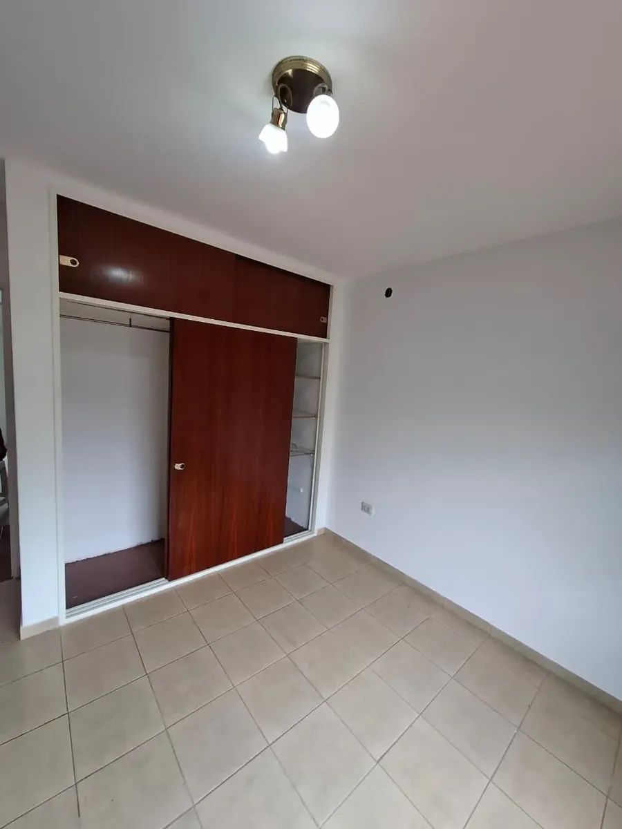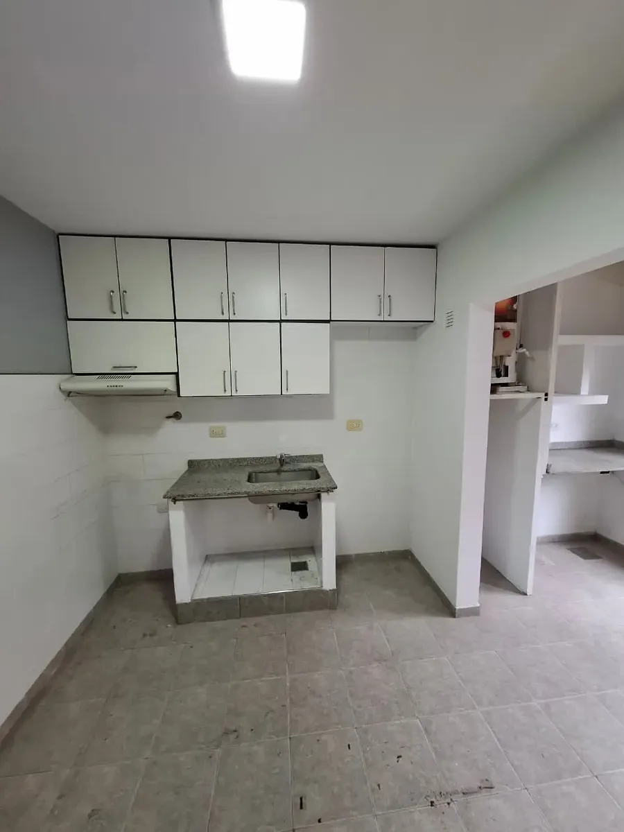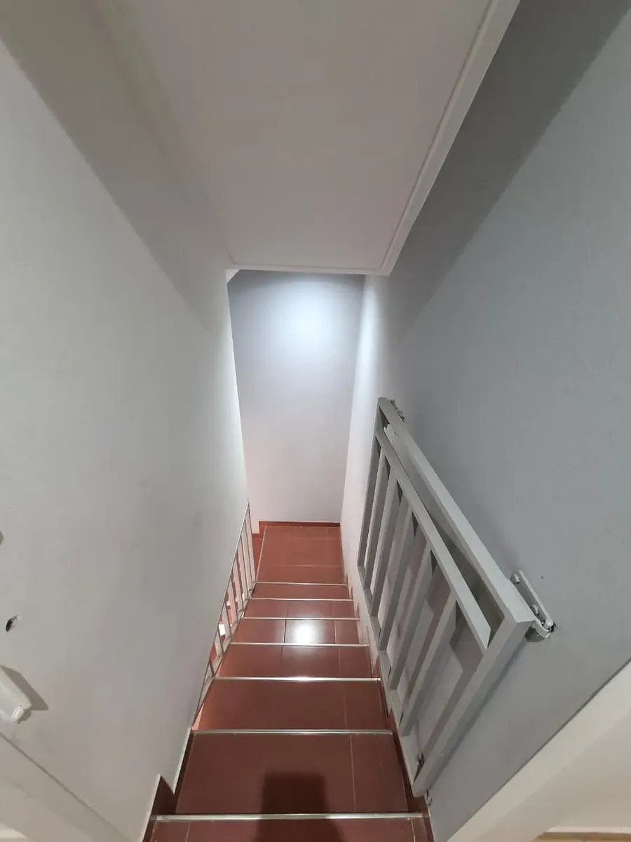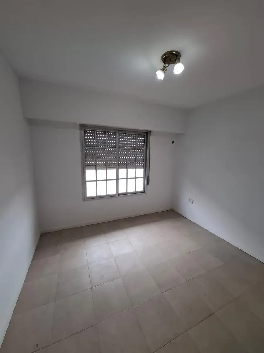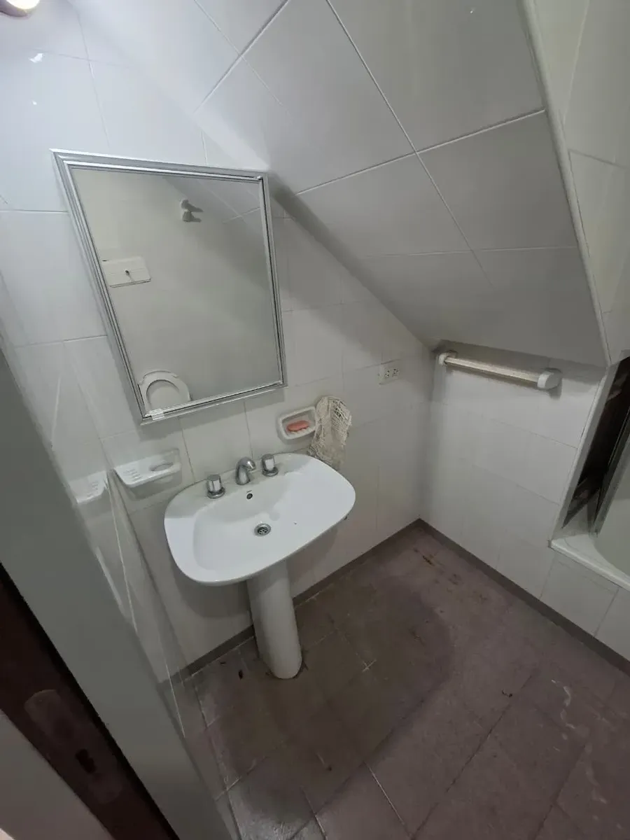 Duplex apartment with three rooms, courtyard-facing (contrafrente) in a property with three units on the same lot. Access is via a shared hallway. Ground floor includes a living room with a installed stove, a full bathroom with bathtub and a connection for a washing machine, and a kitchen with a dining area (no cooking appliance), plus a small patio with a grill and utility storage. Upstairs has 2 bedrooms with built-in wardrobes. No building fees (sin expensas).