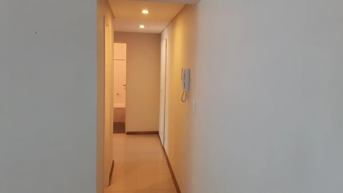 Apartment with 2 bedrooms. It has a living-dining room at the back with a balcony, a semi-separated kitchen with a laundry area, and a full bathroom with a bath tub. The unit includes two air-conditioning units (hot and cold) and an assigned parking space.