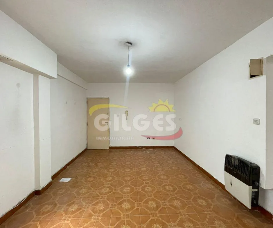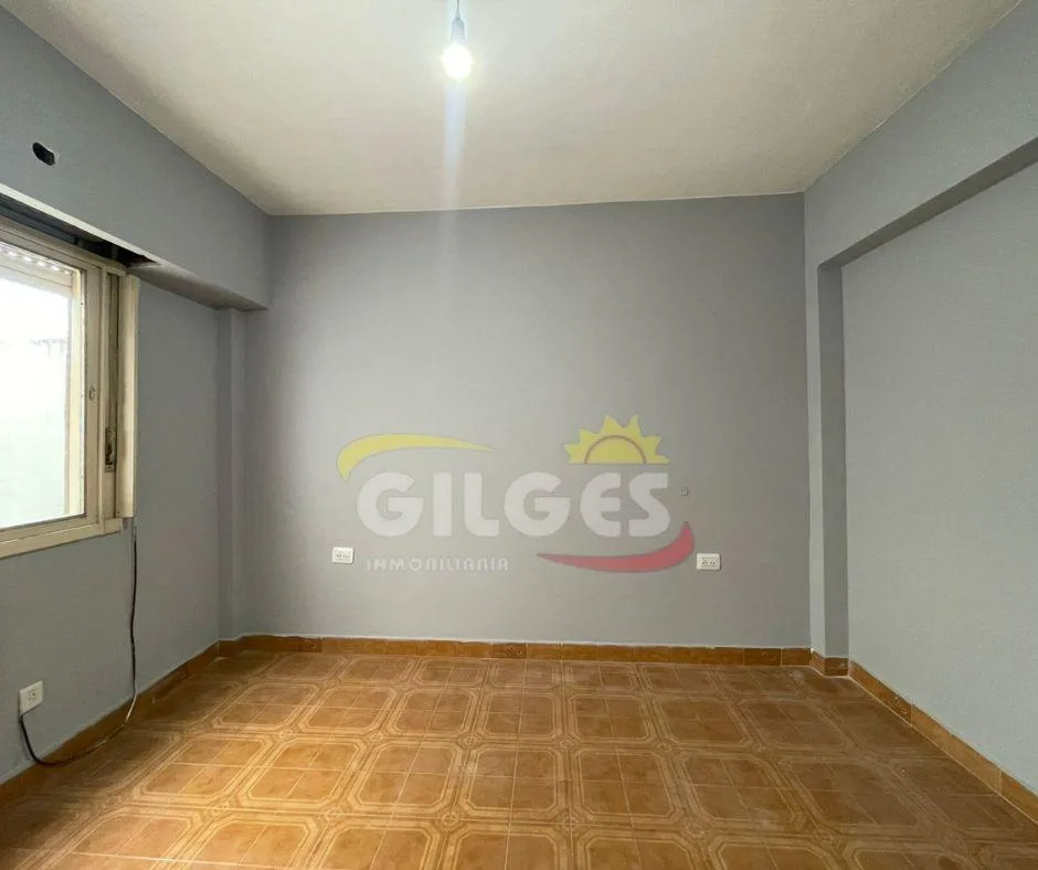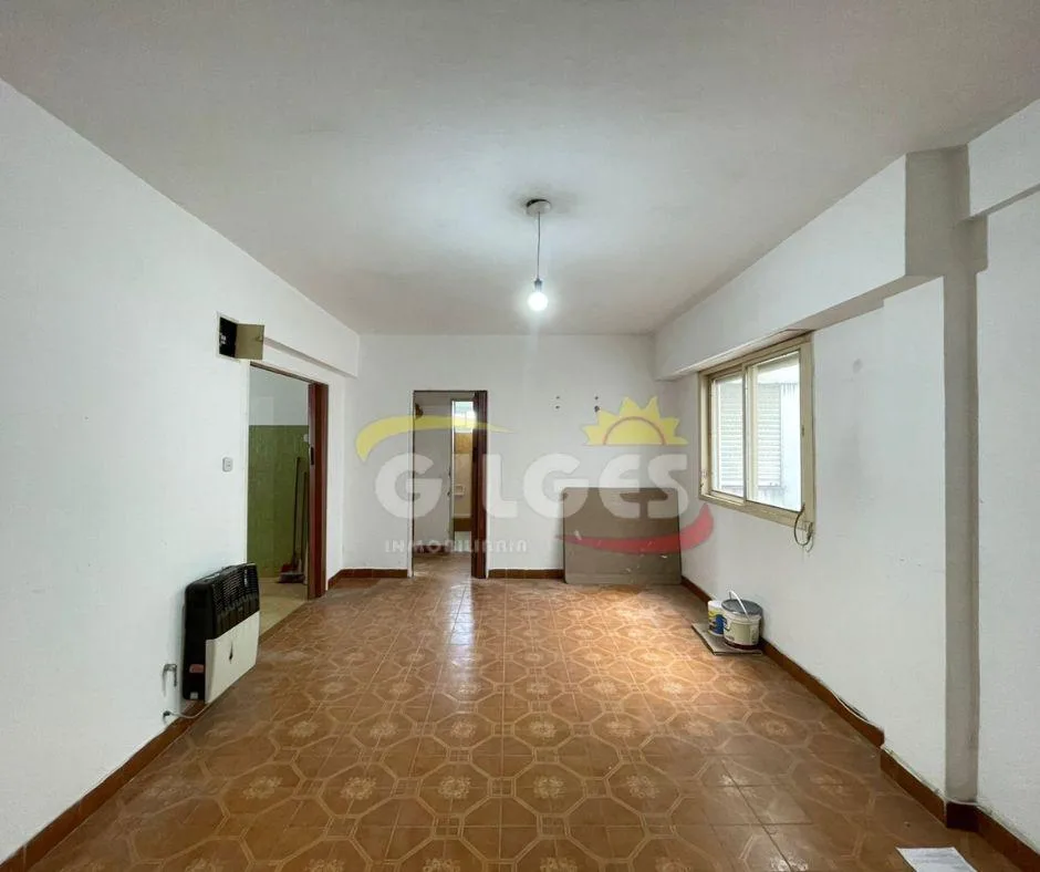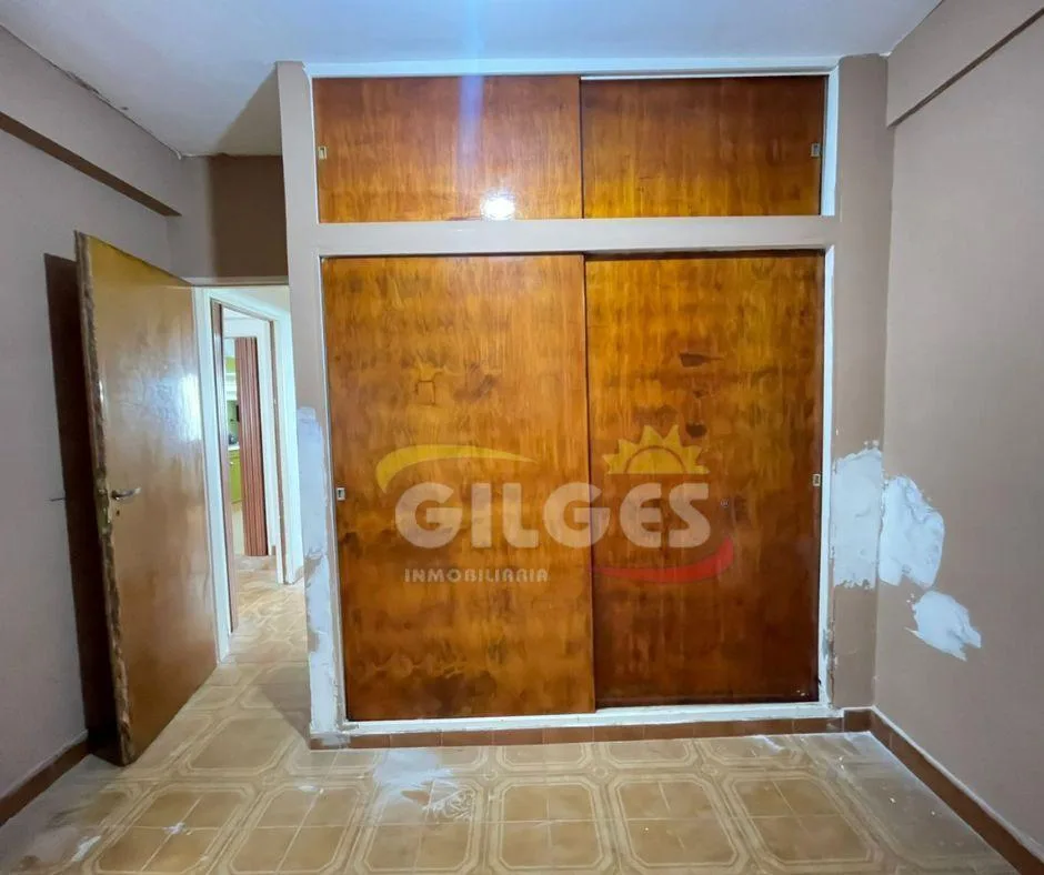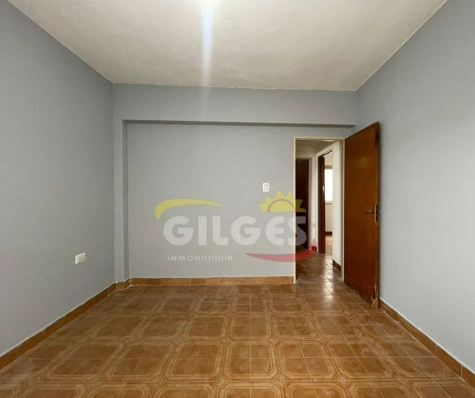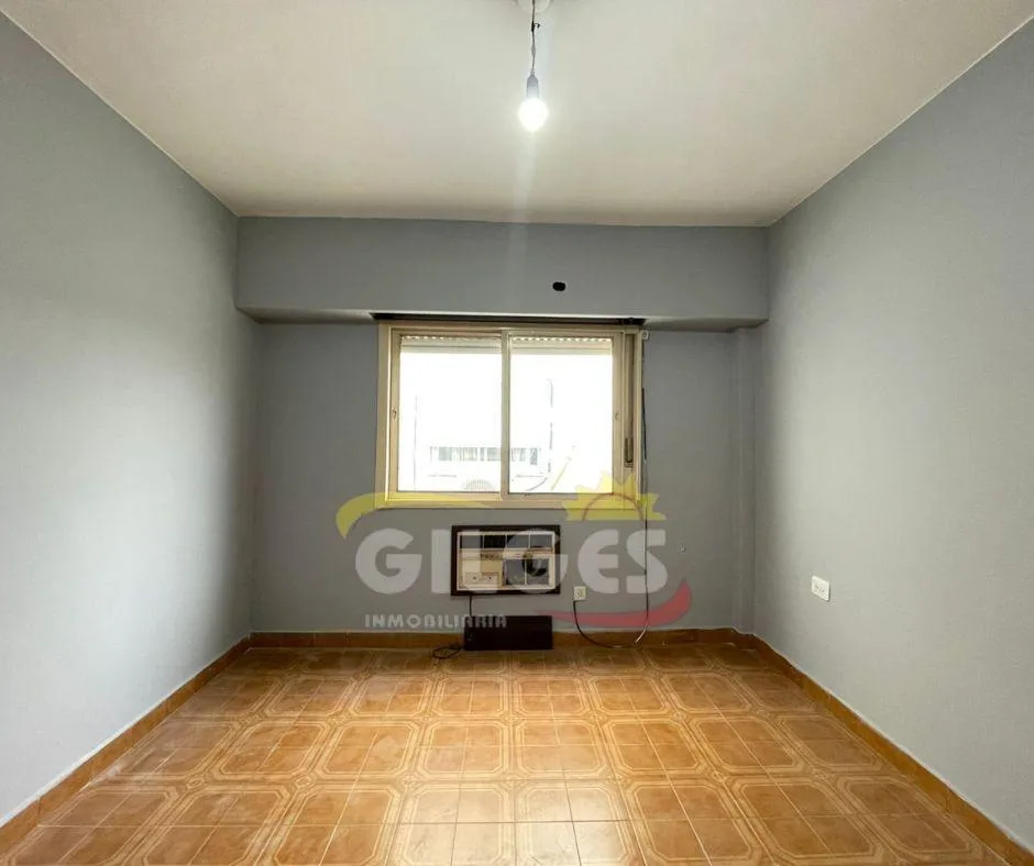 Three-room apartment for rent in Ramos Mejía with a living-dining area, separate, fully equipped kitchen, and a distribution hall. It has 2 bedrooms, one with a built-in wardrobe, a full bathroom, and an assigned parking space. Building fees (expensas) are stated as subject to verification and potential adjustment.