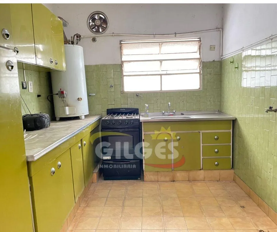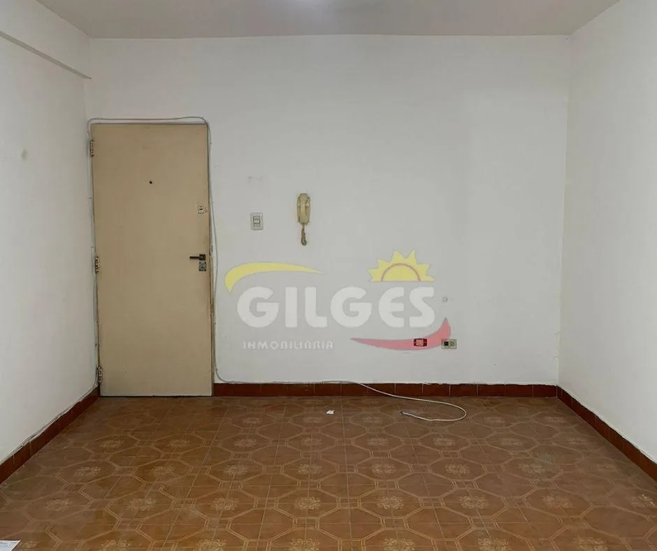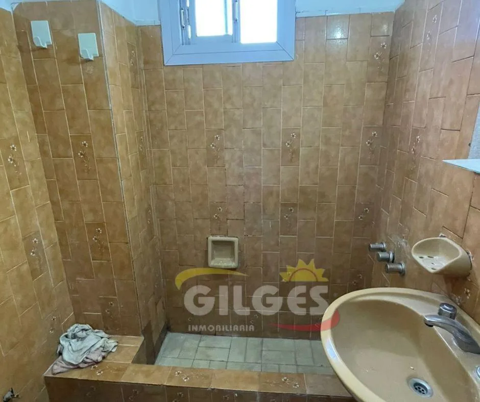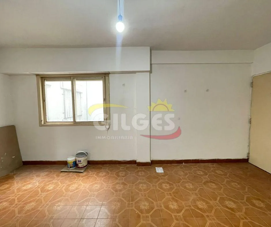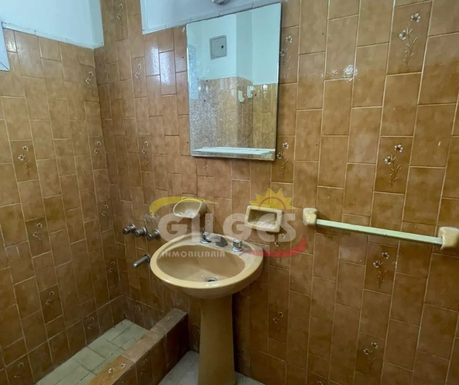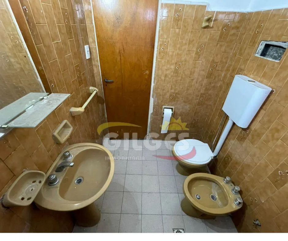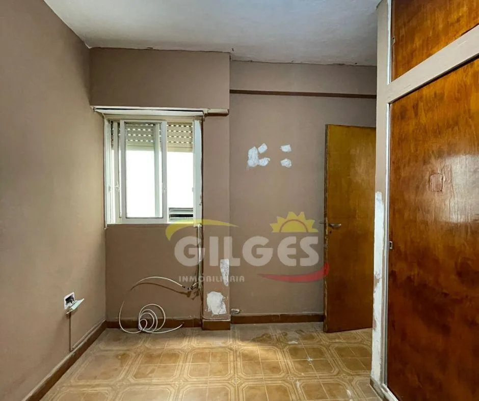 Three-room apartment for rent in Ramos Mejía with a living-dining area, separate, fully equipped kitchen, and a distribution hall. It has 2 bedrooms, one with a built-in wardrobe, a full bathroom, and an assigned parking space. Building fees (expensas) are stated as subject to verification and potential adjustment.