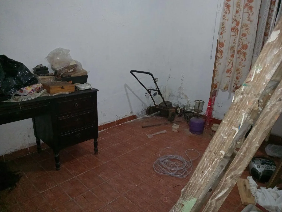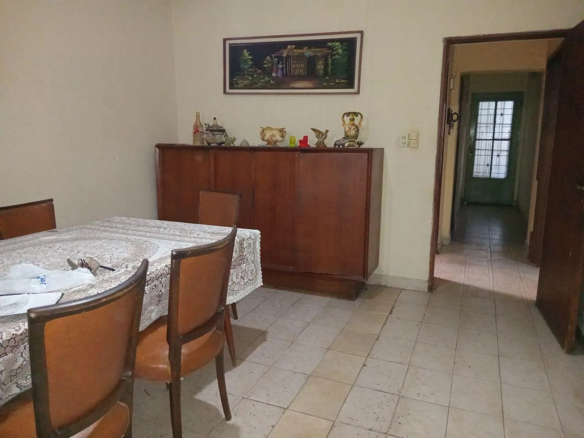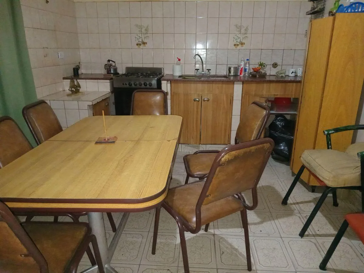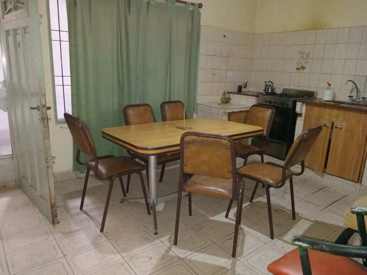 Rental of a three-room house in PH in Gonzalez Catan, at Juan Pio Gana 4000, near the corner of Maestra Concepción Valle, with 2 bedrooms. The layout includes an entrance hall shared with the adjacent unit, a large living-dining room with a heater, a daily eat-in kitchen with a heater, a distribution corridor, a full bathroom with shower, two bedrooms, and a covered laundry area. Parking consists of a covered through garage for 3 cars, plus a utility storage room and a covered gallery, with an o