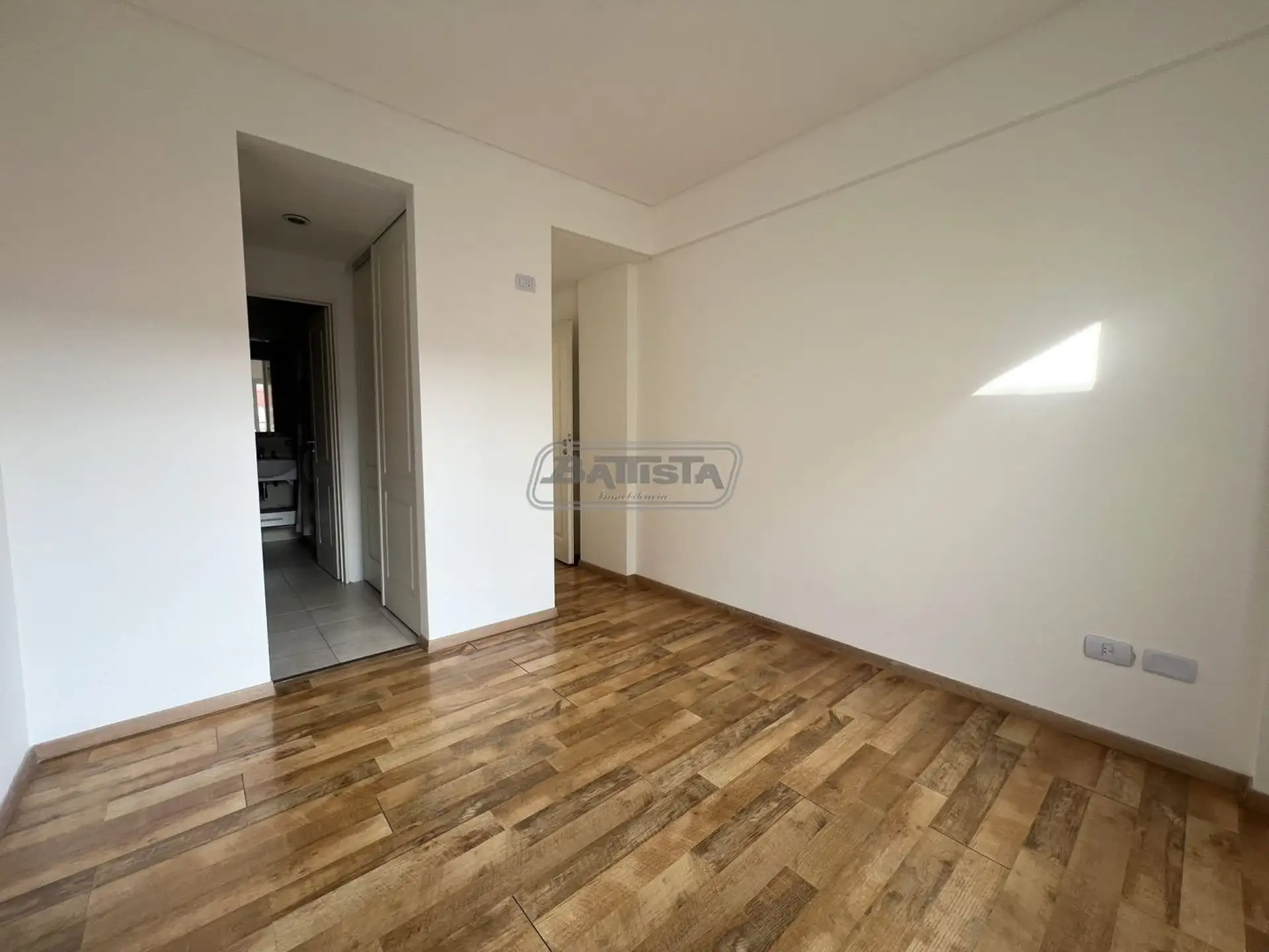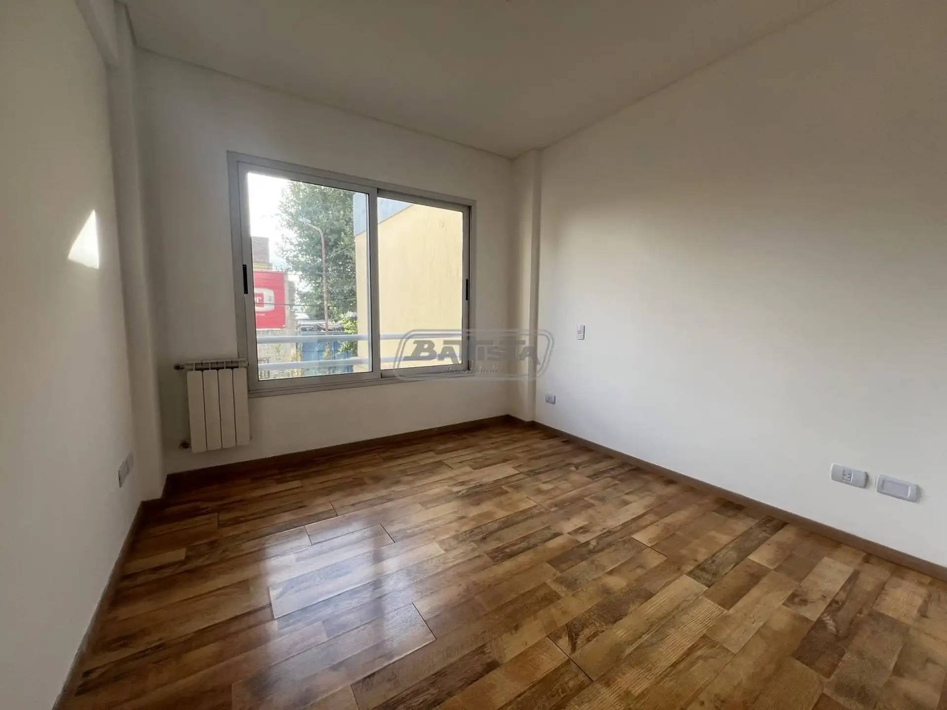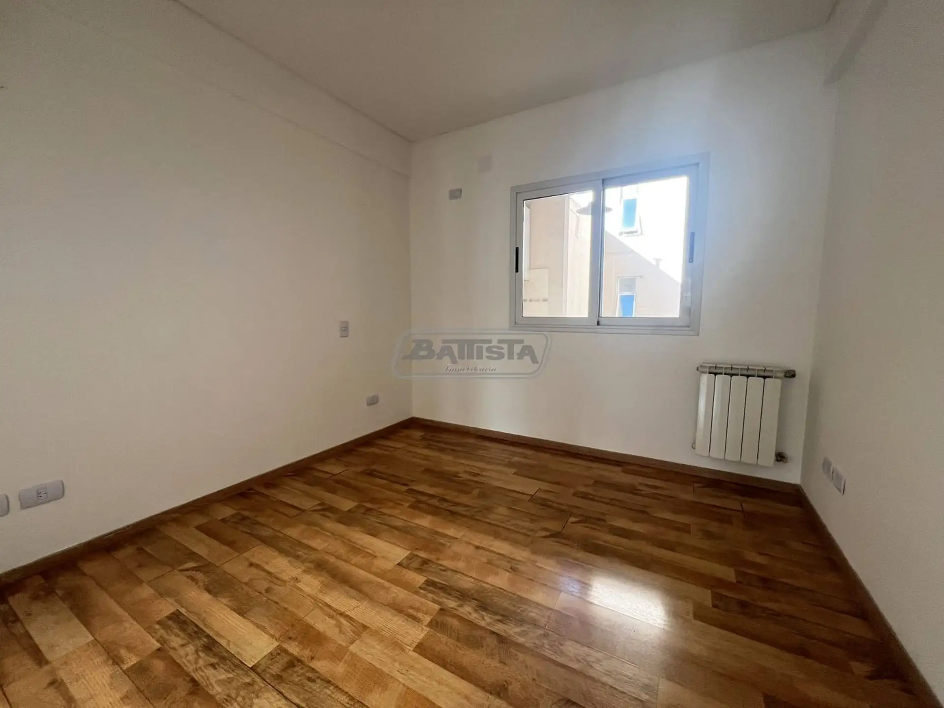 Three-room apartment in San Justo (La Matanza), street-facing. Living-dining room with balcony, separate kitchen with an external laundry area, and a suite with dressing room. The unit also has a full bathroom and a bedroom with built-in wardrobe, with central heating.