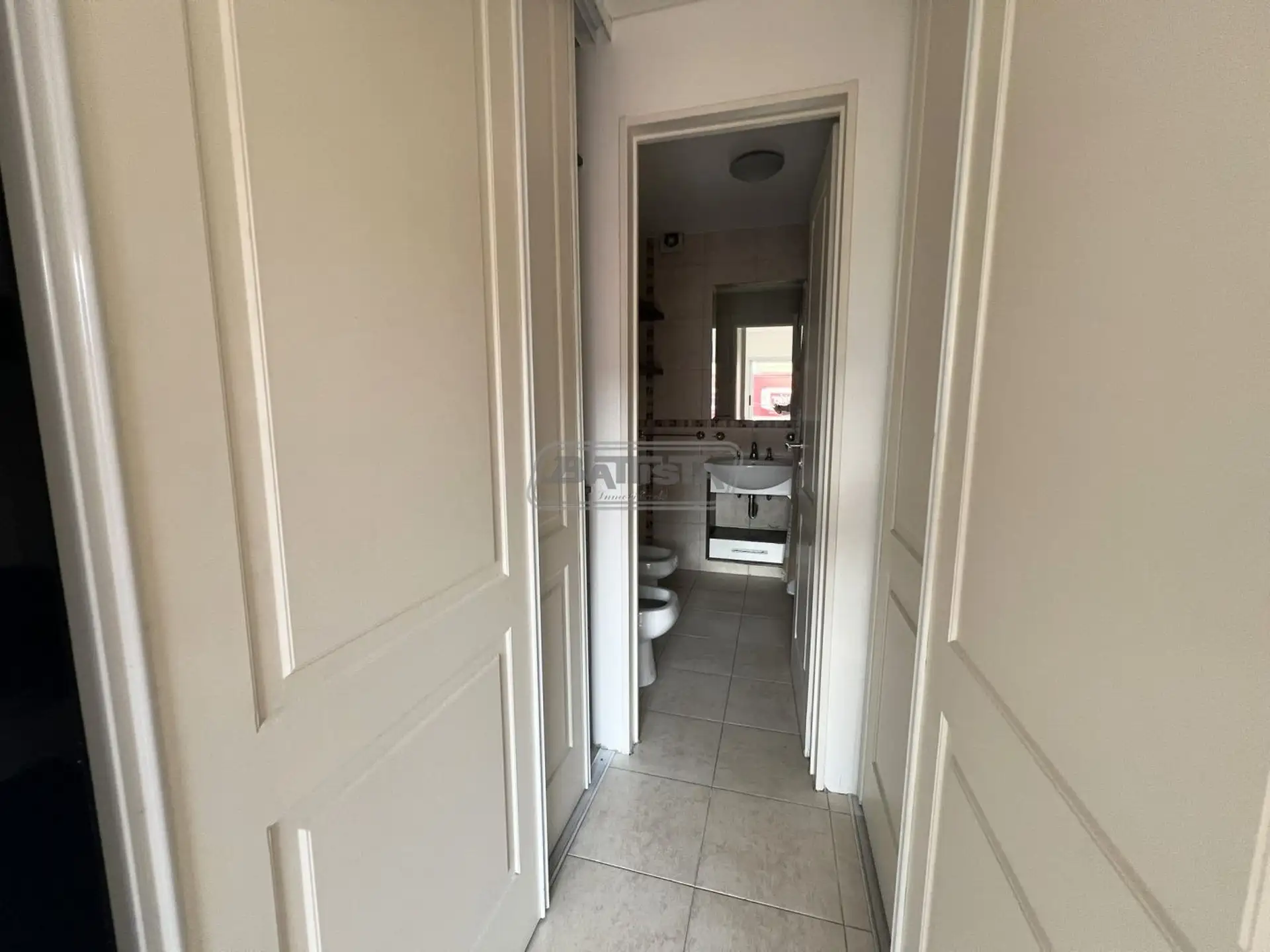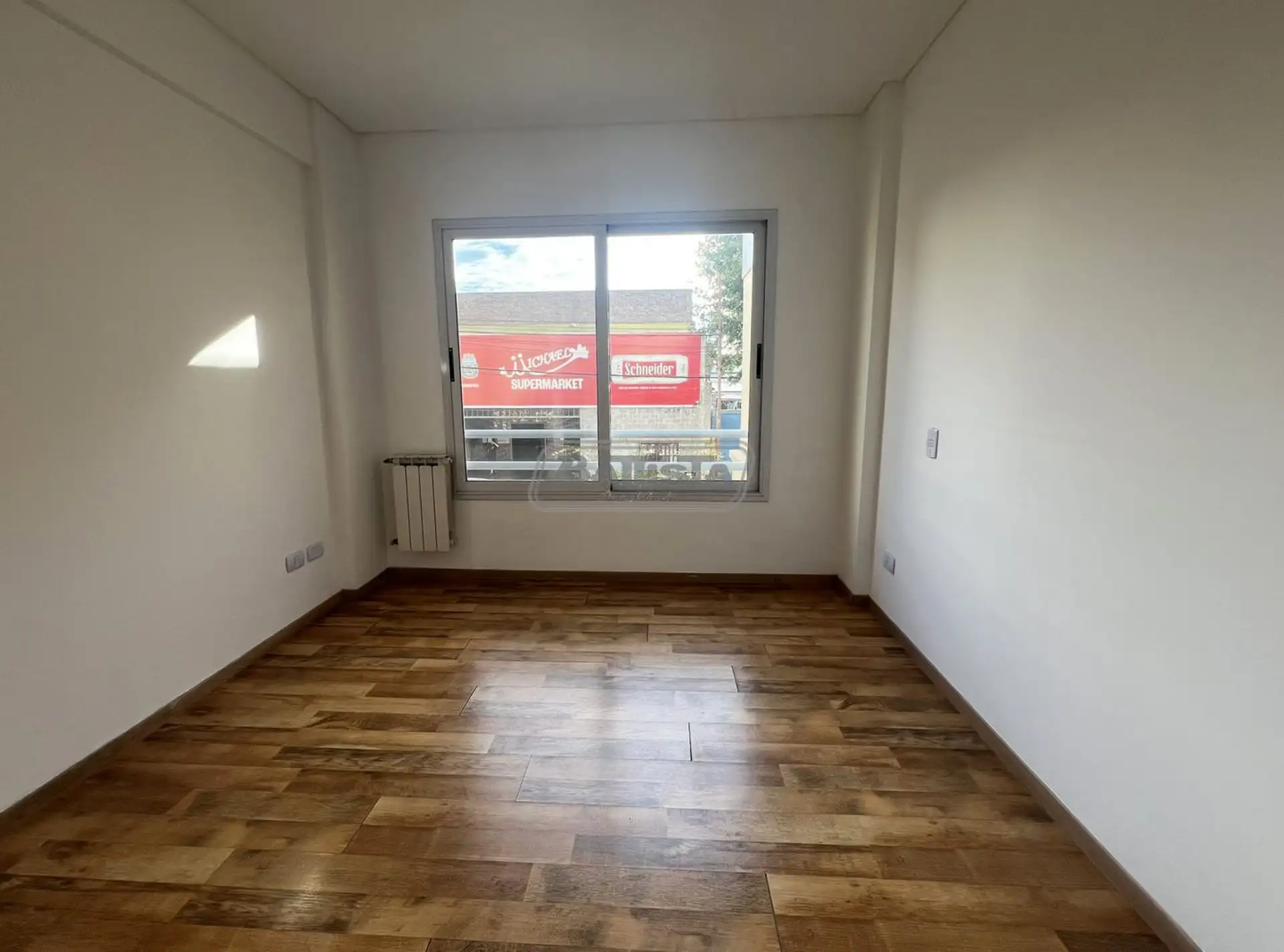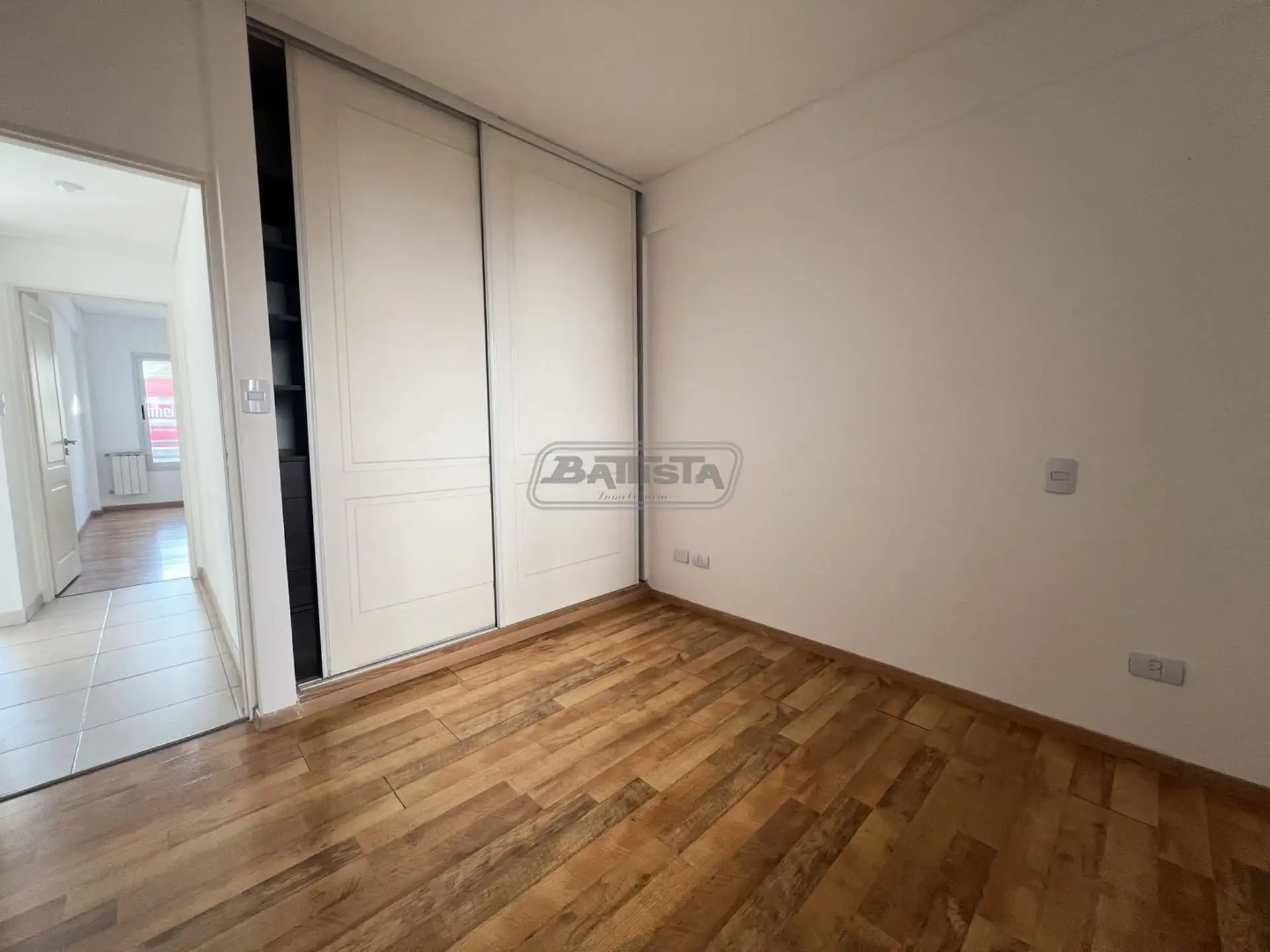 Three-room apartment in San Justo (La Matanza), street-facing. Living-dining room with balcony, separate kitchen with an external laundry area, and a suite with dressing room. The unit also has a full bathroom and a bedroom with built-in wardrobe, with central heating.