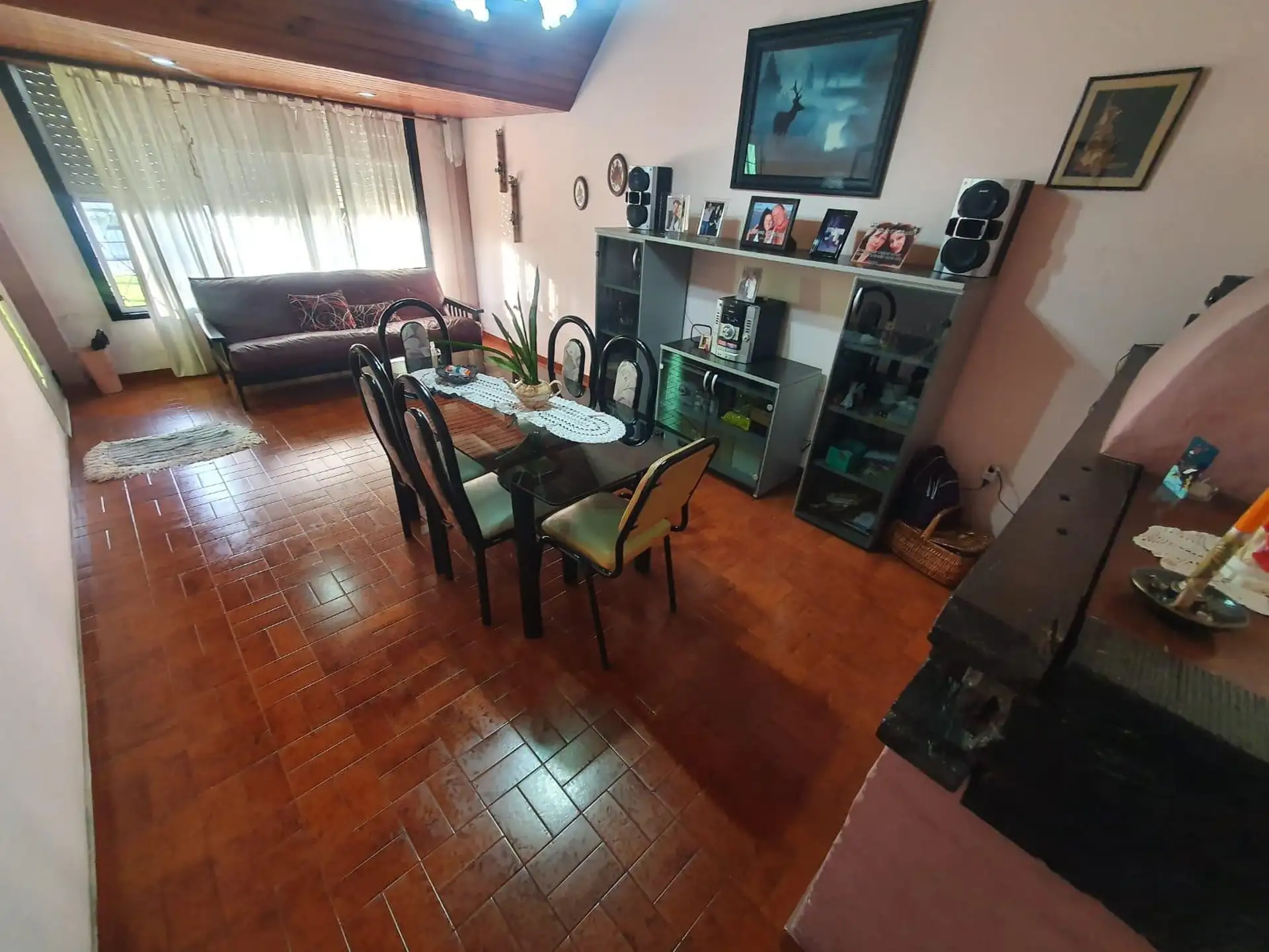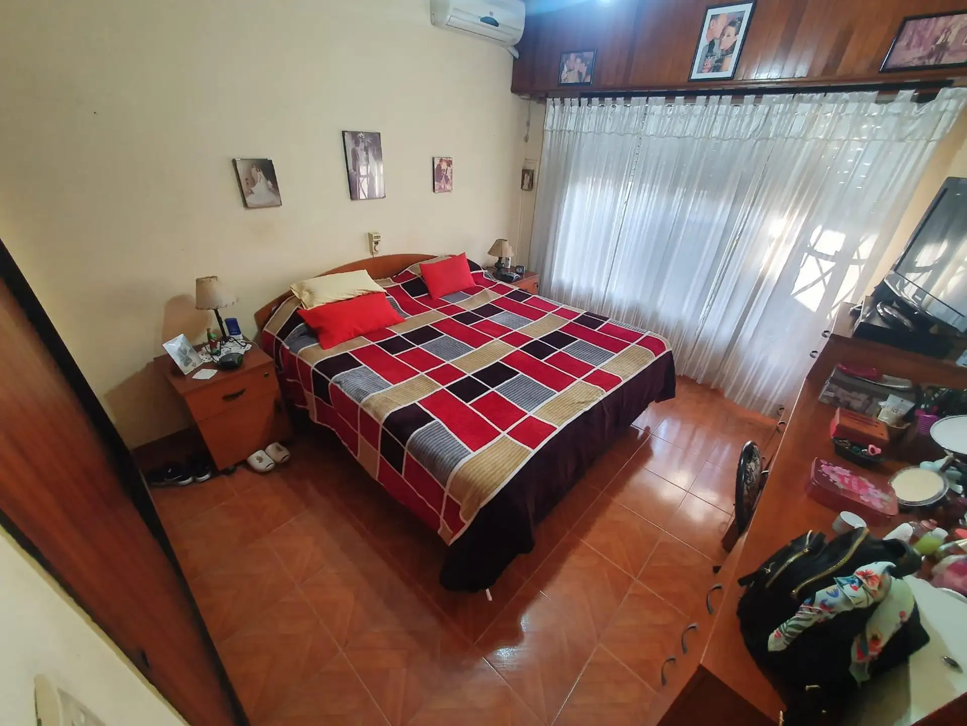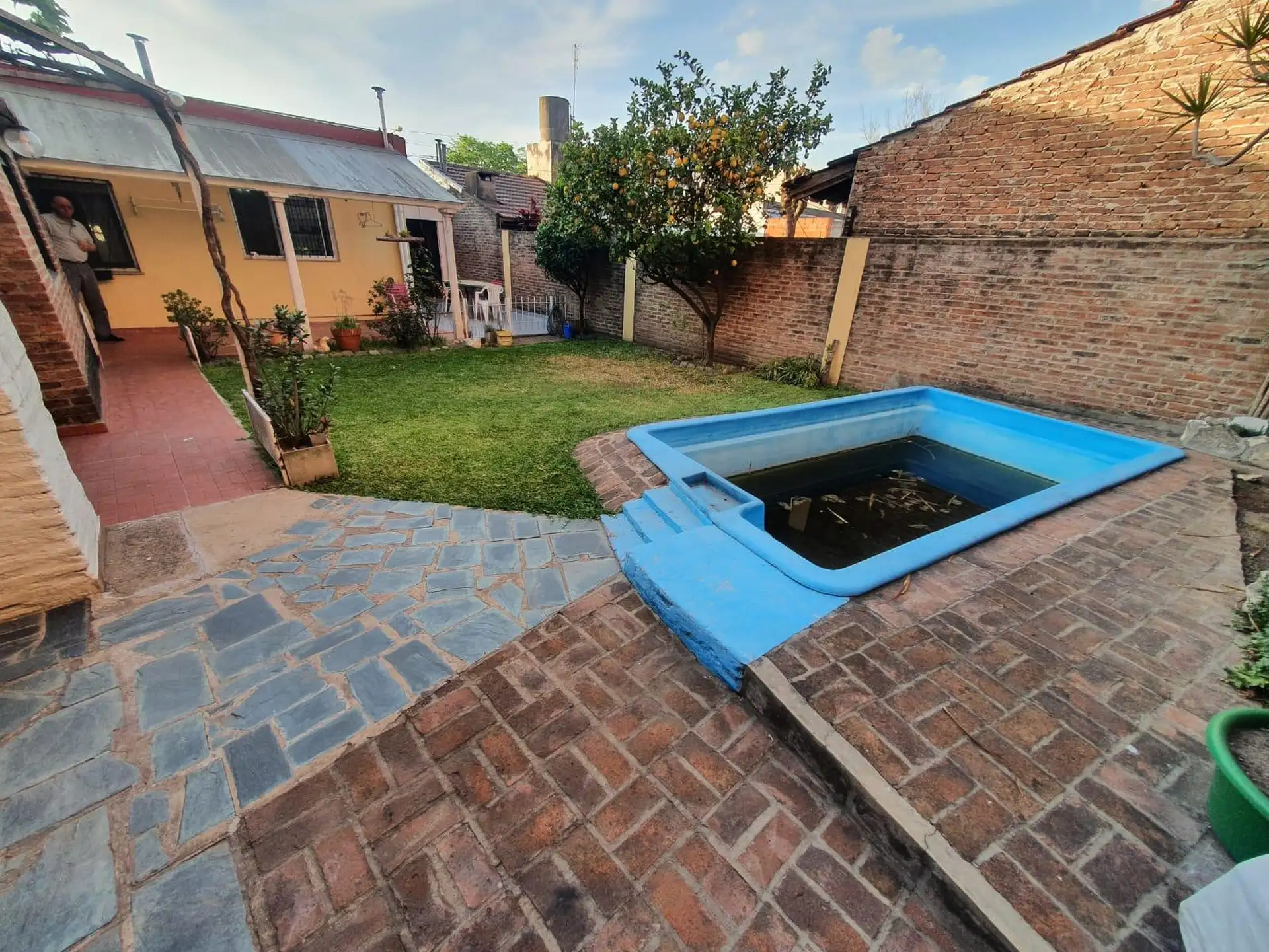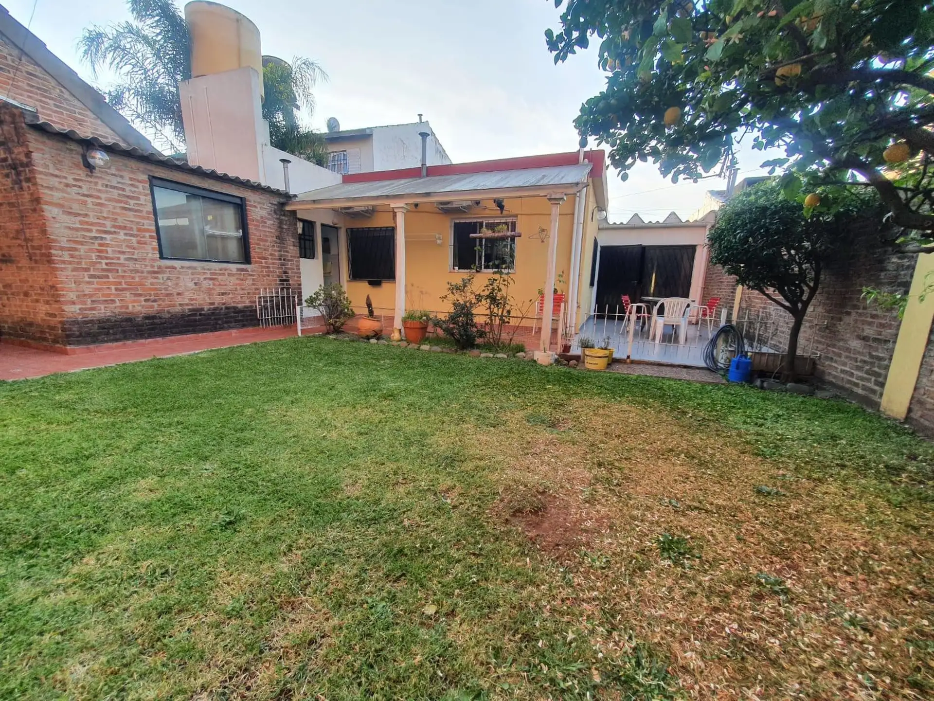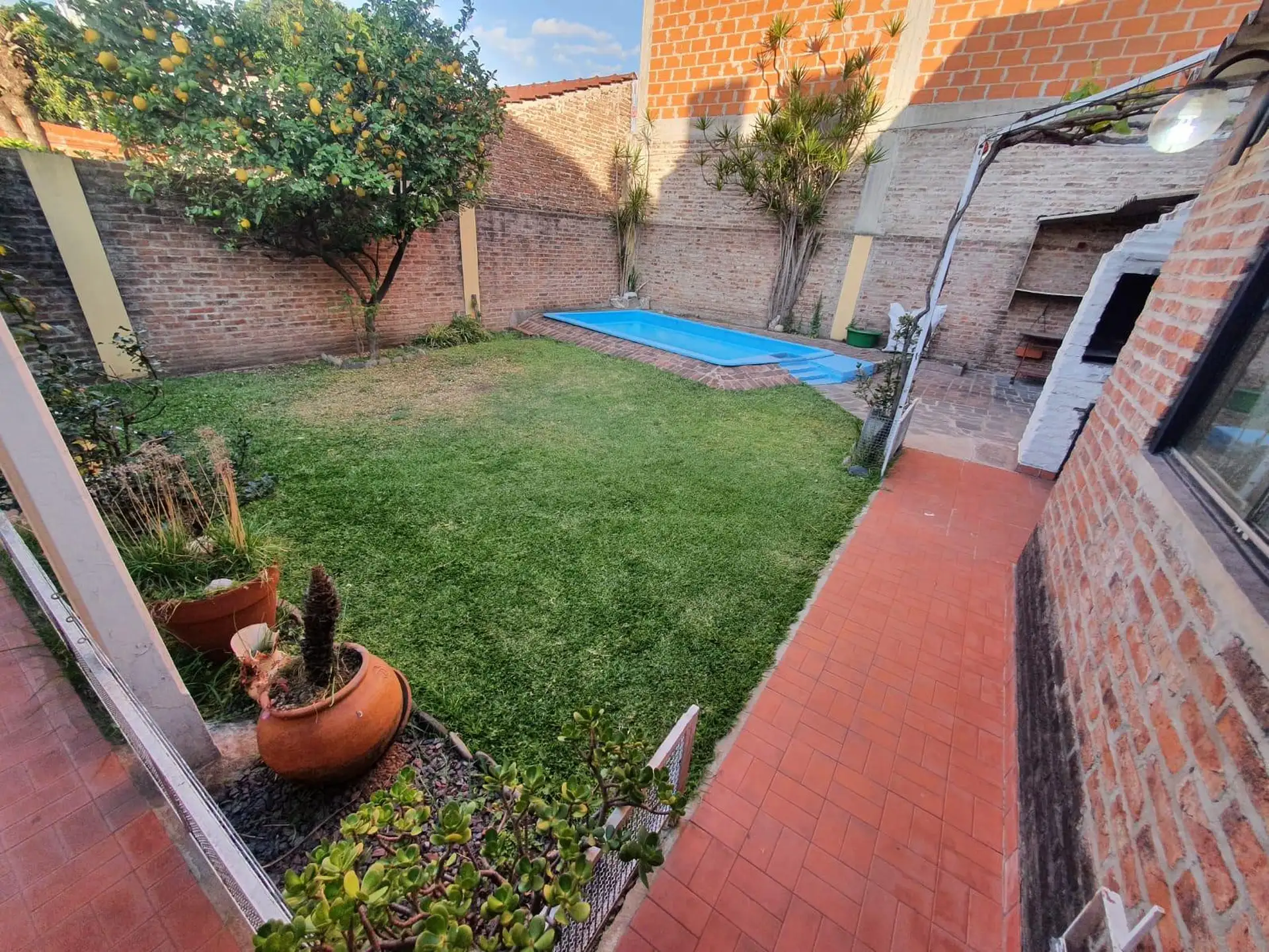 Three-room house in Villa Luzuriaga on a large plot. The layout includes a living-dining room, a kitchen with a daily dining area, a full bathroom with a shower screen, and two bedrooms with ceramic floors. There is a front garden, a semi-covered car entry for 1 vehicle, an open driveway to the back, a semi-covered gallery with a uncovered grill, and a fiberglass pool. The property is about 35 years old and the listing notes that measures shown are illustrative.