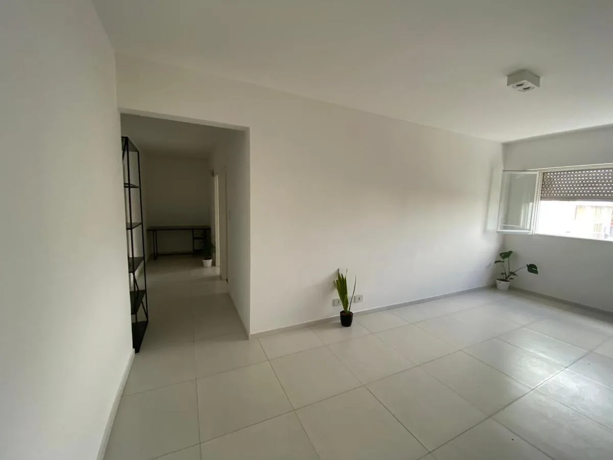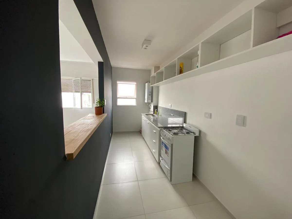 Two-room apartment for rent with a recycled interior. Living-dining room with wall-mounted heating via tiro balanceado and a separate kitchen with a counter, bottom cabinets and pantry. Porcelain tile floors, two bedrooms with built-in wardrobes and floating floors, and a full bathroom.