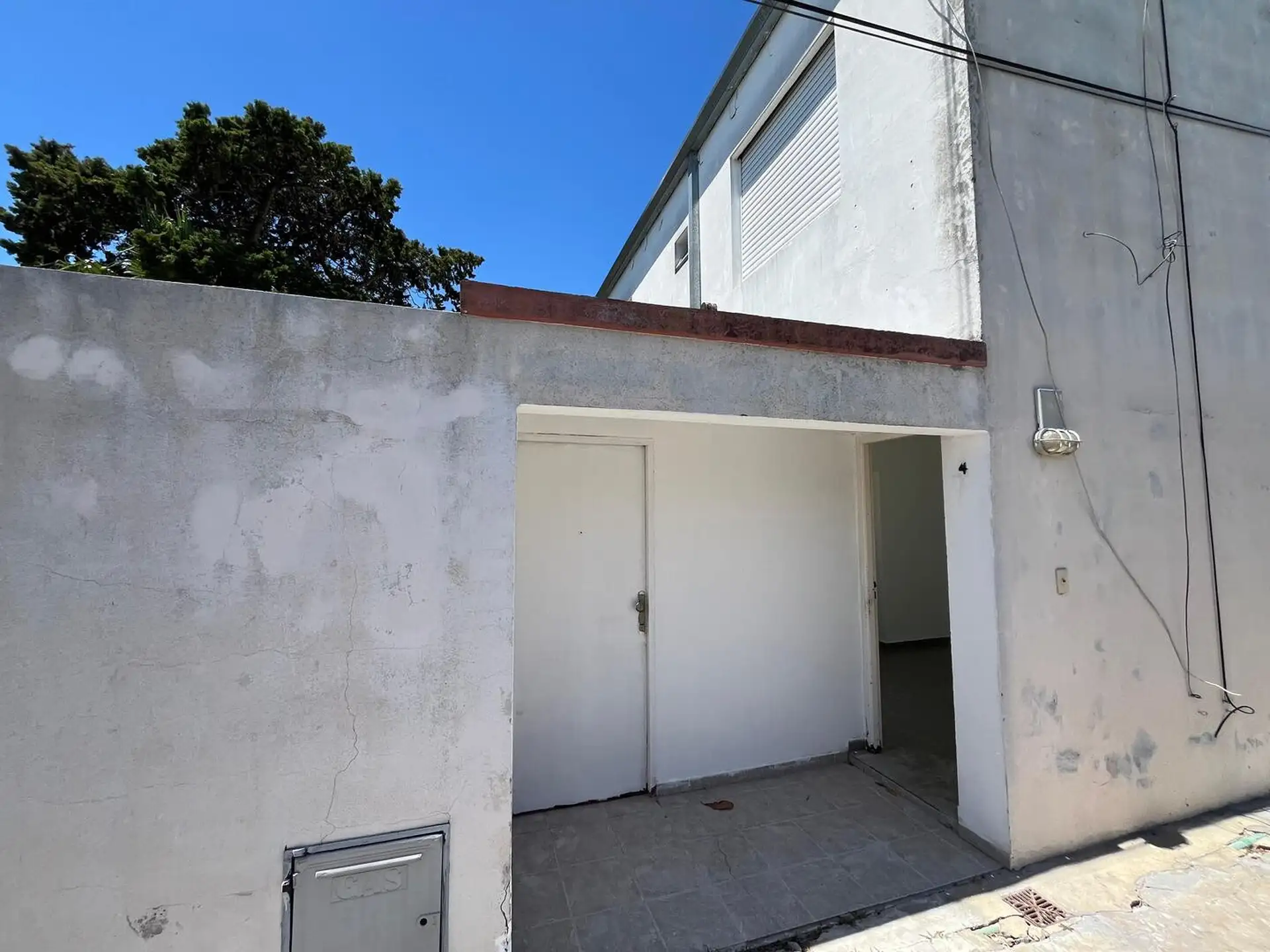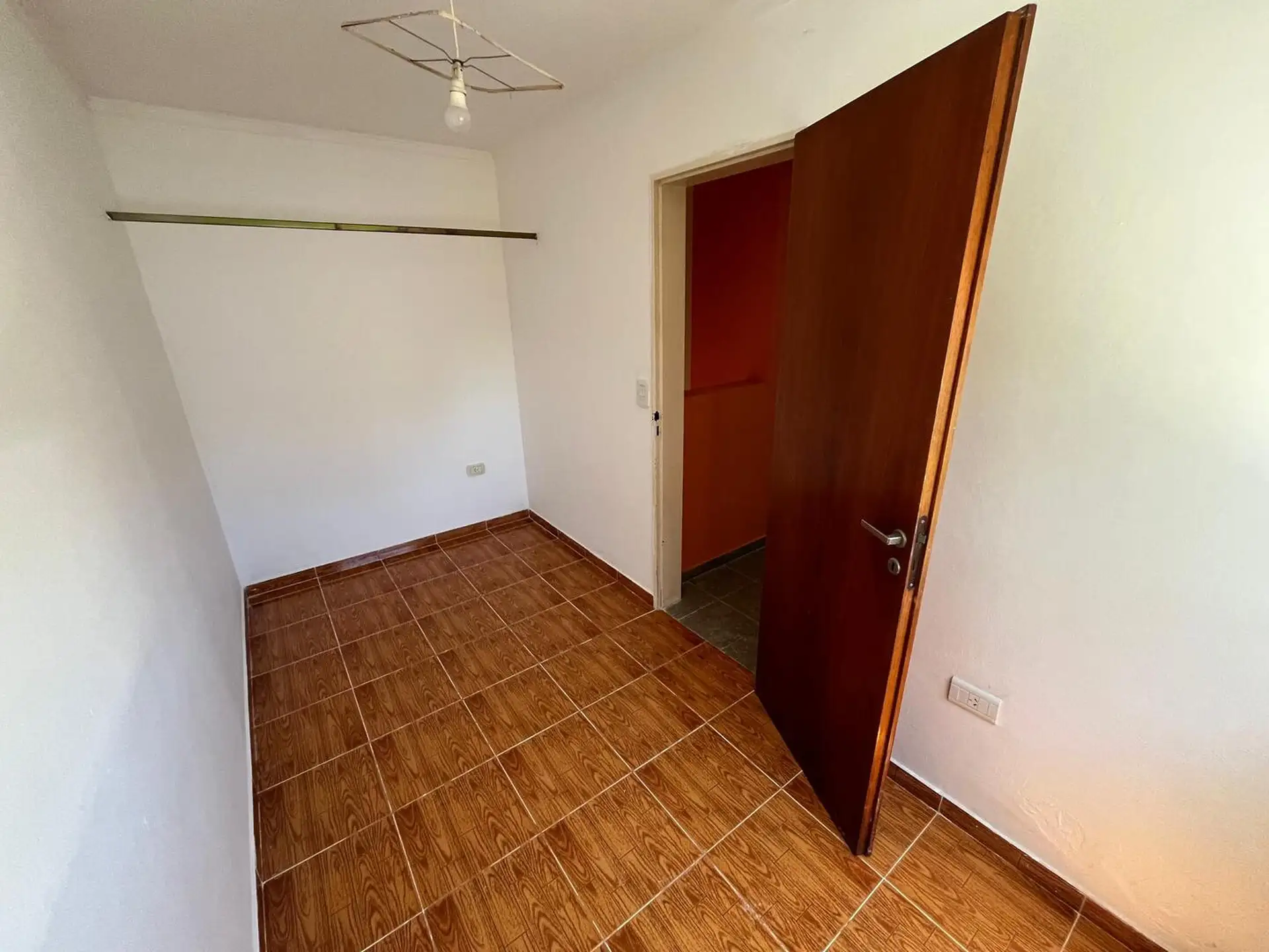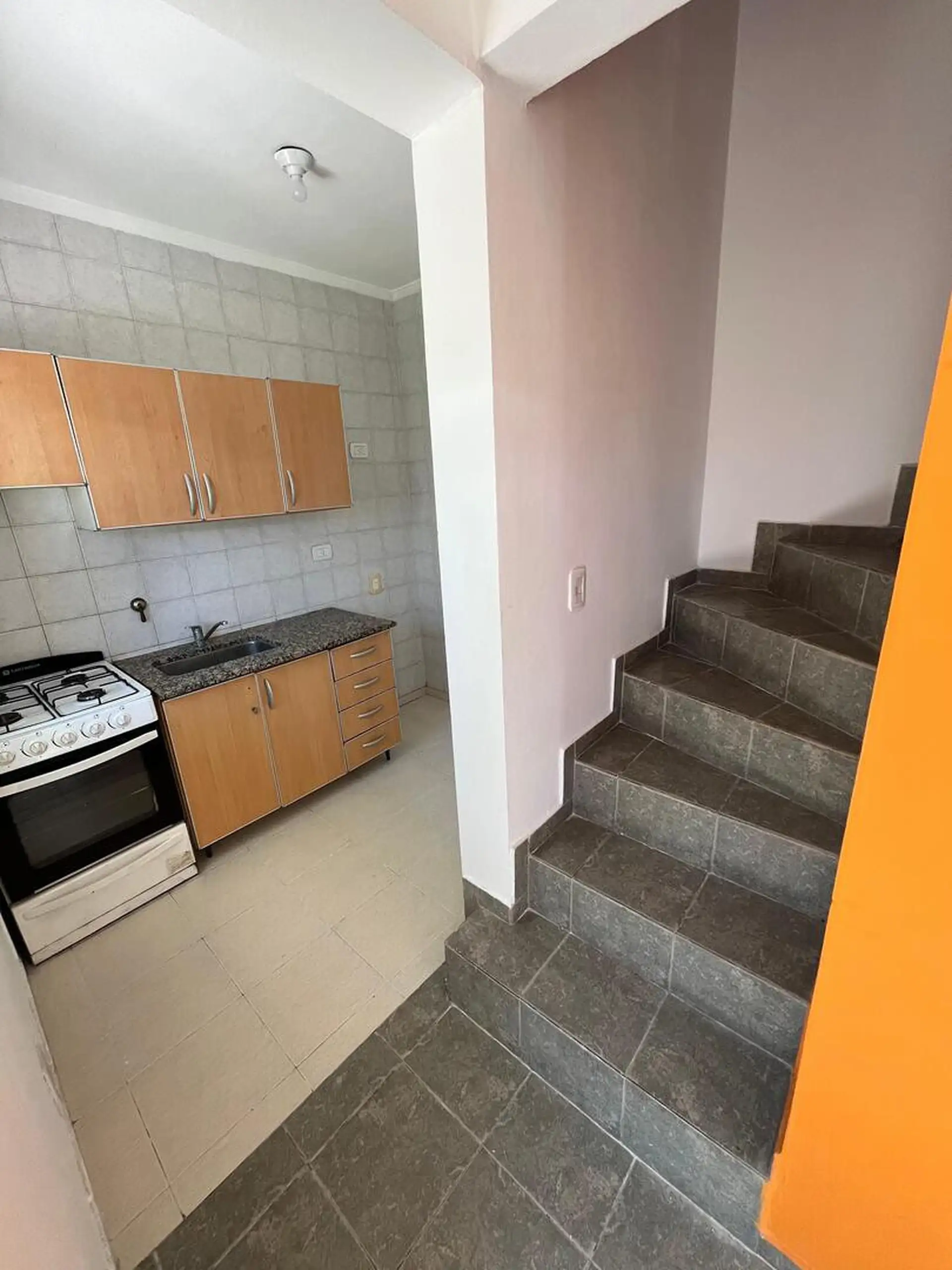 Duplex apartment accessed via a corridor and located on the upper floor and ground floor. Upper level has 2 bedrooms, one smaller without a closet and not suited for a double bed, and the larger bedroom with a closet, plus a full bathroom. Ground floor includes a small living-dining area of approximately 5 x 3 m, a separate kitchen, a toilet, a patio with greenery, a laundry area, and an uncovered parking space. Rent is ARS 500,000 with a 2-year contract and quarterly adjustments based on ICL; b