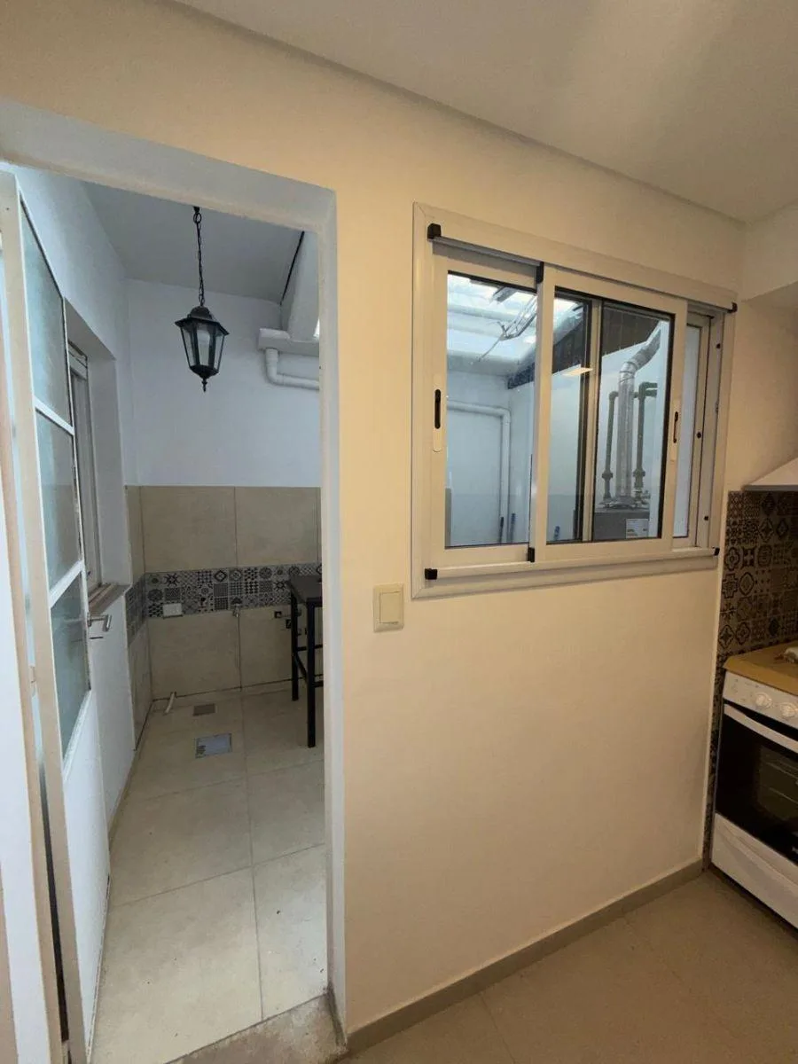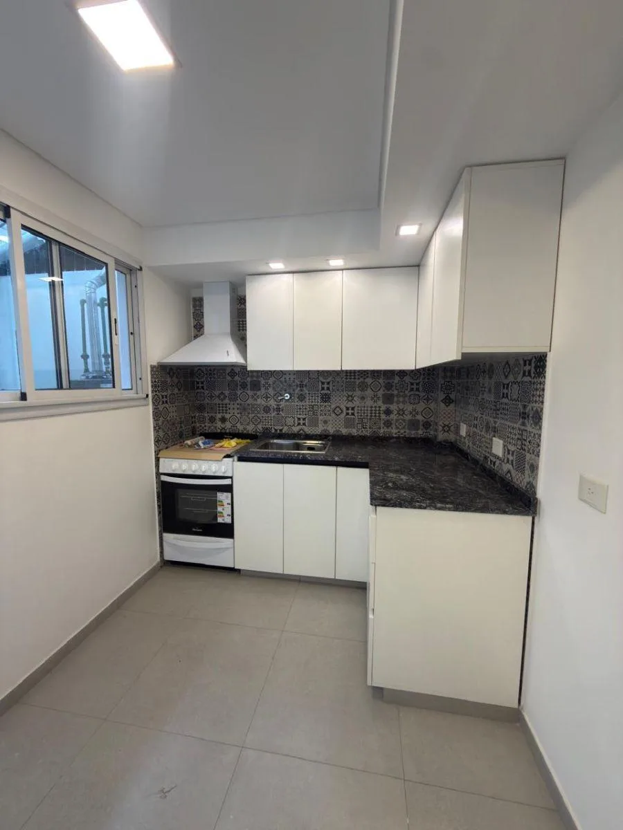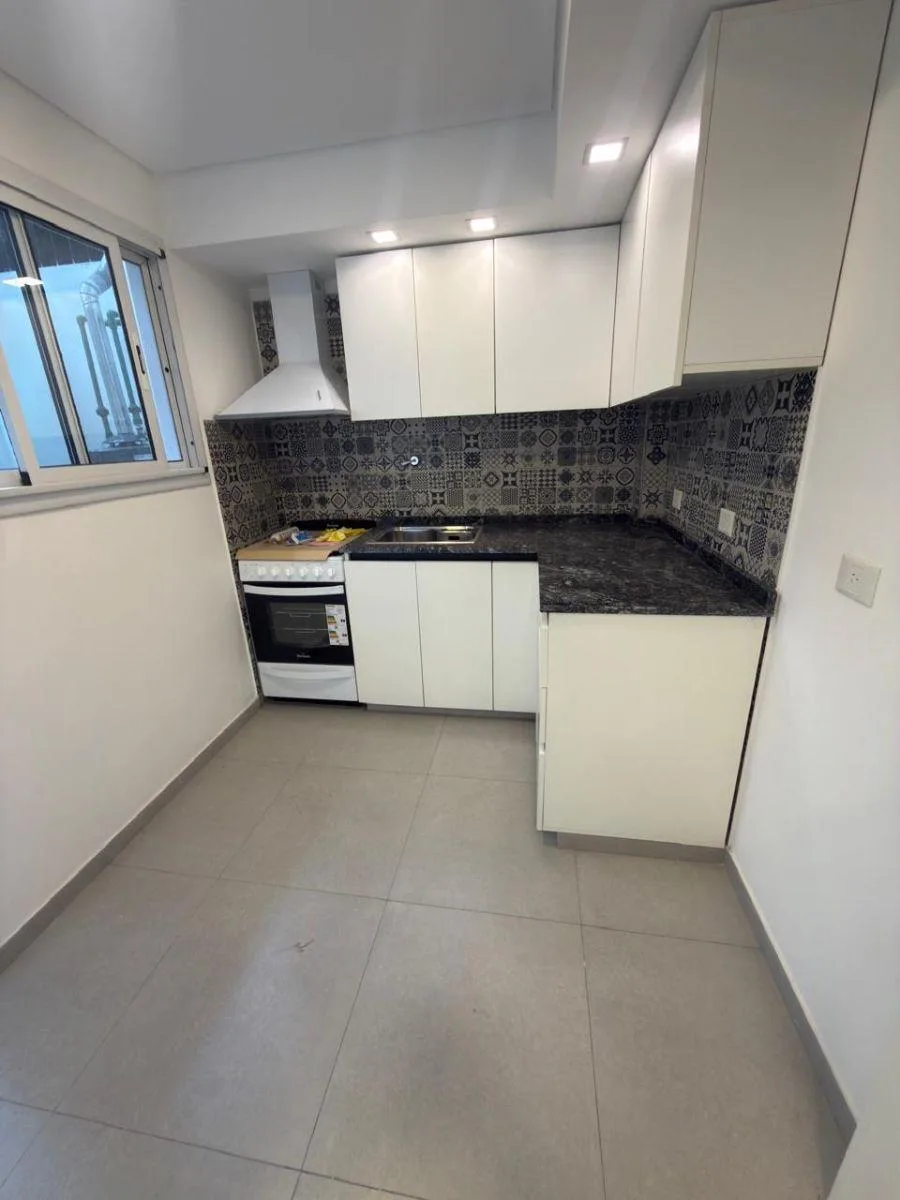 Brand-new apartment on the ground floor, street-facing, with a small front patio area under a retractable awning. It includes an entrance hall, a living-dining room, a kitchen with lower cabinets and an upper pantry, 1 bedroom with a built-in closet, and 1 bathroom with a vanity. Building fees are $30,000 per month; rent depends on use, with $850,000 for housing and $1,000,000 for professional use.