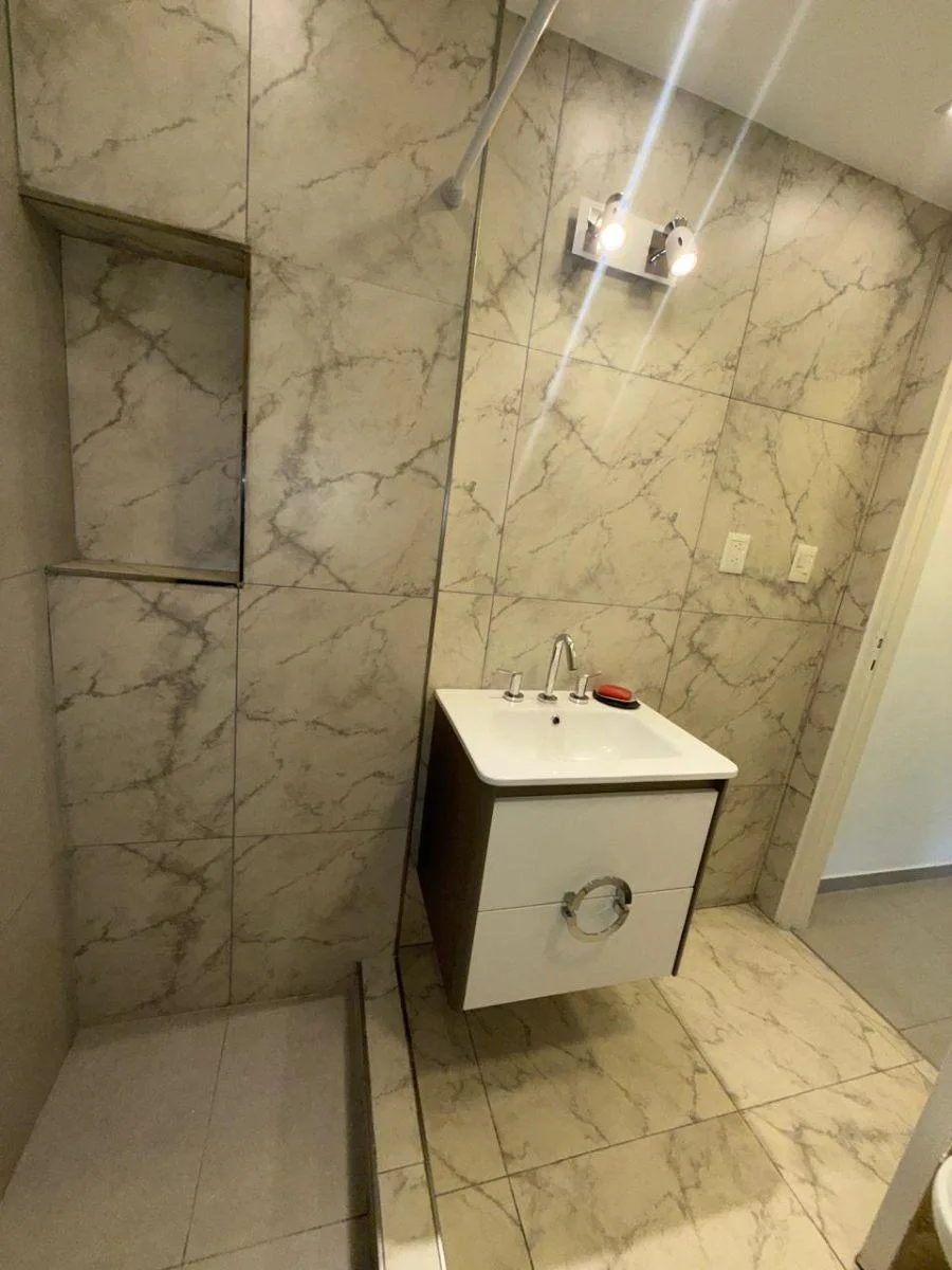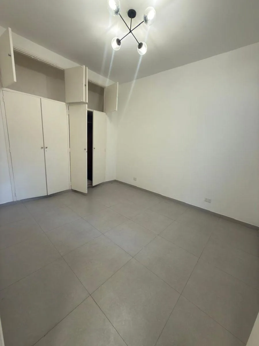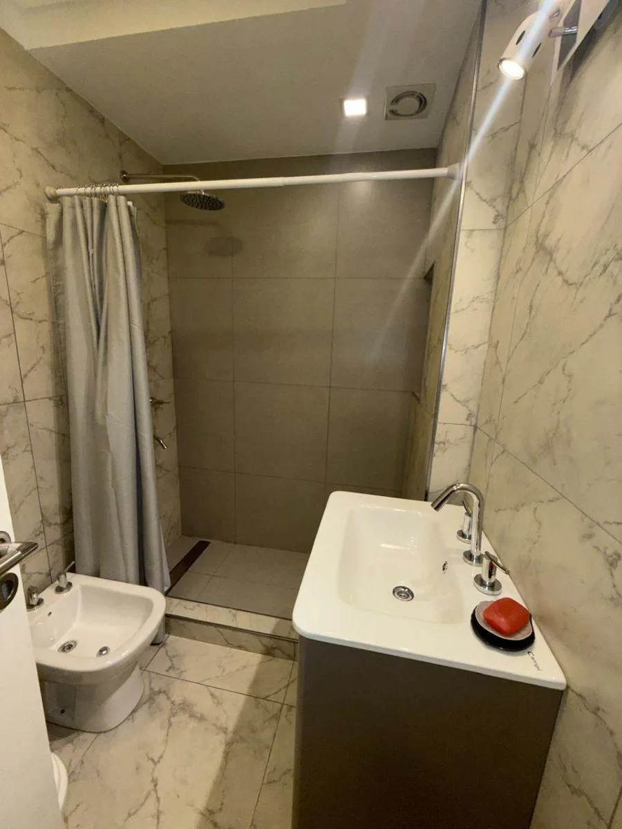 Brand-new apartment on the ground floor, street-facing, with a small front patio area under a retractable awning. It includes an entrance hall, a living-dining room, a kitchen with lower cabinets and an upper pantry, 1 bedroom with a built-in closet, and 1 bathroom with a vanity. Building fees are $30,000 per month; rent depends on use, with $850,000 for housing and $1,000,000 for professional use.