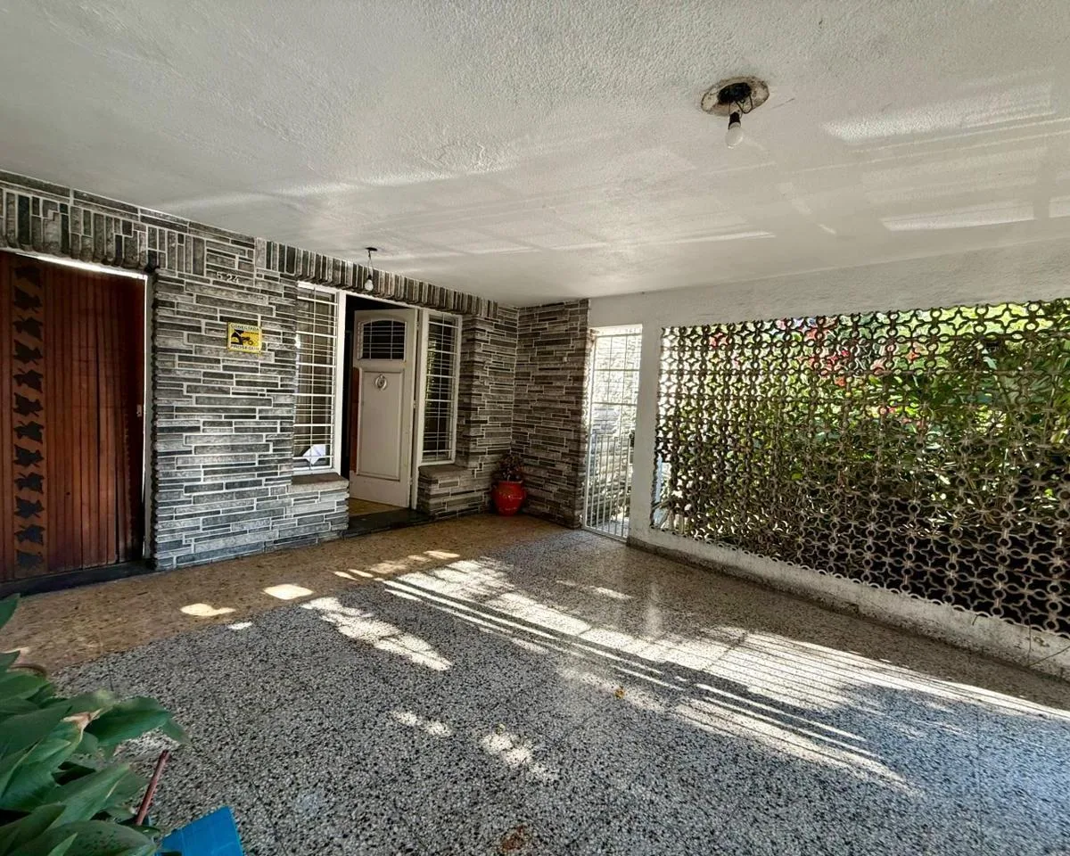 House for rent in Lanús Oeste with covered parking space at the front and a small front garden. The layout includes a living-dining room with granite floors, a kitchen with lower cabinets and a pantry, a full bathroom, and two front-facing bedrooms with built-in wardrobes. There is a small courtyard at the back with a semi-covered section, a covered laundry area, and a storage room, plus a walkable open-air terrace (PA). Rent is $800,000.
