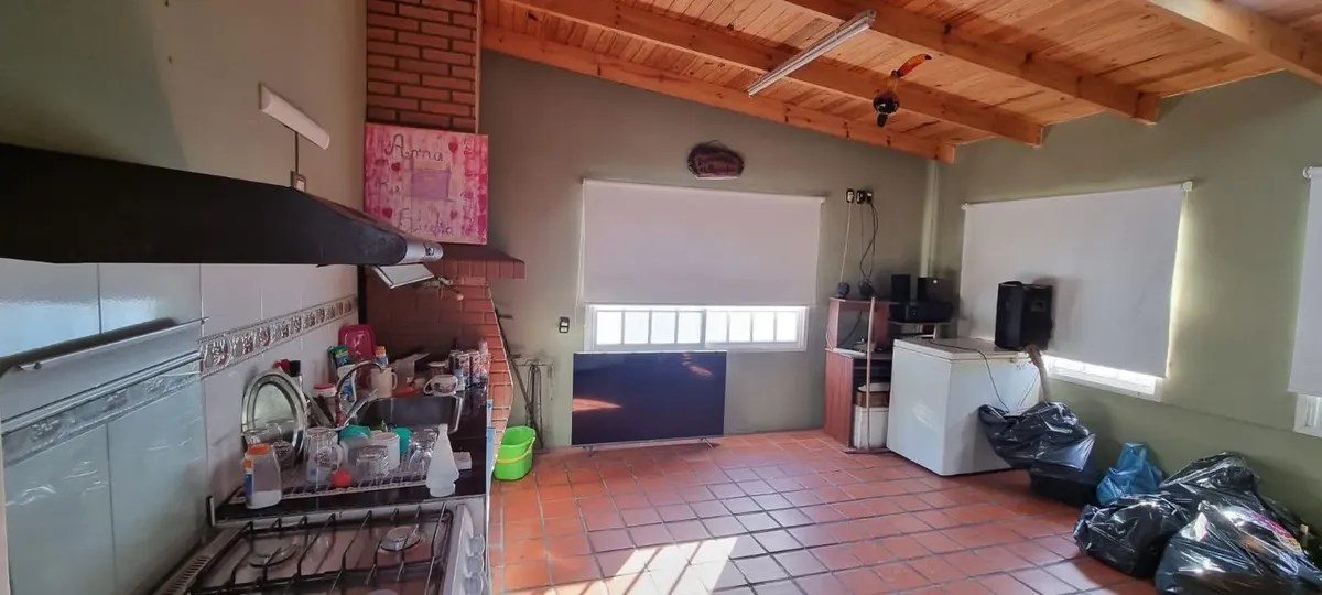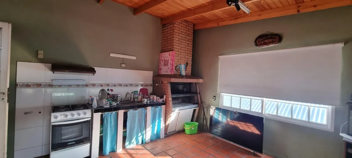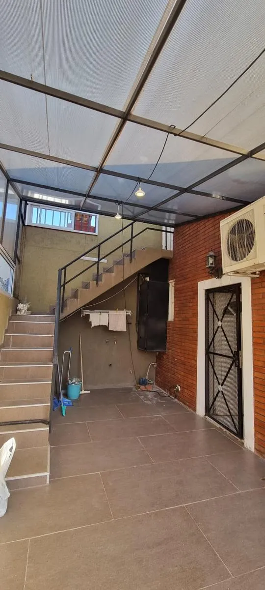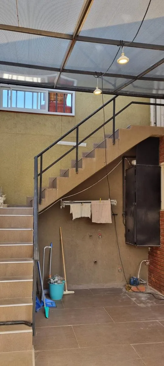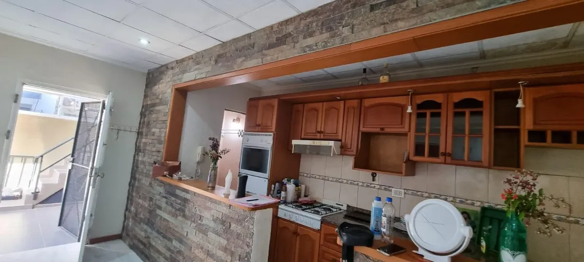 Internal house-style apartment with access via a corridor. First-floor unit with a covered patio, combined living-dining area with an installed kitchen, and a laundry area. Two bedrooms with built-in wardrobes and a full bathroom. Second floor features a covered quincho with a grill. No building fees (expensas).