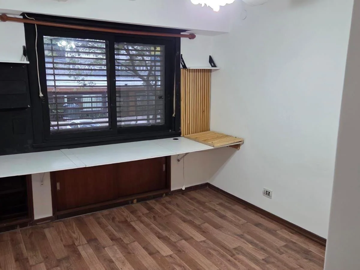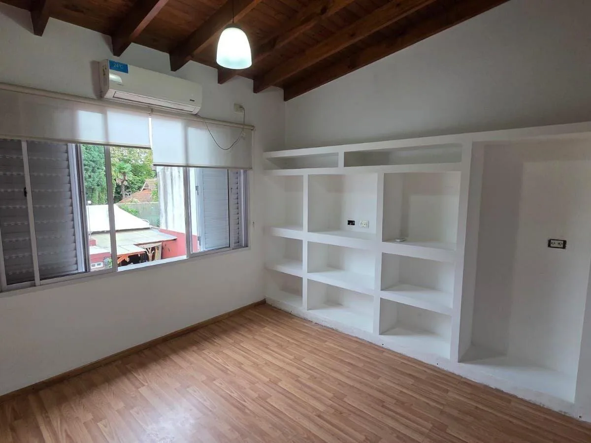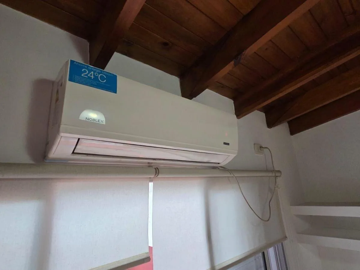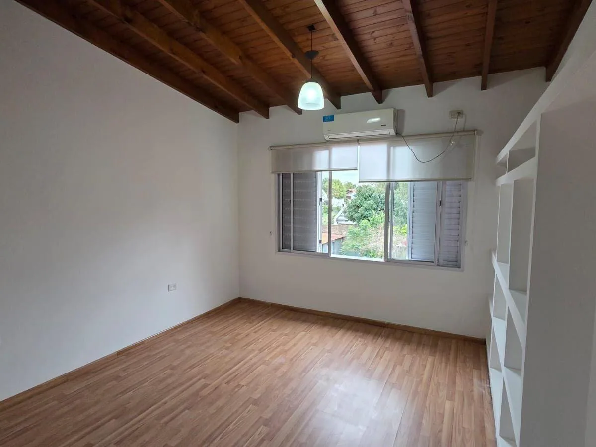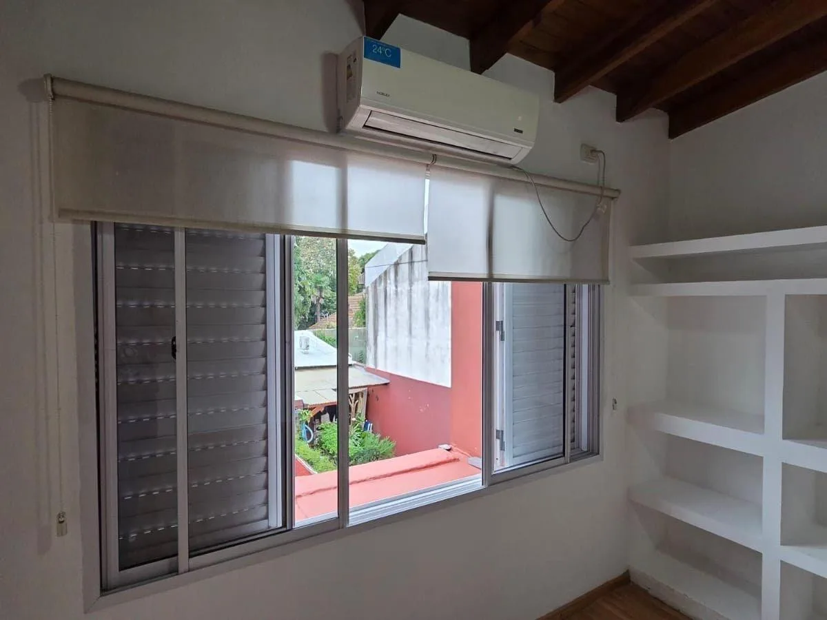 PH with private entrance, fully independent, with covered parking for a medium-sized car. Ground floor comprises a living-dining area, integrated full kitchen, toilet, patio and garden, plus a communal BBQ/grill area (quincho) with a grill; upper floor has 2 bedrooms, a full bathroom with a bathtub, and air-conditioning units (hot/cold) in the bedrooms. Heating includes a gas stove in the living-dining area, and all rooms have installed light fixtures. Rent excludes gas, electricity, AYSA and fi