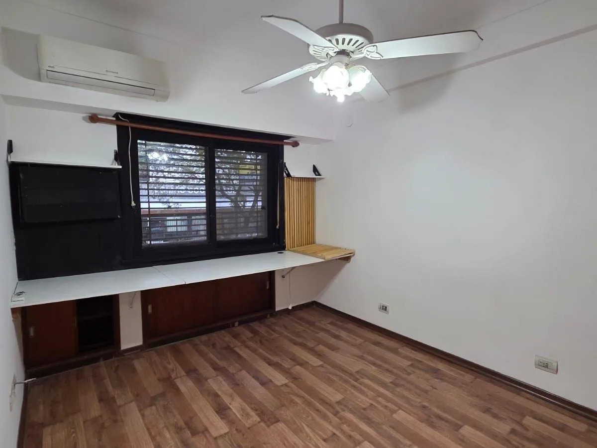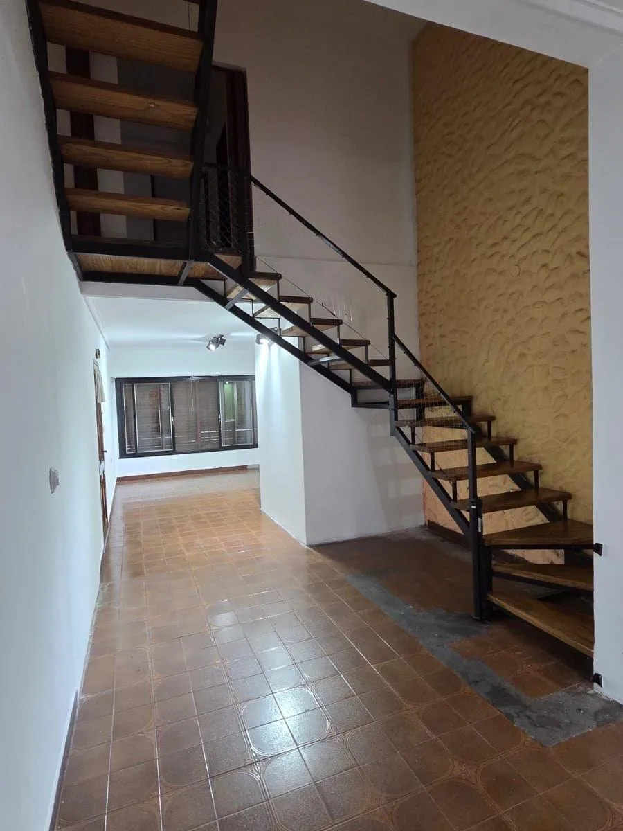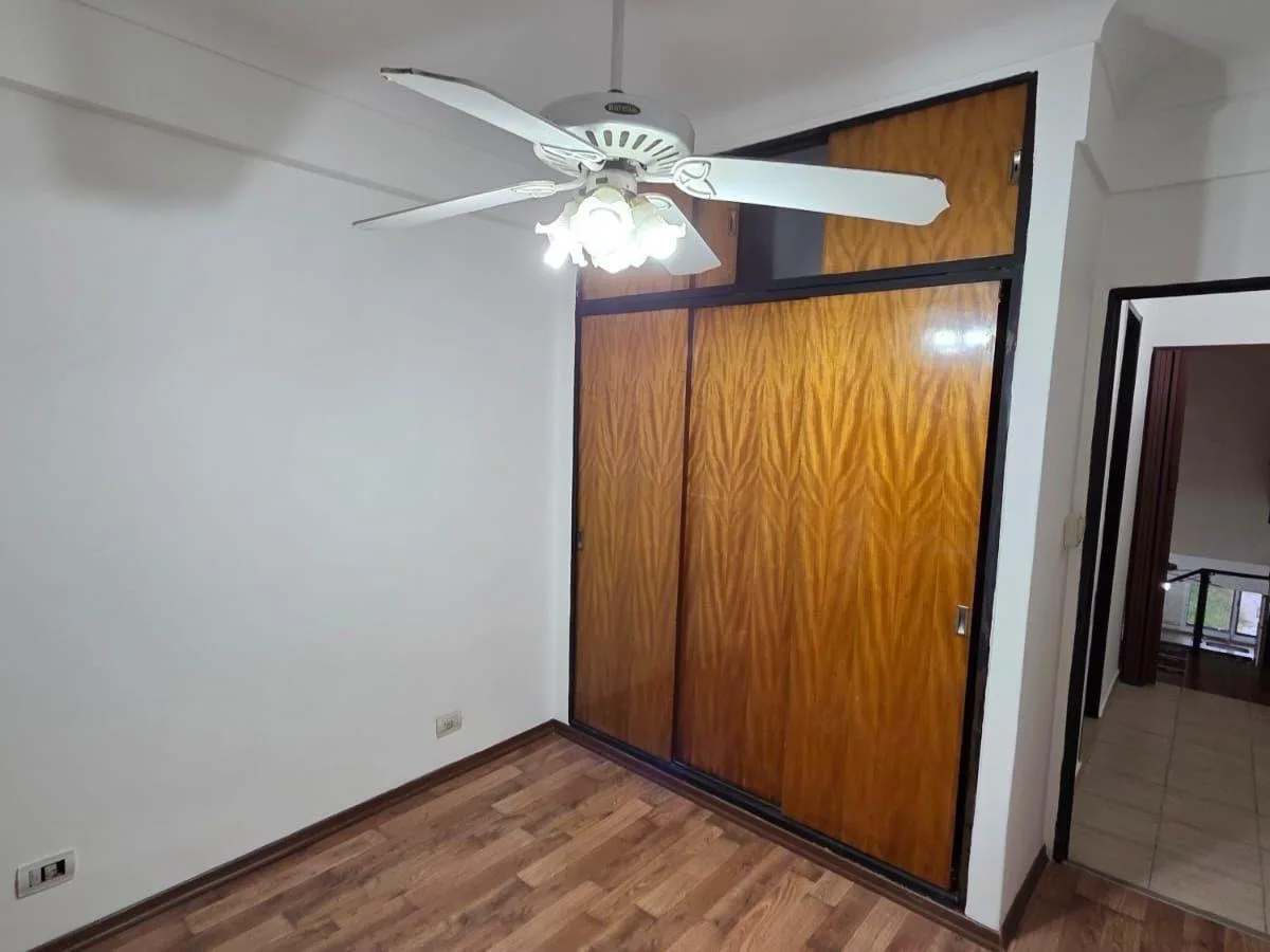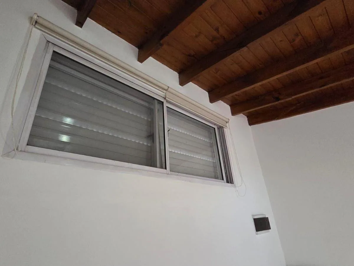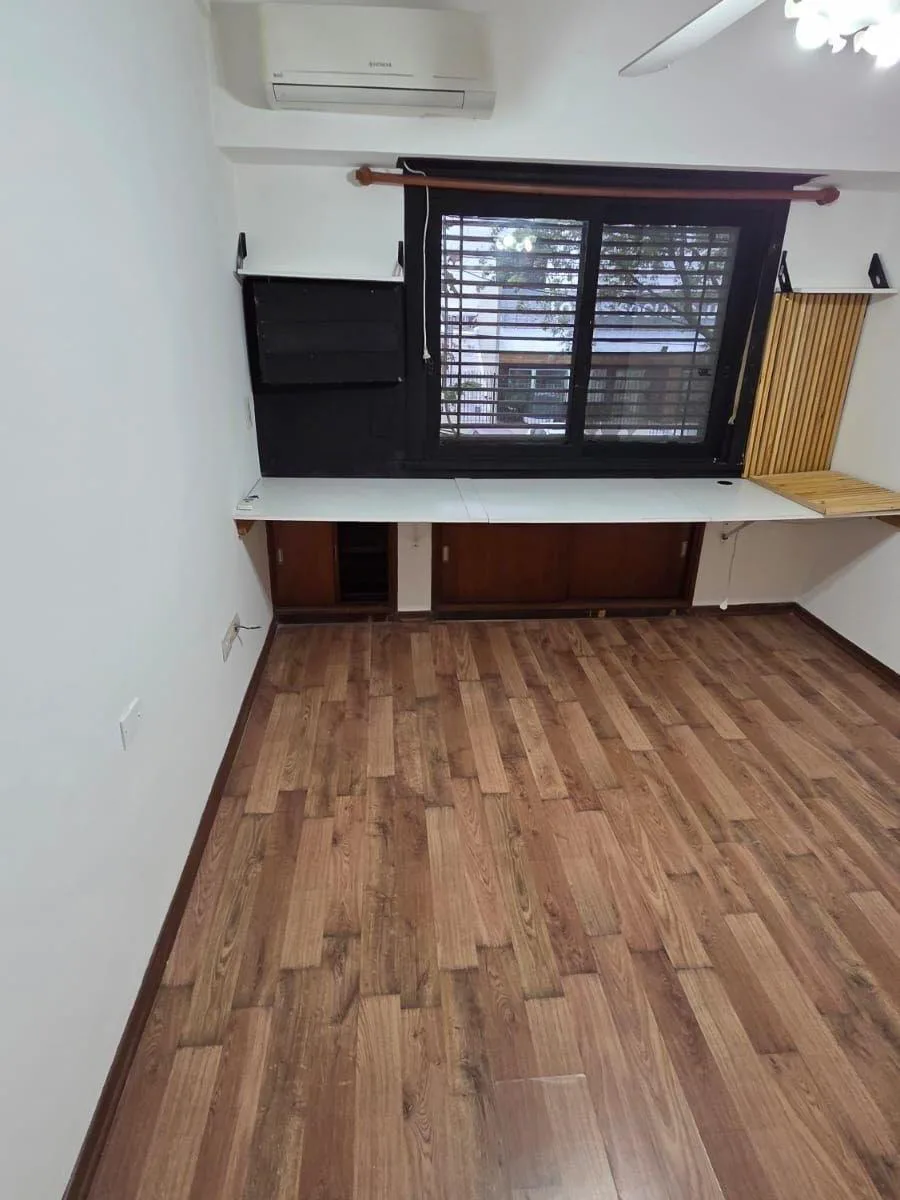 PH with private entrance, fully independent, with covered parking for a medium-sized car. Ground floor comprises a living-dining area, integrated full kitchen, toilet, patio and garden, plus a communal BBQ/grill area (quincho) with a grill; upper floor has 2 bedrooms, a full bathroom with a bathtub, and air-conditioning units (hot/cold) in the bedrooms. Heating includes a gas stove in the living-dining area, and all rooms have installed light fixtures. Rent excludes gas, electricity, AYSA and fi