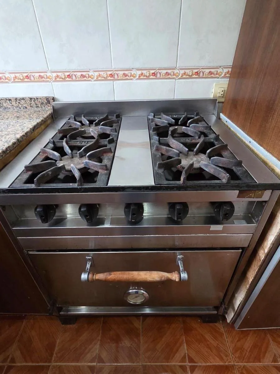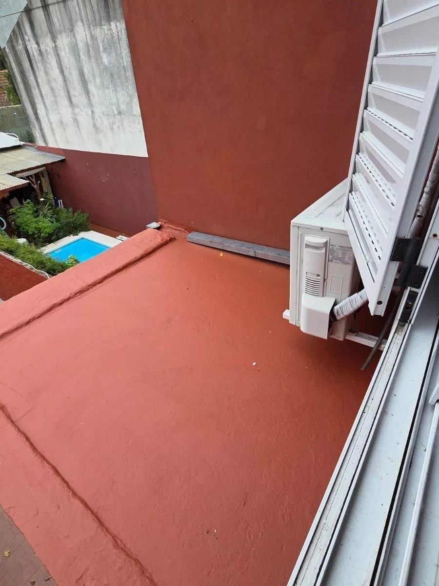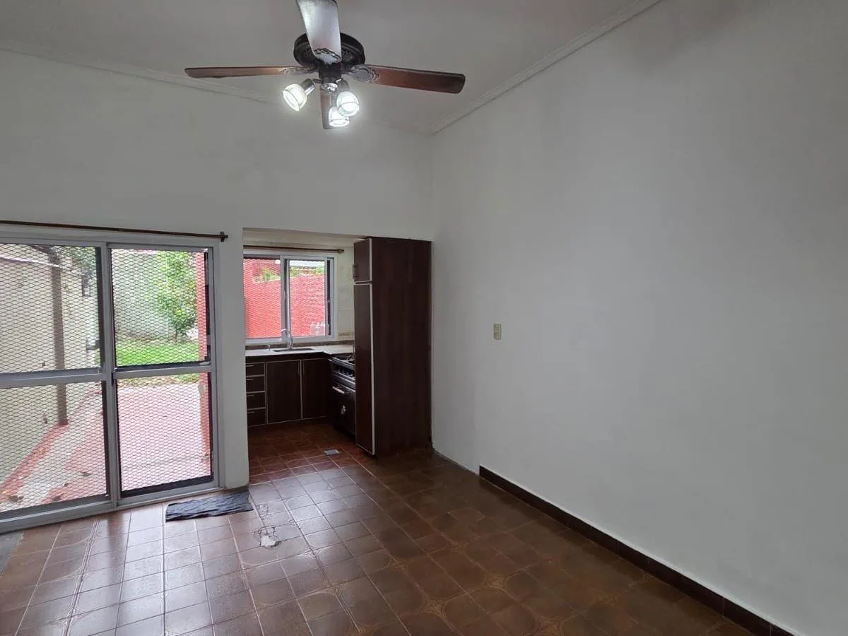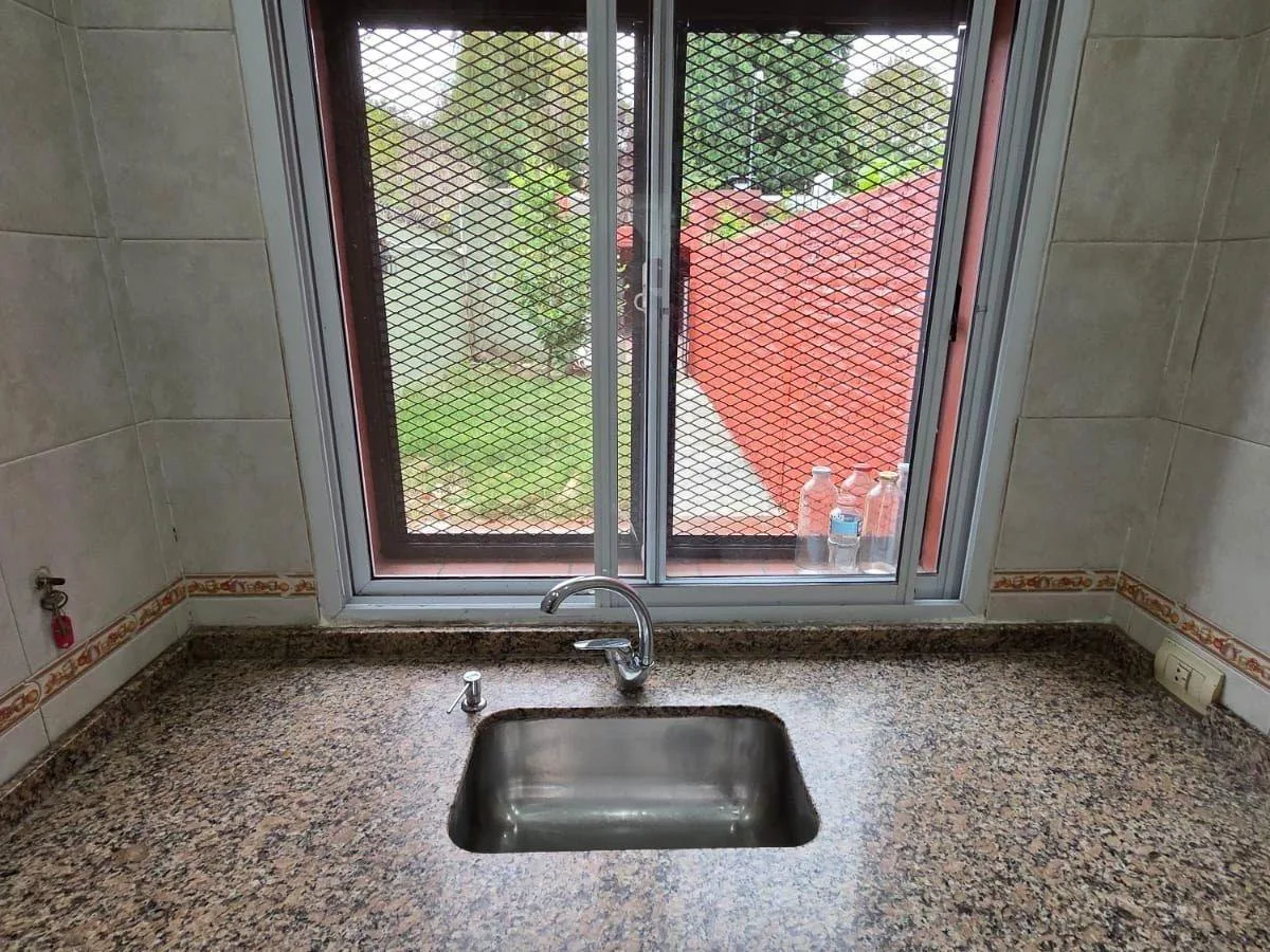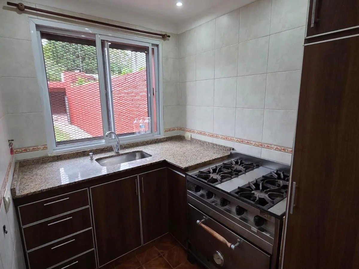 PH with private entrance, fully independent, with covered parking for a medium-sized car. Ground floor comprises a living-dining area, integrated full kitchen, toilet, patio and garden, plus a communal BBQ/grill area (quincho) with a grill; upper floor has 2 bedrooms, a full bathroom with a bathtub, and air-conditioning units (hot/cold) in the bedrooms. Heating includes a gas stove in the living-dining area, and all rooms have installed light fixtures. Rent excludes gas, electricity, AYSA and fi