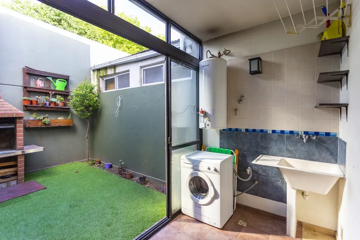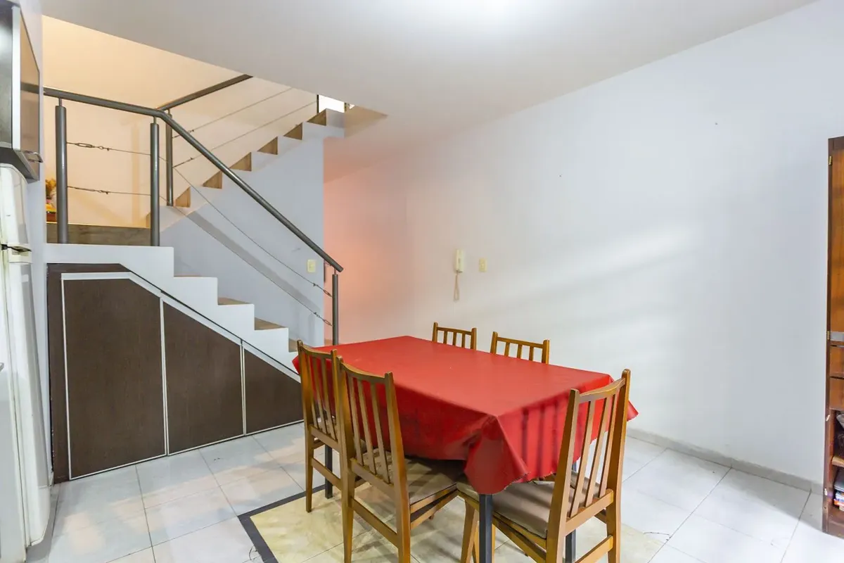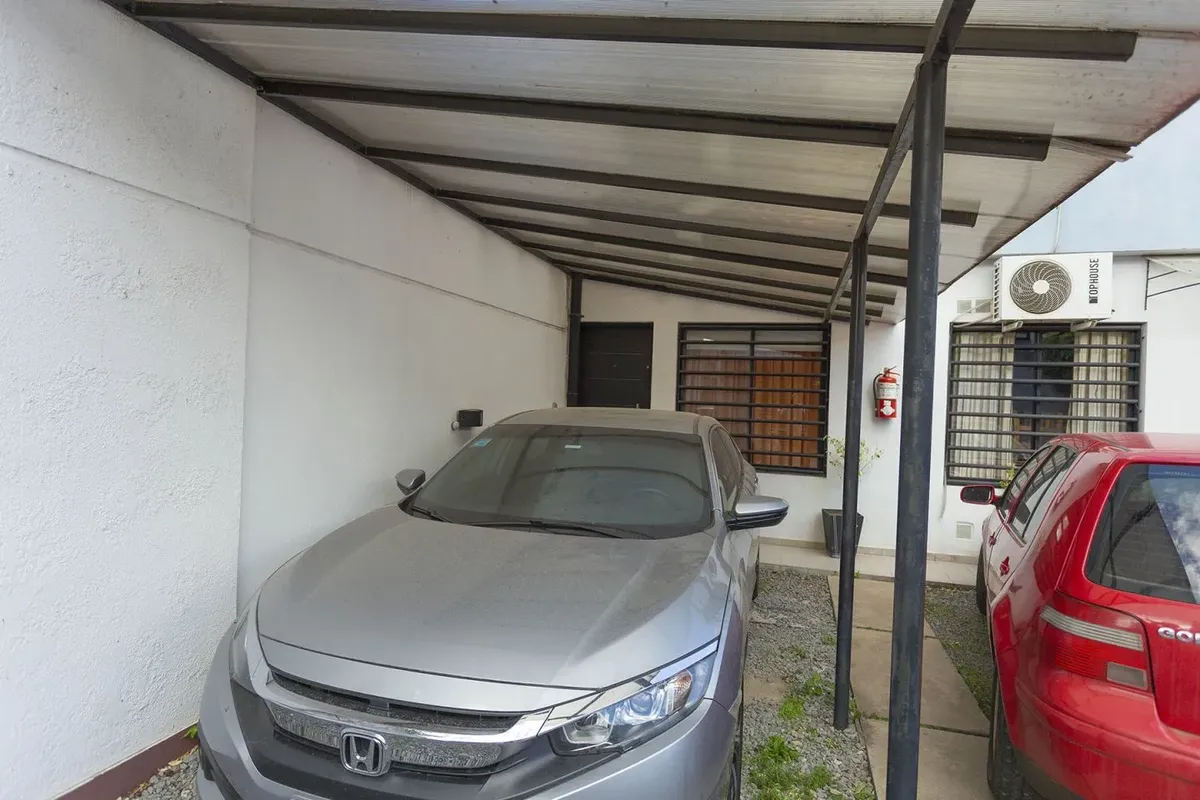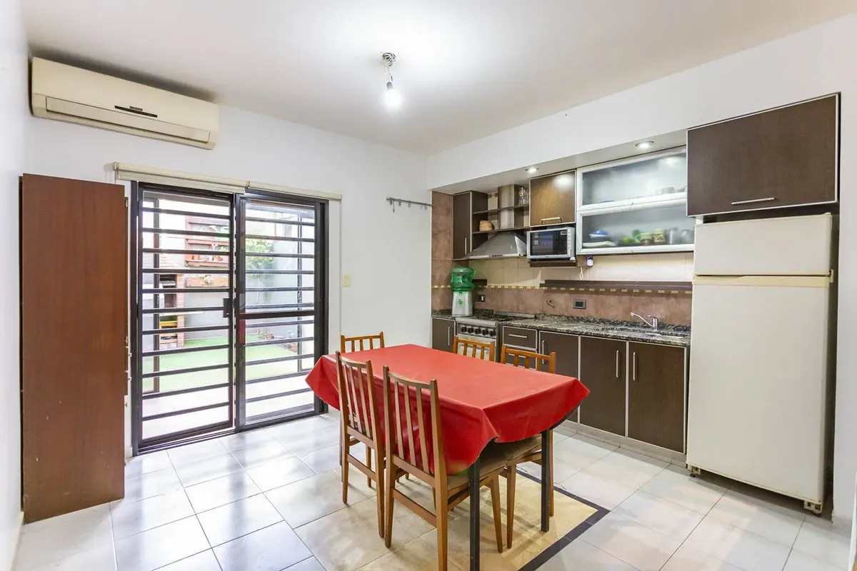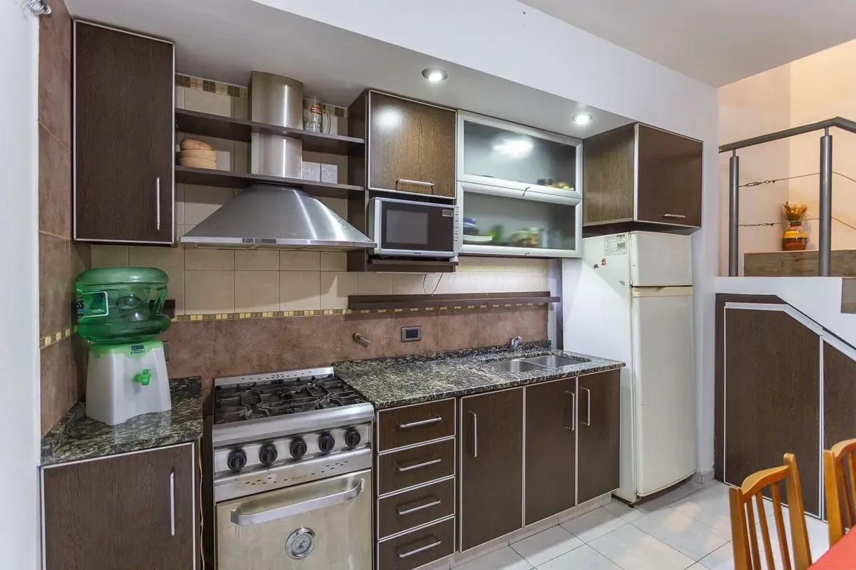 Duplex apartment with 3 rooms developed over two levels, unit 4. On the ground floor: living room, guest toilet, and a kitchen-dining area with fitted lower and upper cabinets, cooking appliance, and stainless-steel hood; storage under the staircase; semi-covered laundry; and a patio with a grill. Upstairs: landing, full bathroom with bathtub, and 2 bedrooms with built-in closets. The unit includes a semi-covered parking space.