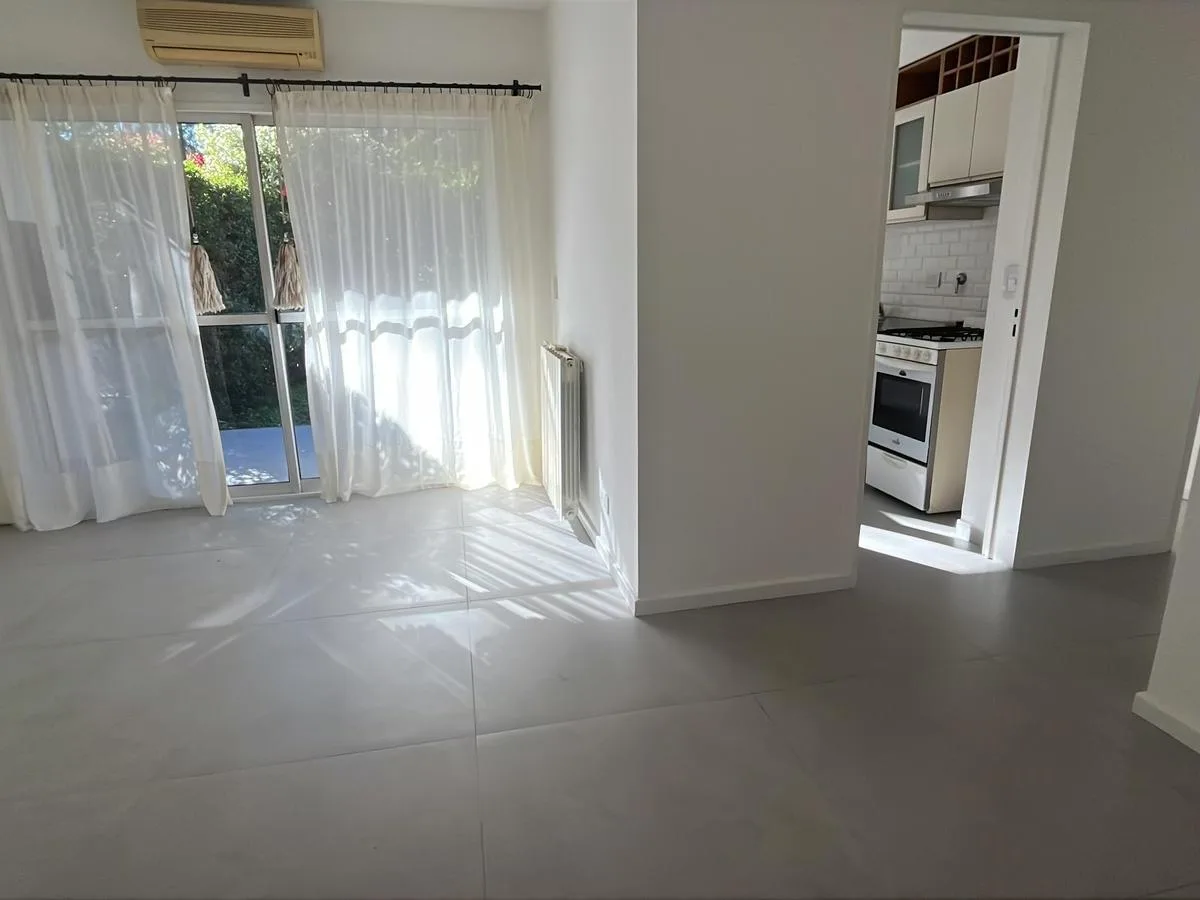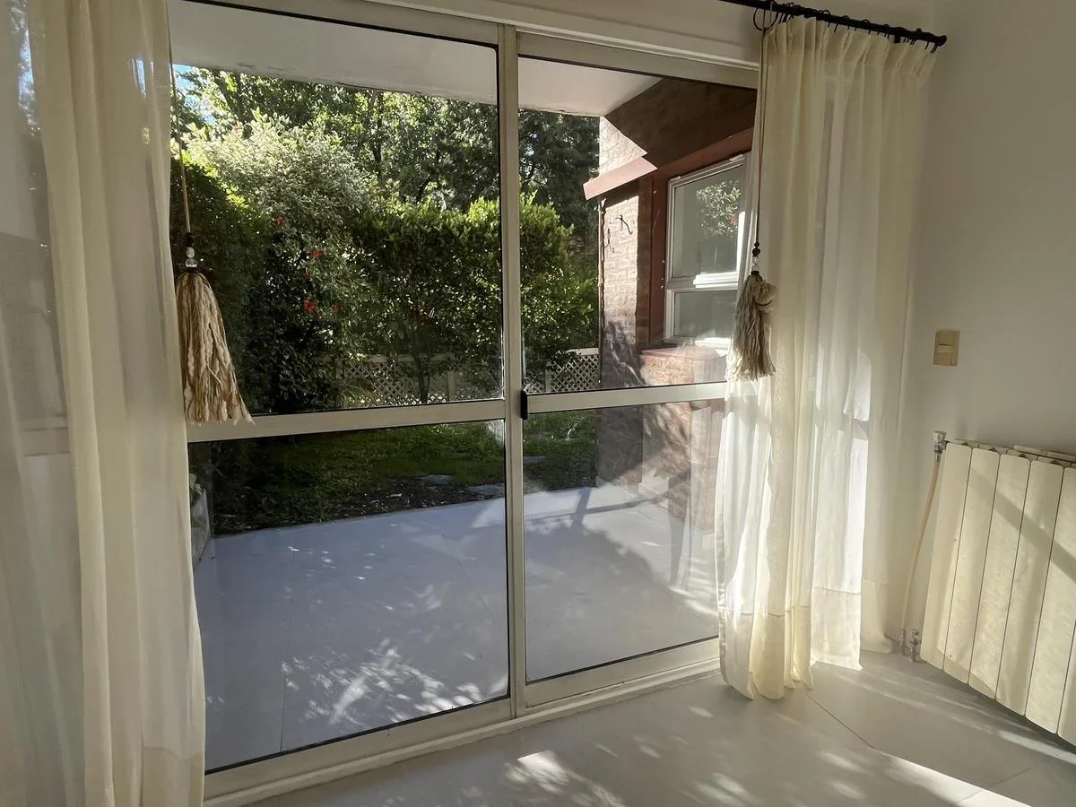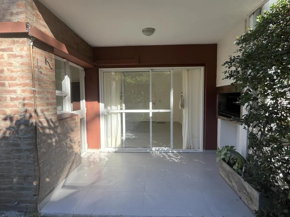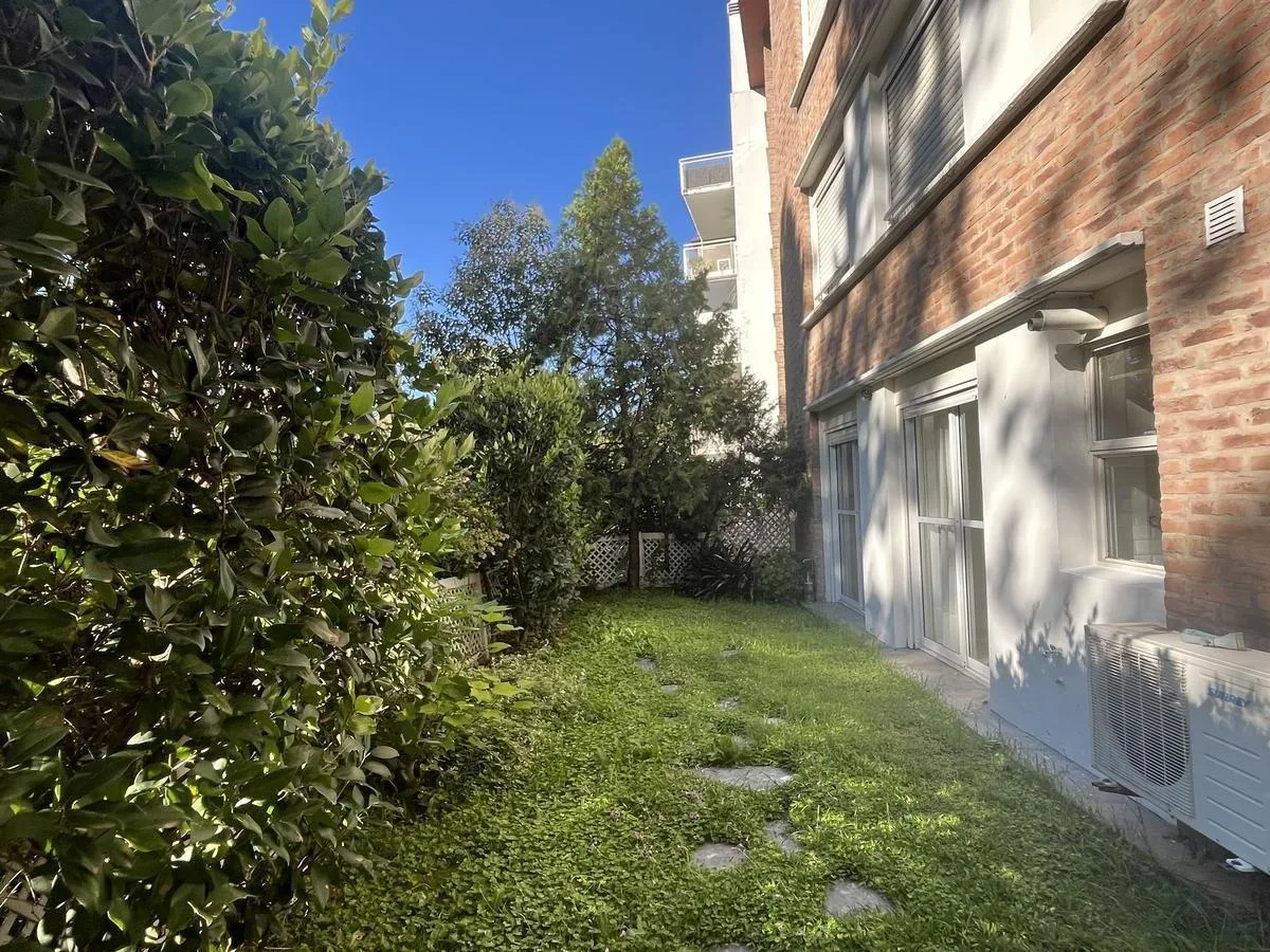 Two-bedroom apartment in Talar de Martínez on the ground floor with private garden and covered parking. The living-dining room has direct access to the garden. Kitchen is refurbished and includes a laundry space with direct access to the garden; a covered grill is located under the gallery. The master bedroom is en suite with its own bathroom and dressing area, the second bedroom has a built-in closet, and there is an additional full bathroom. Amenities include air conditioning in the living roo