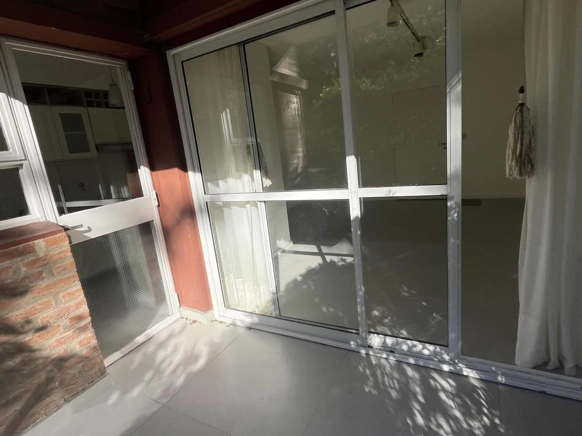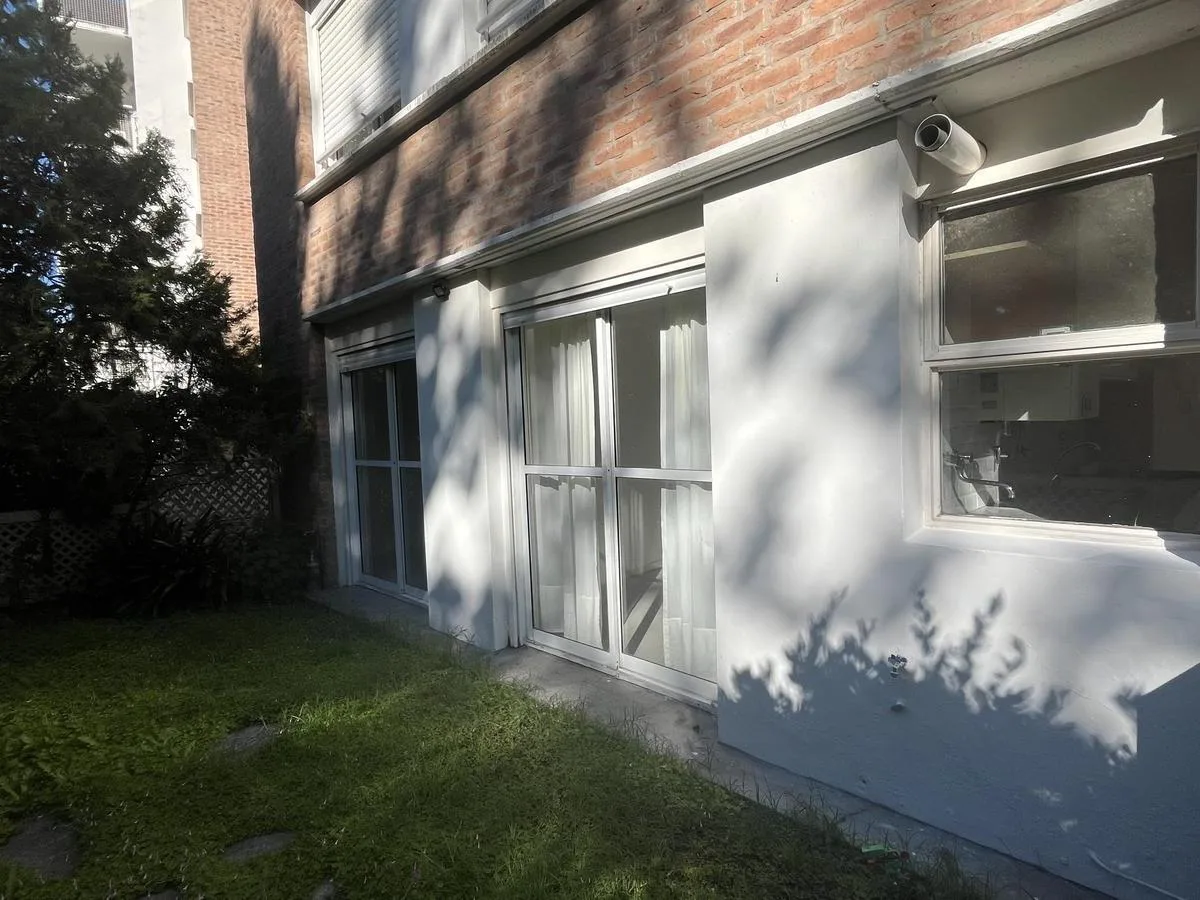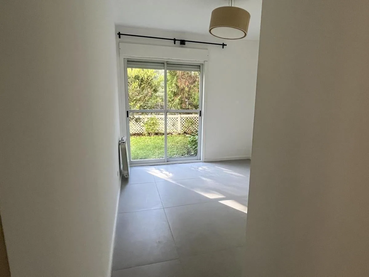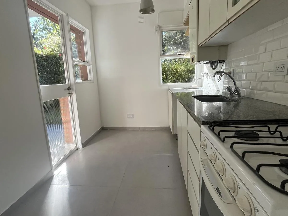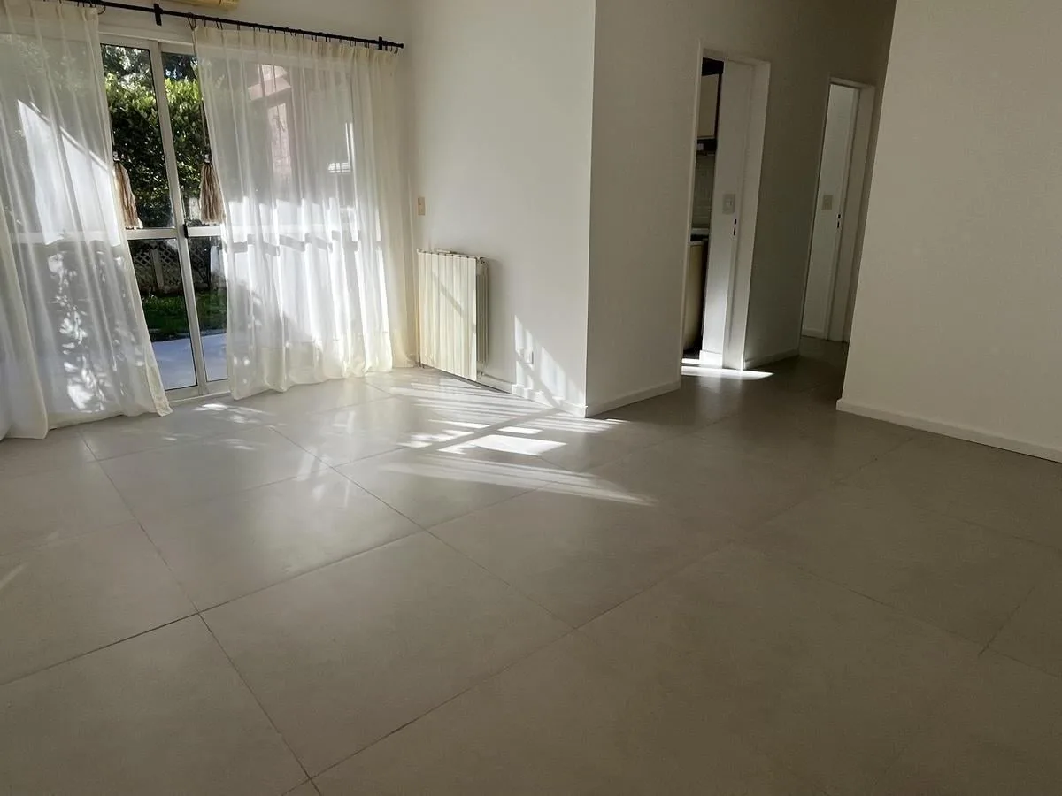 Two-bedroom apartment in Talar de Martínez on the ground floor with private garden and covered parking. The living-dining room has direct access to the garden. Kitchen is refurbished and includes a laundry space with direct access to the garden; a covered grill is located under the gallery. The master bedroom is en suite with its own bathroom and dressing area, the second bedroom has a built-in closet, and there is an additional full bathroom. Amenities include air conditioning in the living roo