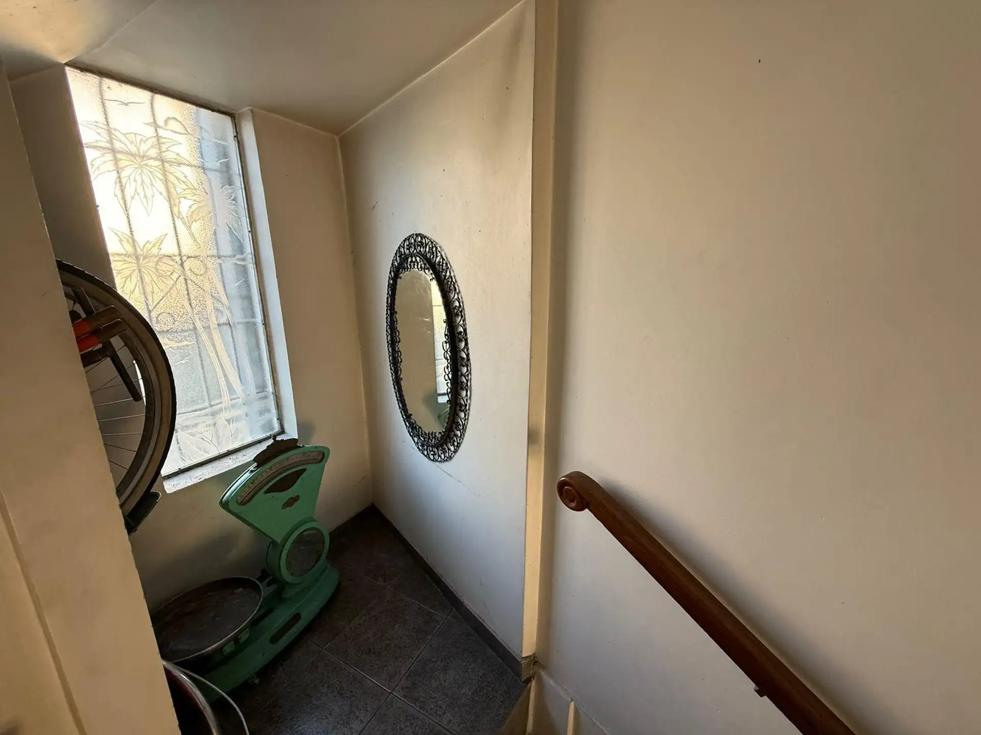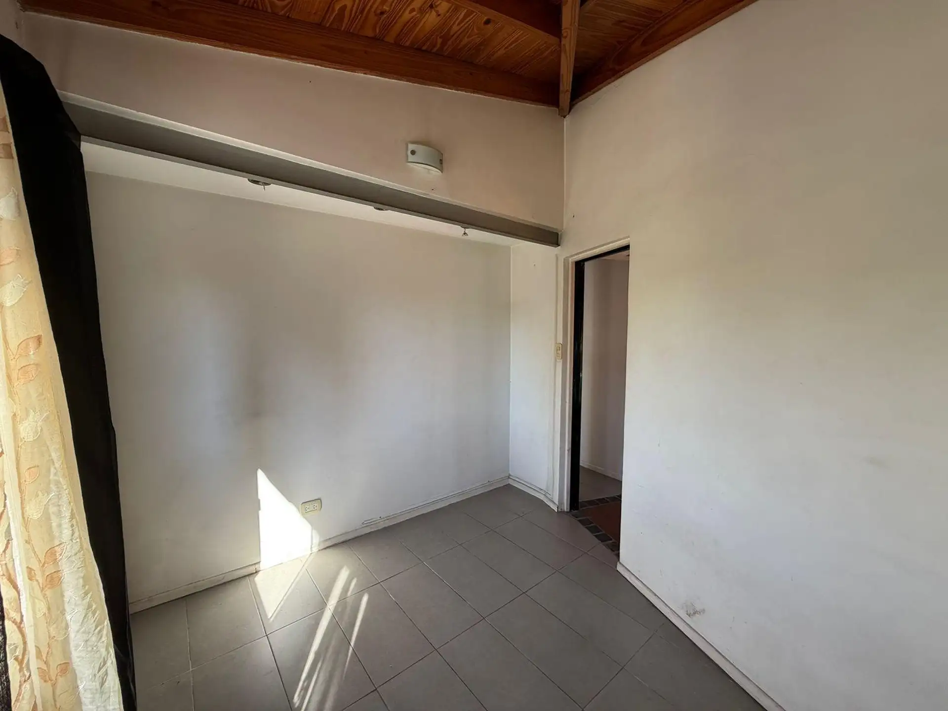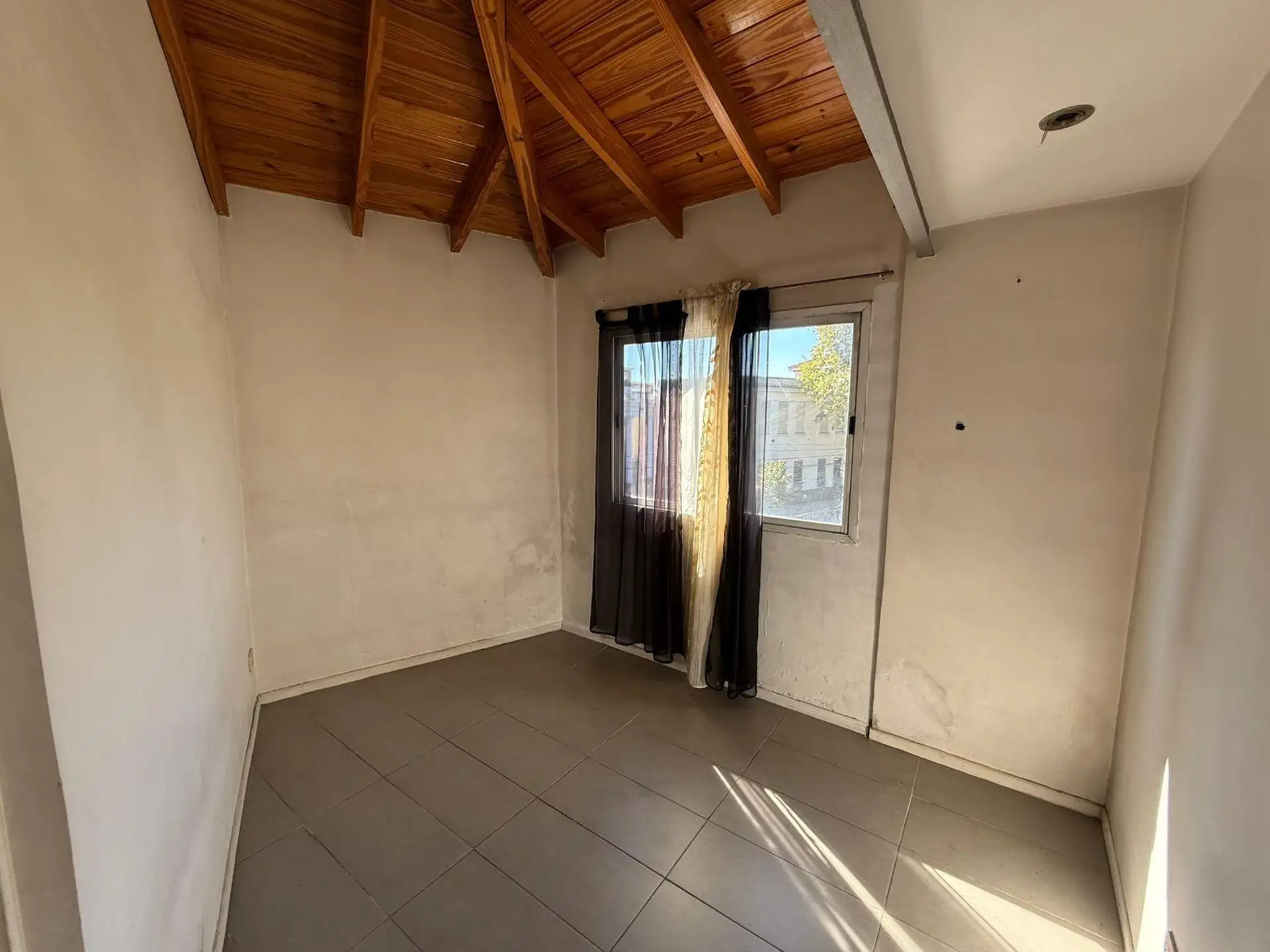Three-room apartment with a balcony at the front and terrace access, on the second floor accessed by stairs in a small building. The unit has a living area with an integrated kitchen, gas cooktop, extractor hood and natural ventilation, plus large windows with an open view. It includes two bedrooms, one with a wardrobe and cold-air A/C, and a second smaller bedroom without a wardrobe; the full bathroom has an extractor. The apartment is empty, with curtains available to keep or remove, and there