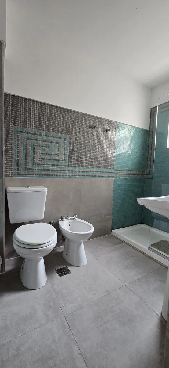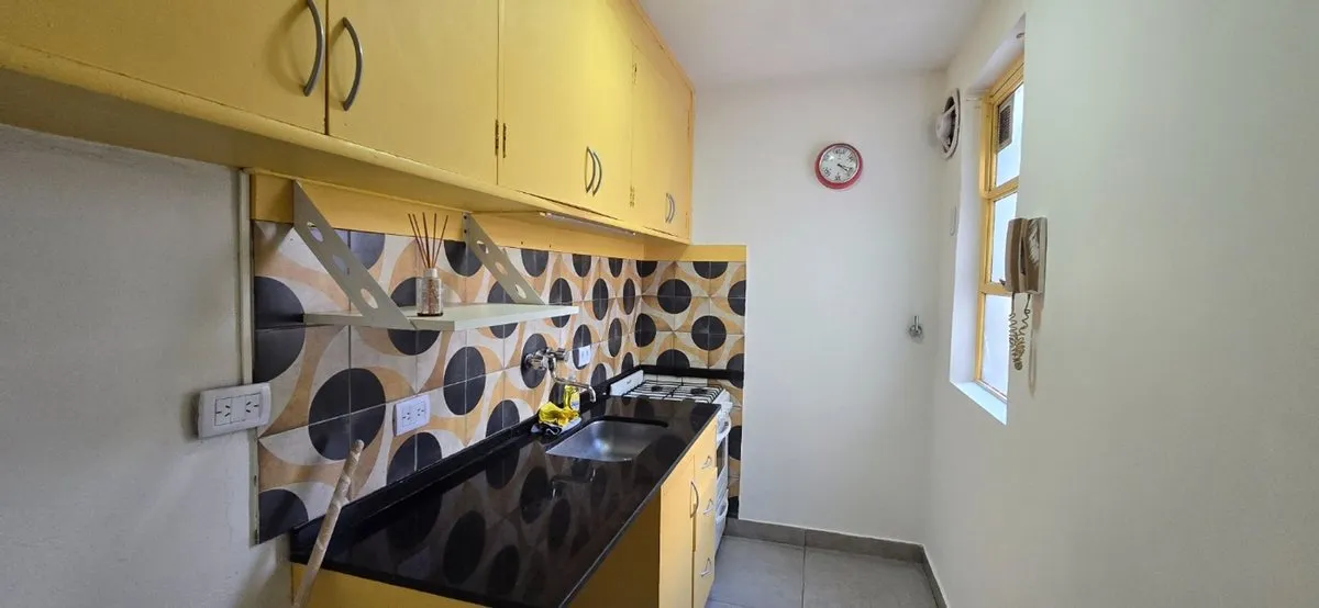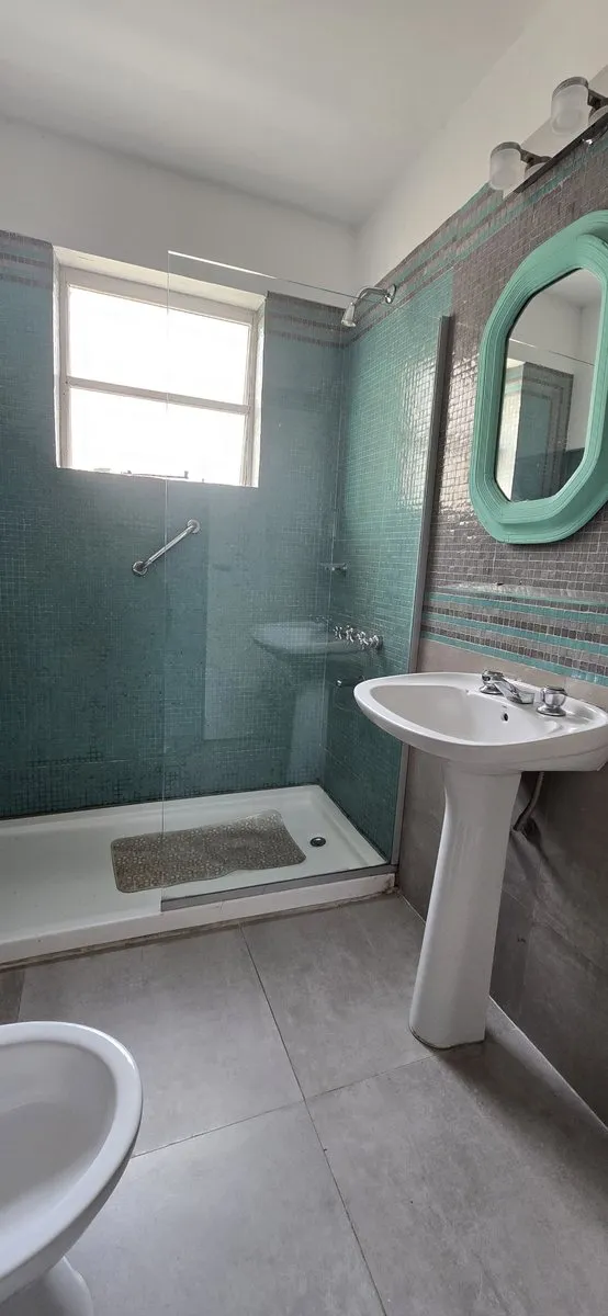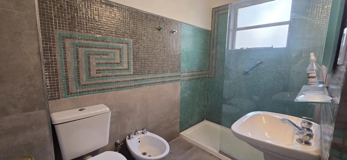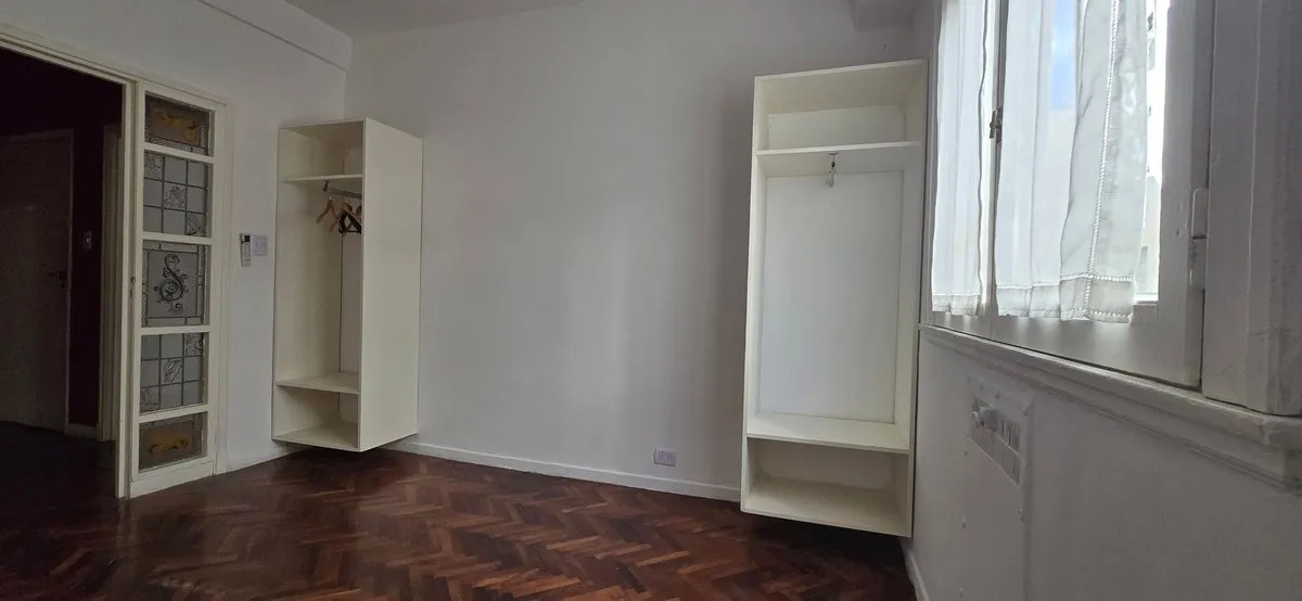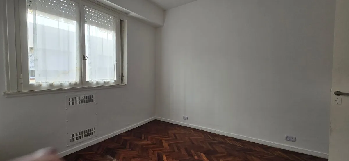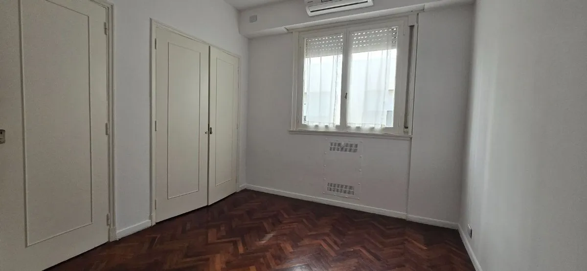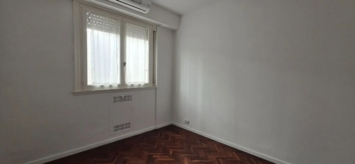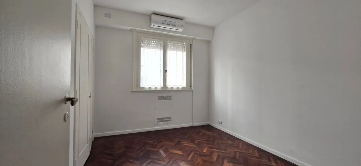 Three-room apartment on the 2nd floor at the rear of the building (courtyard-facing), located between Mexico and Chile. The unit includes a living room, two bedrooms, a renovated bathroom with shower enclosure and exterior ventilation, and parquet floors in good condition. Each room has hot/cold air conditioning; the independent kitchen has gas oven and a lower-cabinet connection for a washing machine. Central hot water is provided by a boiler, with a storage room in the basement. Metrobus along