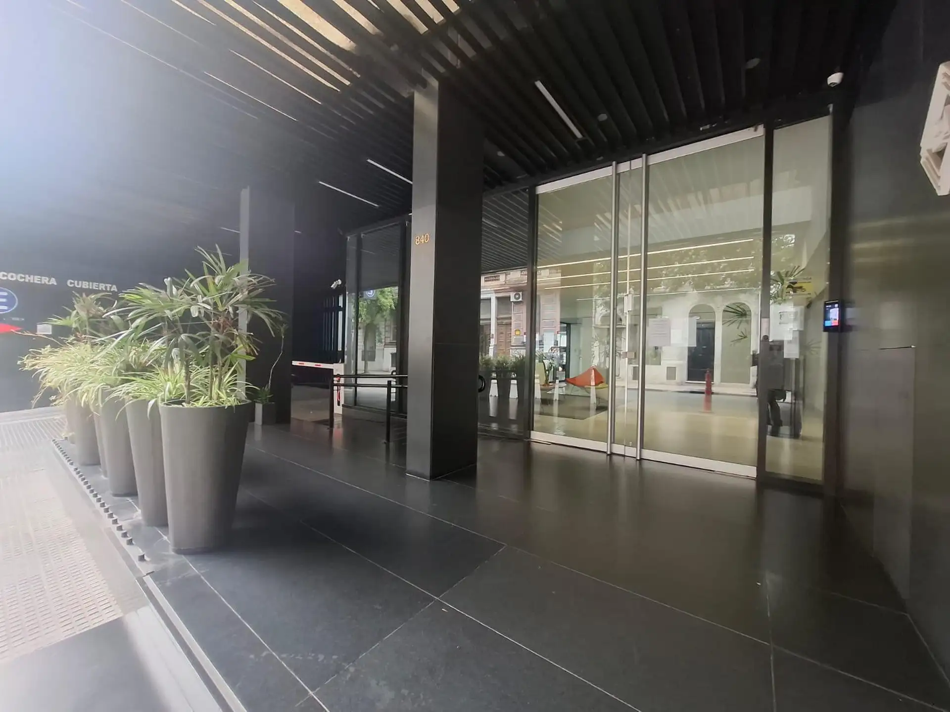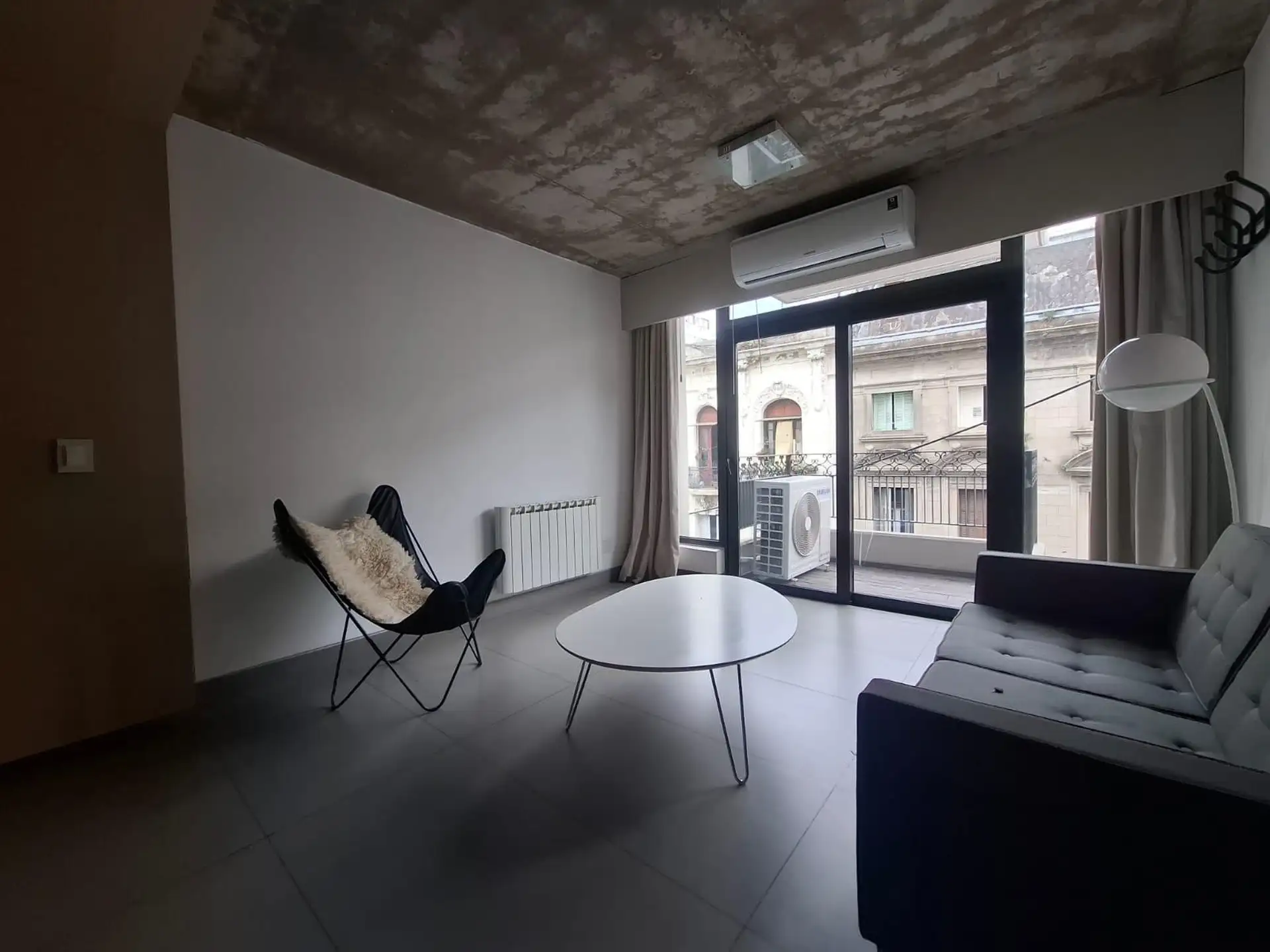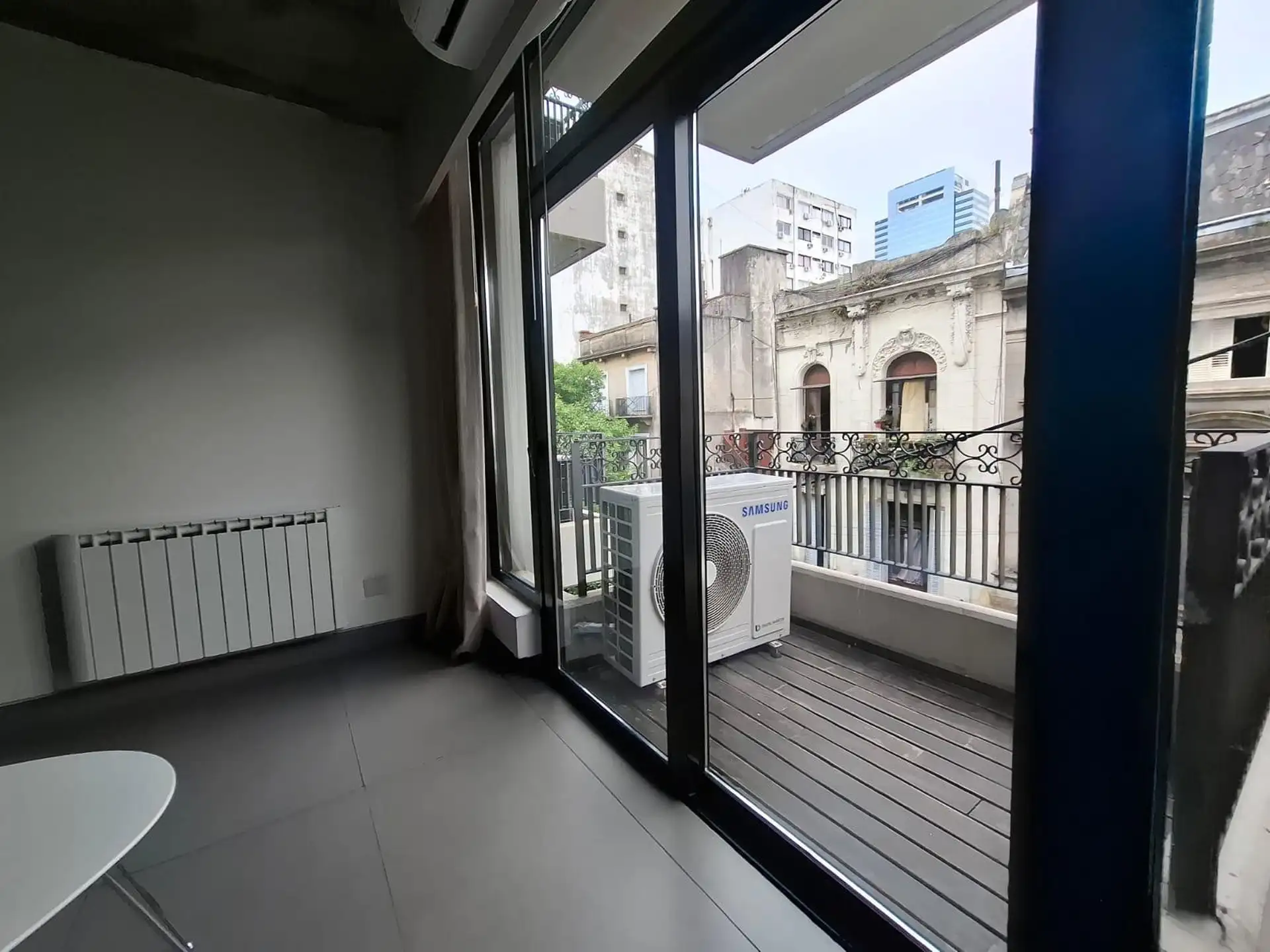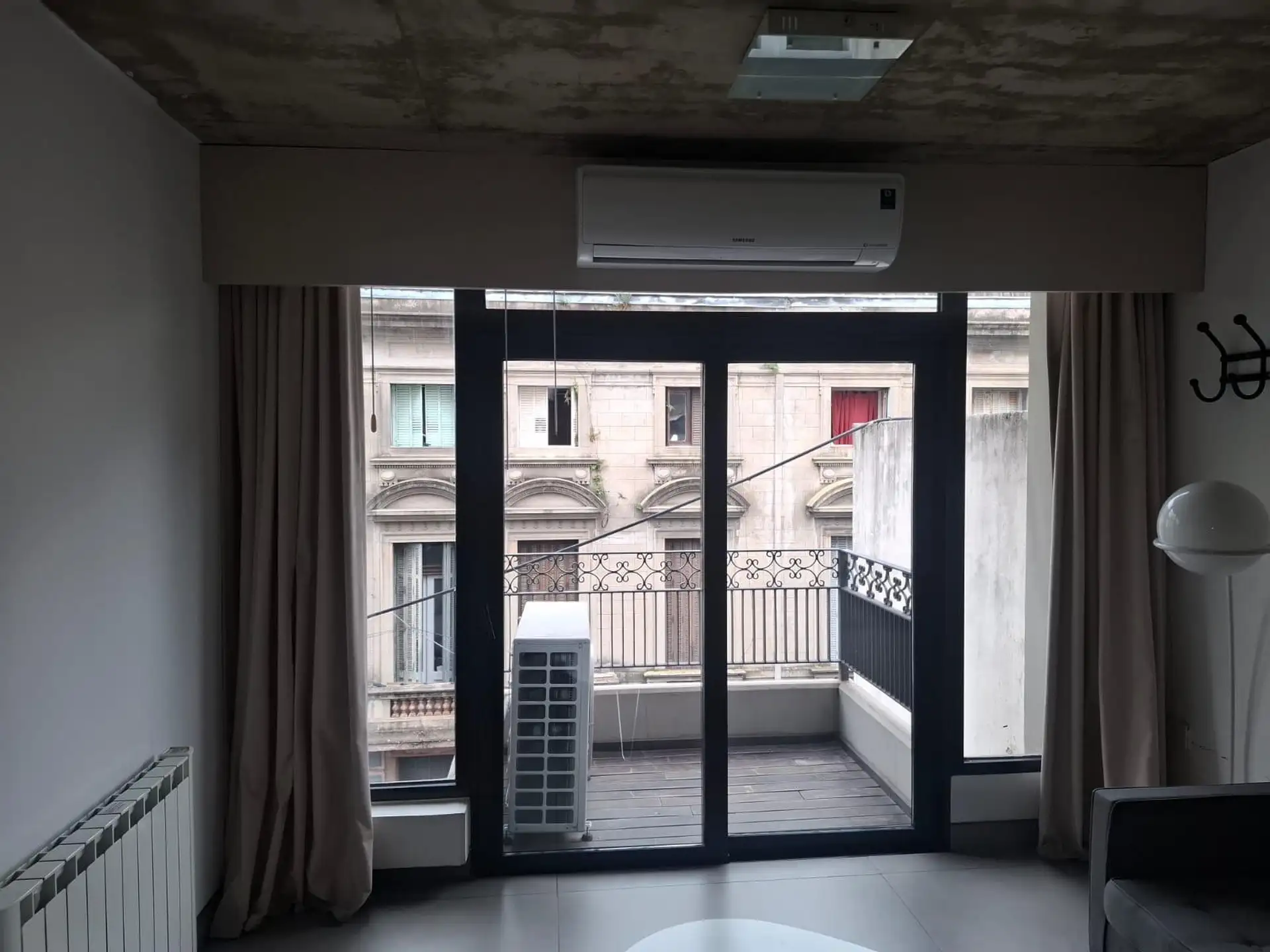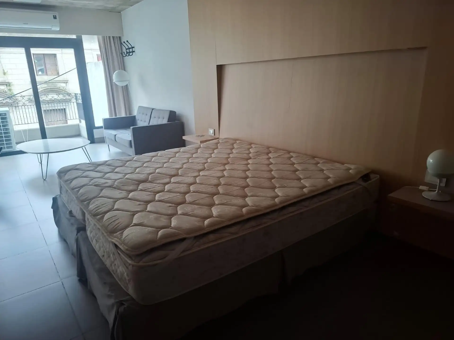 Studio apartment for rent on Calle México and Piedras (San Telmo, Buenos Aires). Located on a high floor with elevator, courtyard-facing (contrafrente) and north-facing orientation. Total area is approximately 48 m², including 44 m² covered; the unit has an equipped kitchen with upper and lower cabinets, a main room with built-in storage and a full bathroom.