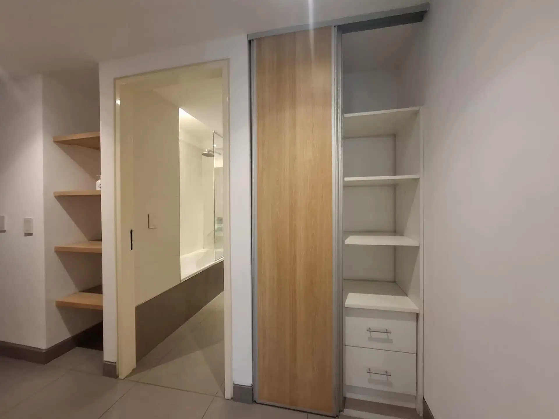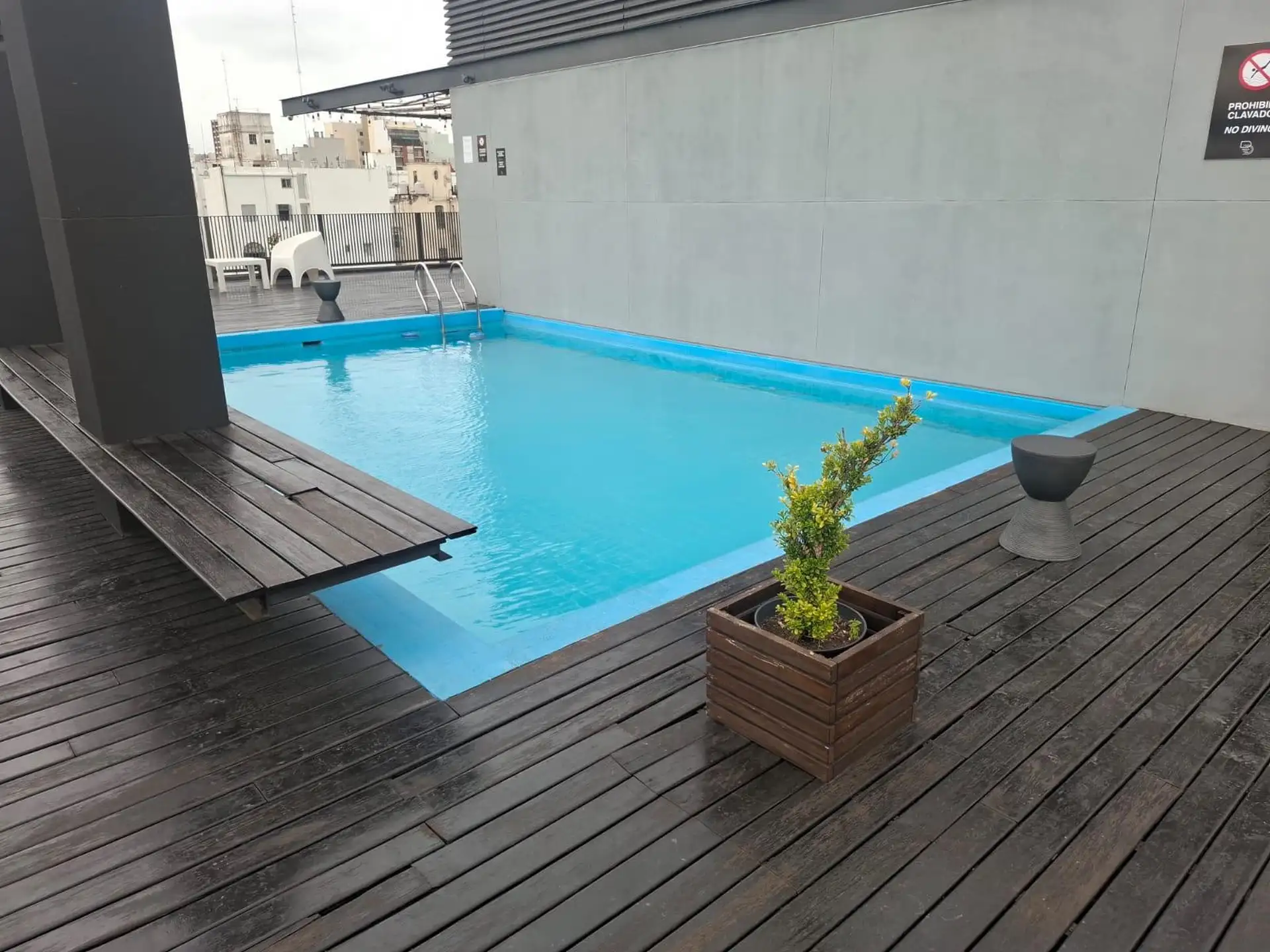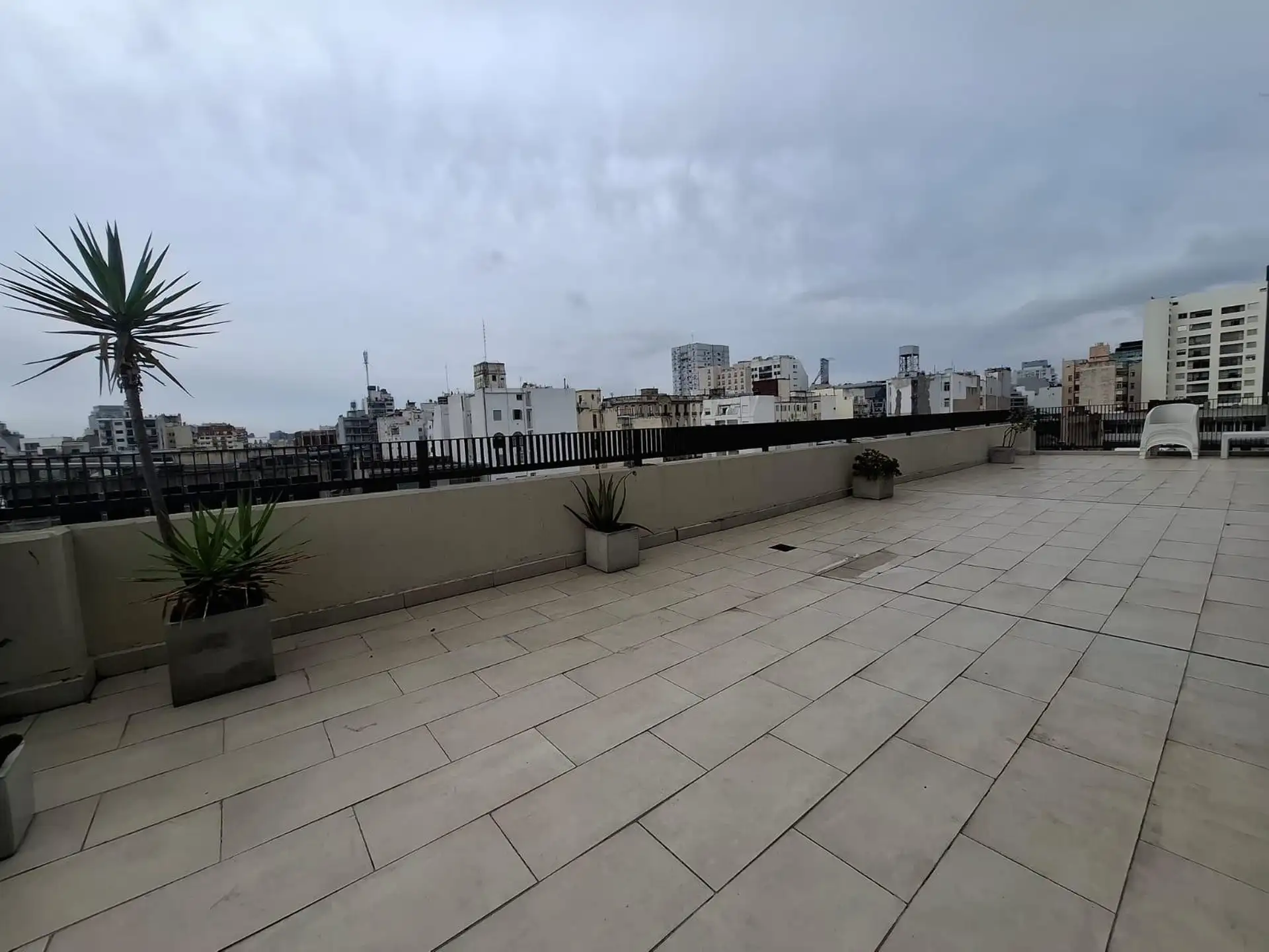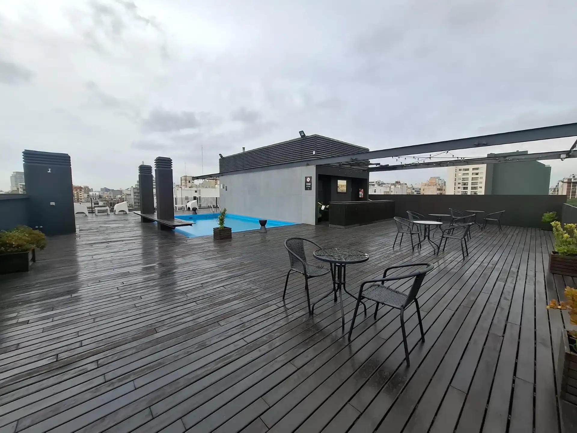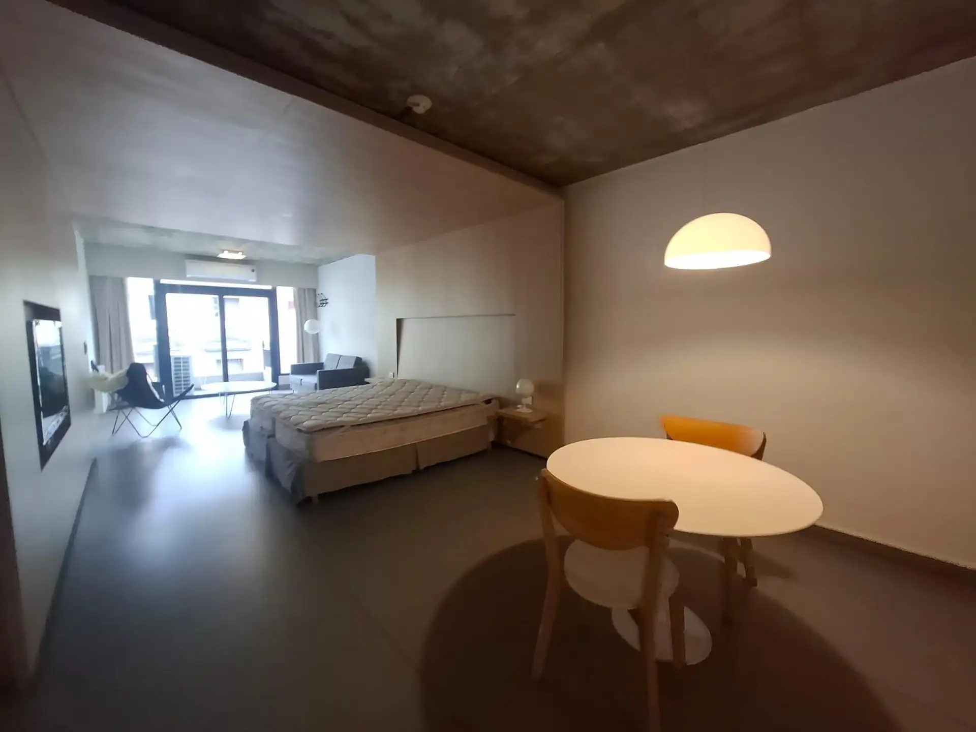 Studio apartment for rent on Calle México and Piedras (San Telmo, Buenos Aires). Located on a high floor with elevator, courtyard-facing (contrafrente) and north-facing orientation. Total area is approximately 48 m², including 44 m² covered; the unit has an equipped kitchen with upper and lower cabinets, a main room with built-in storage and a full bathroom.