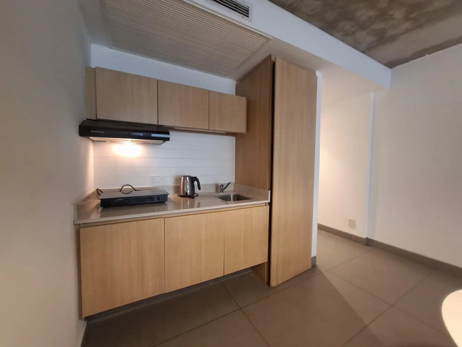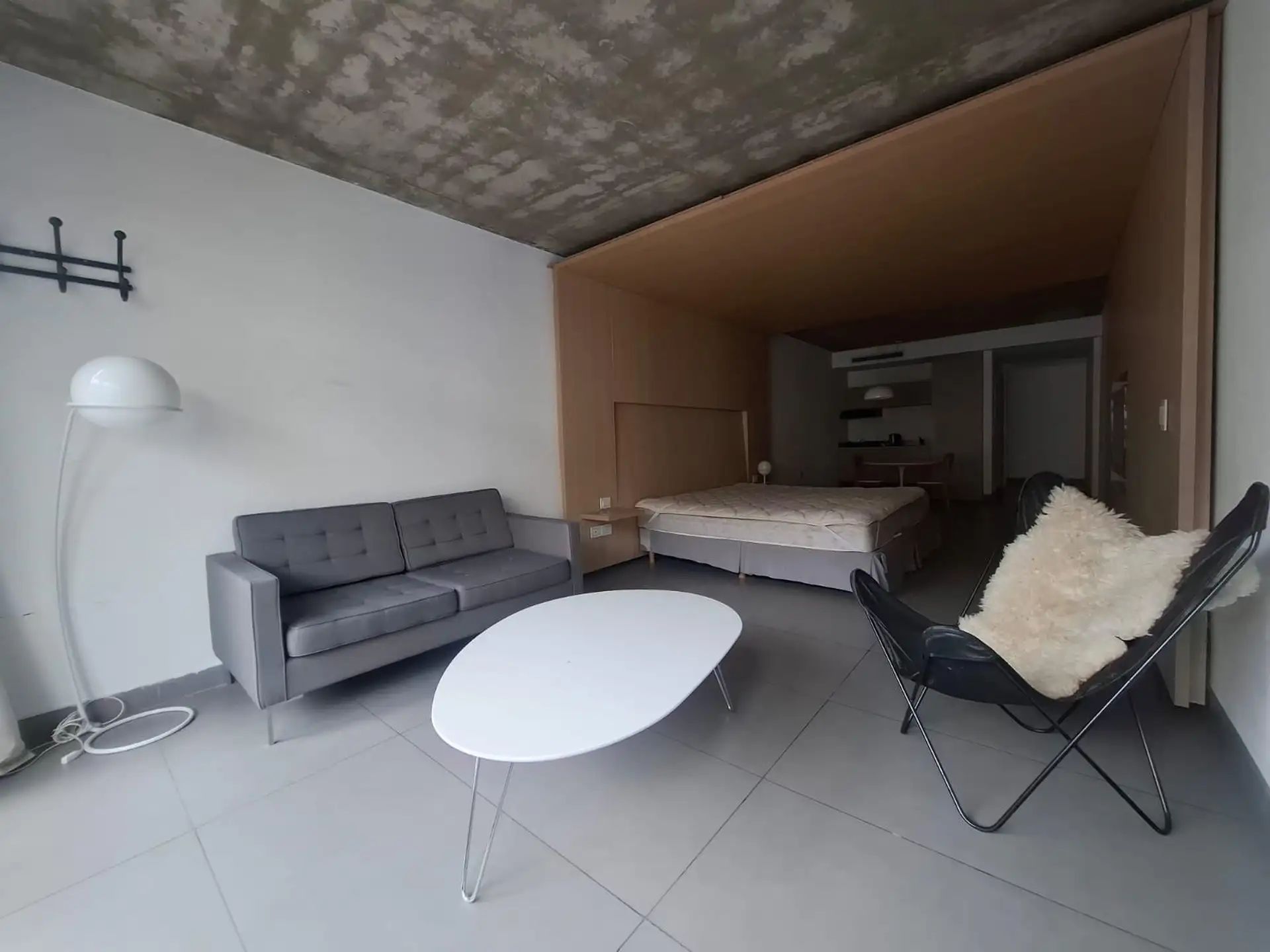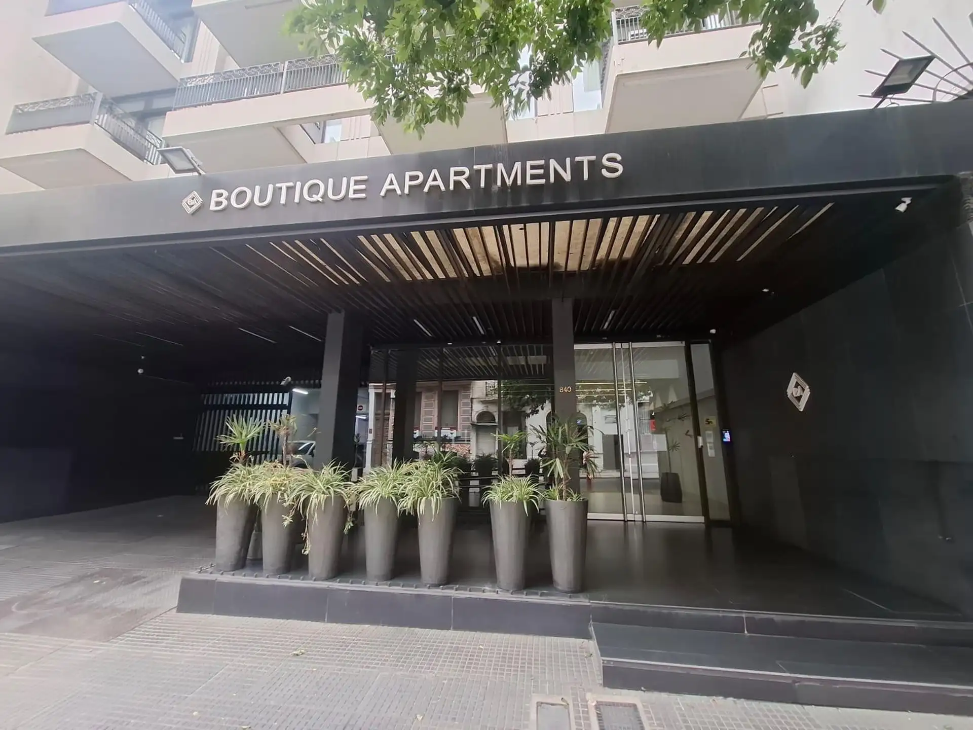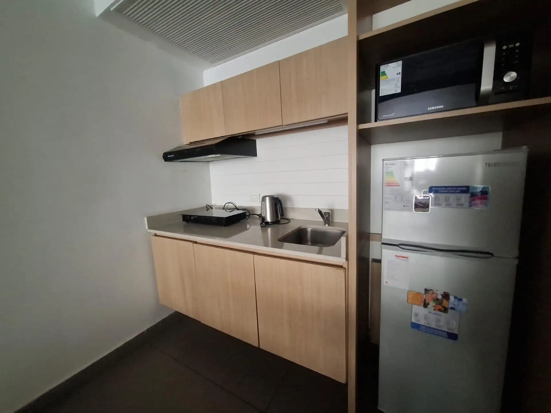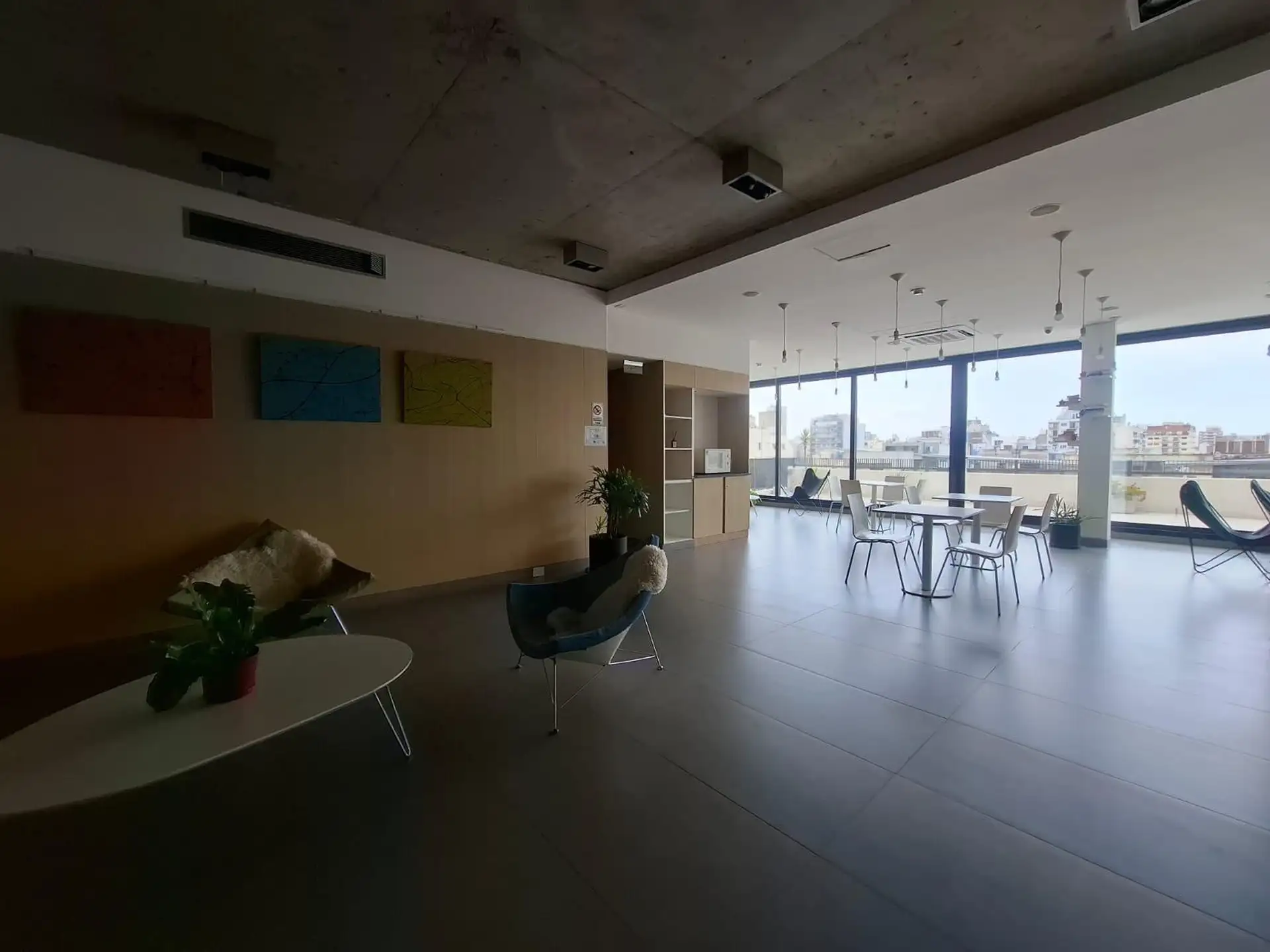 Studio apartment for rent on Calle México and Piedras (San Telmo, Buenos Aires). Located on a high floor with elevator, courtyard-facing (contrafrente) and north-facing orientation. Total area is approximately 48 m², including 44 m² covered; the unit has an equipped kitchen with upper and lower cabinets, a main room with built-in storage and a full bathroom.