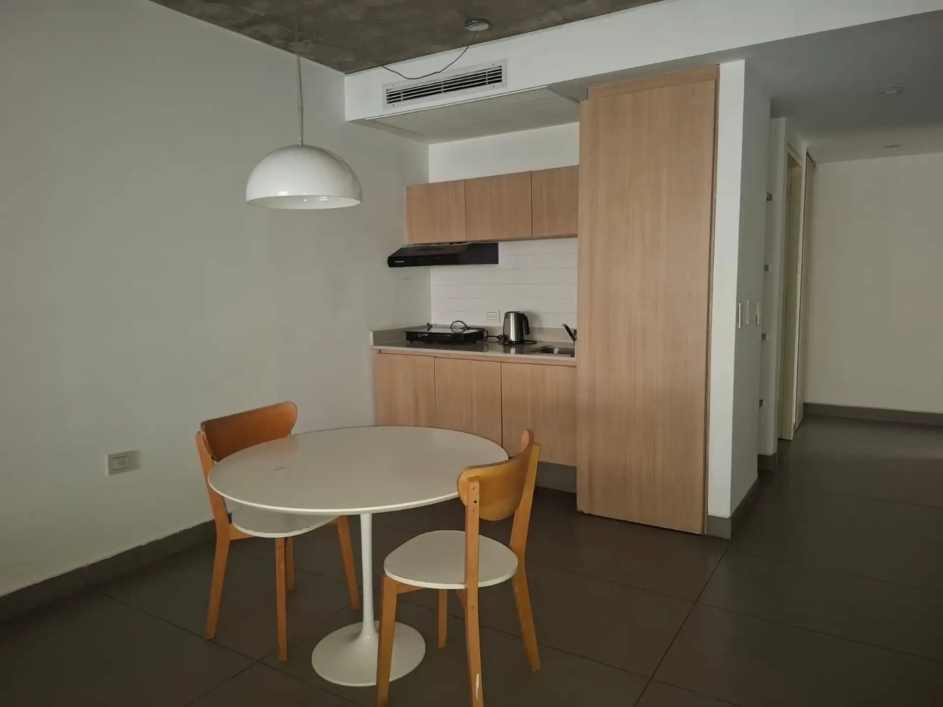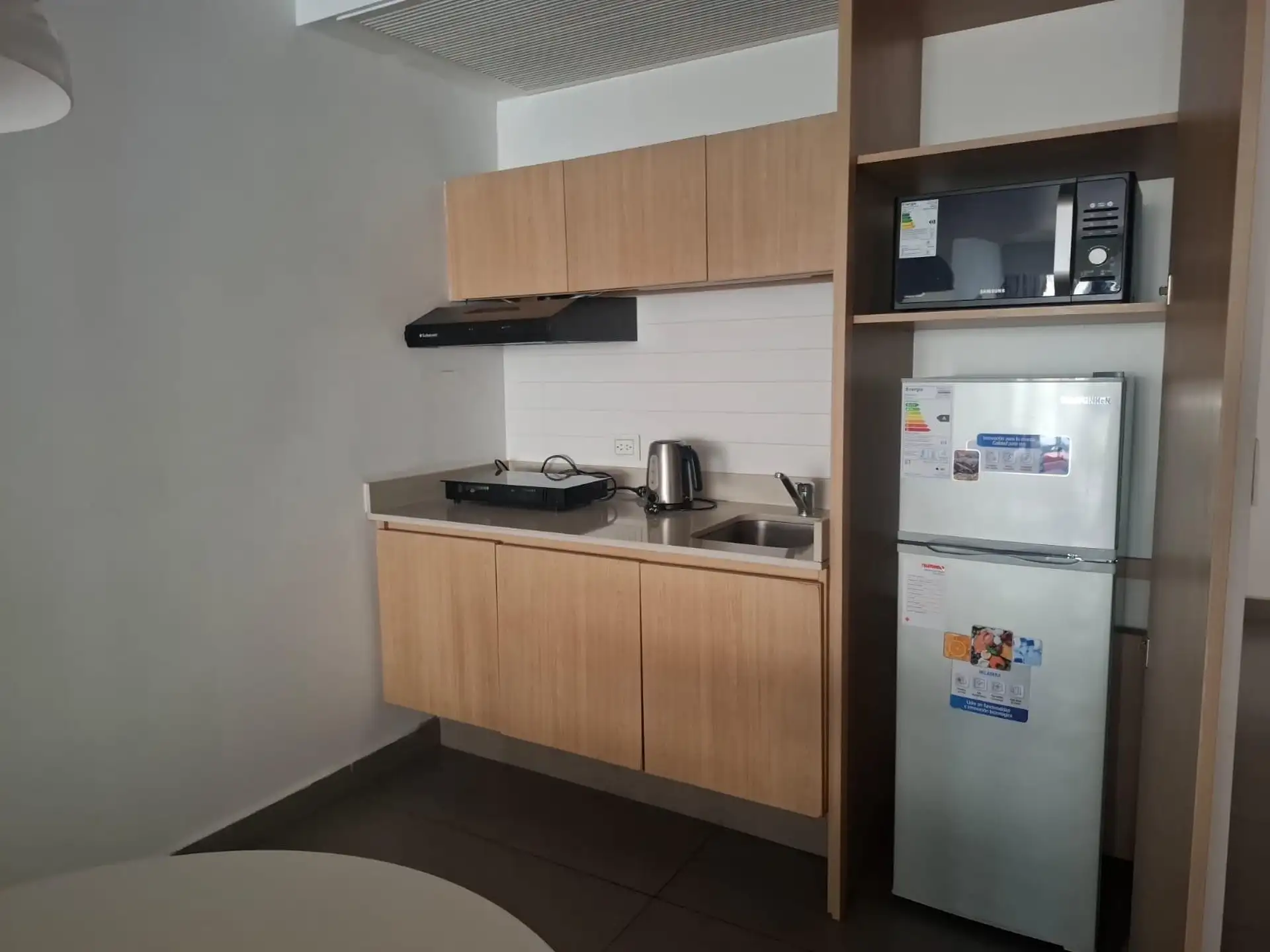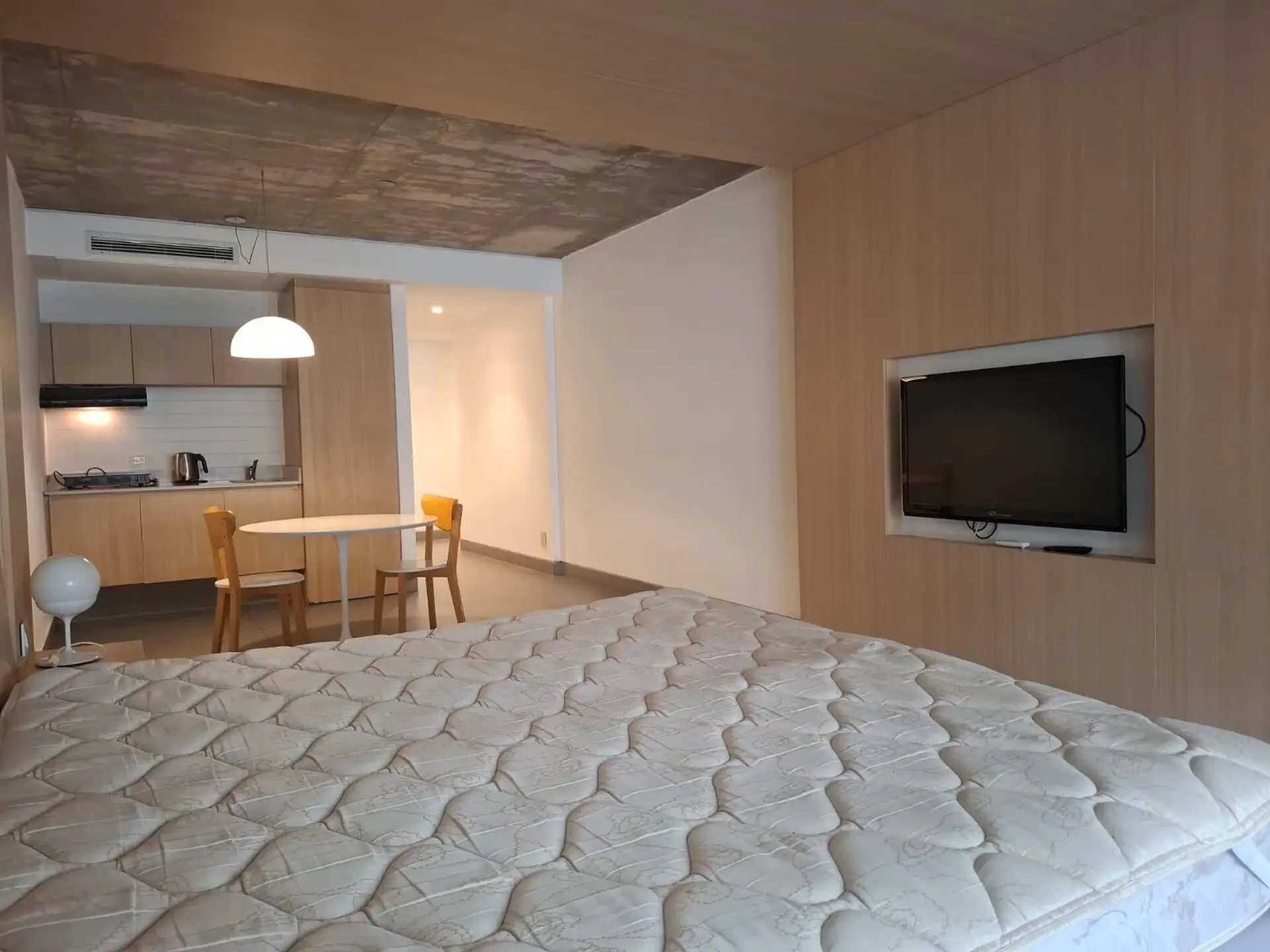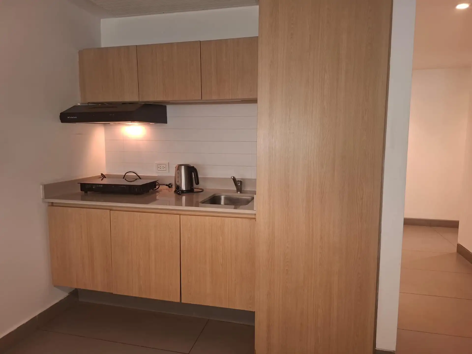 Studio apartment for rent on Calle México and Piedras (San Telmo, Buenos Aires). Located on a high floor with elevator, courtyard-facing (contrafrente) and north-facing orientation. Total area is approximately 48 m², including 44 m² covered; the unit has an equipped kitchen with upper and lower cabinets, a main room with built-in storage and a full bathroom.
