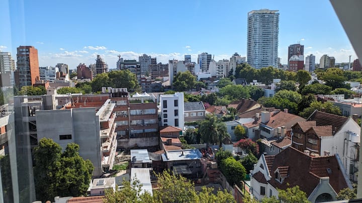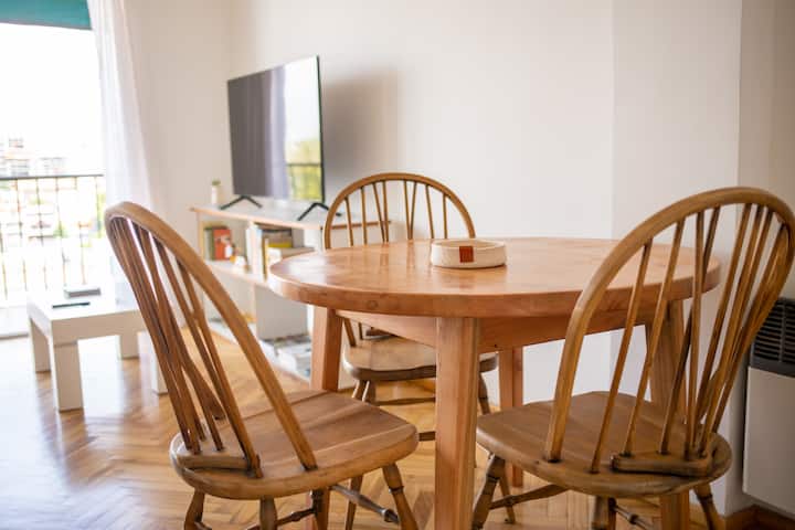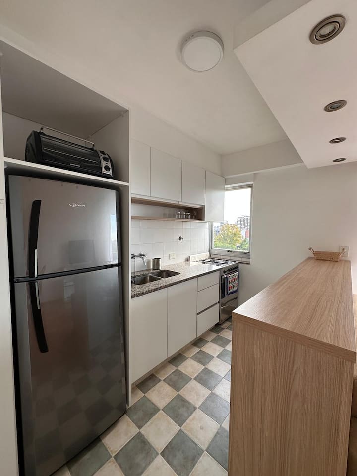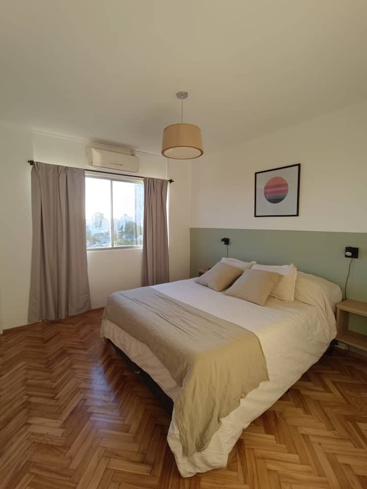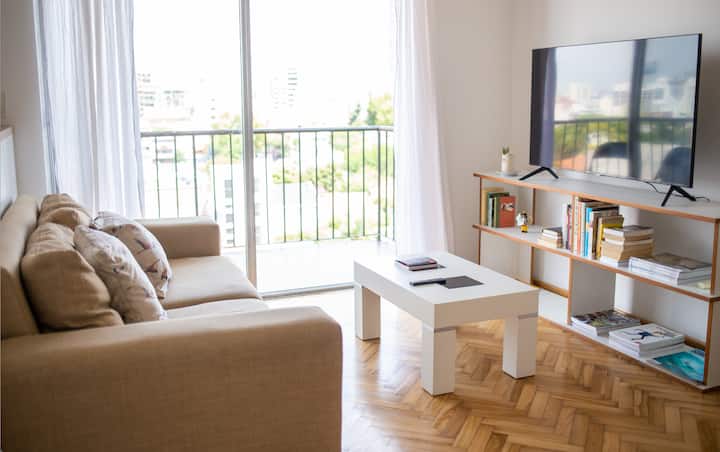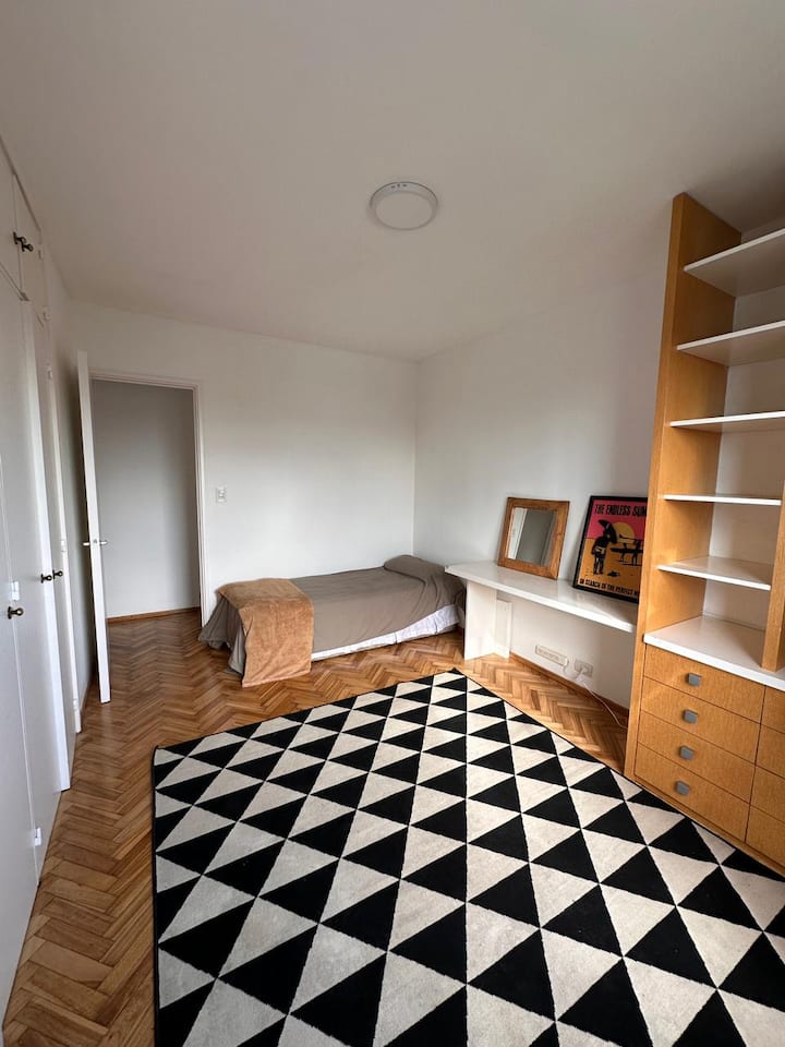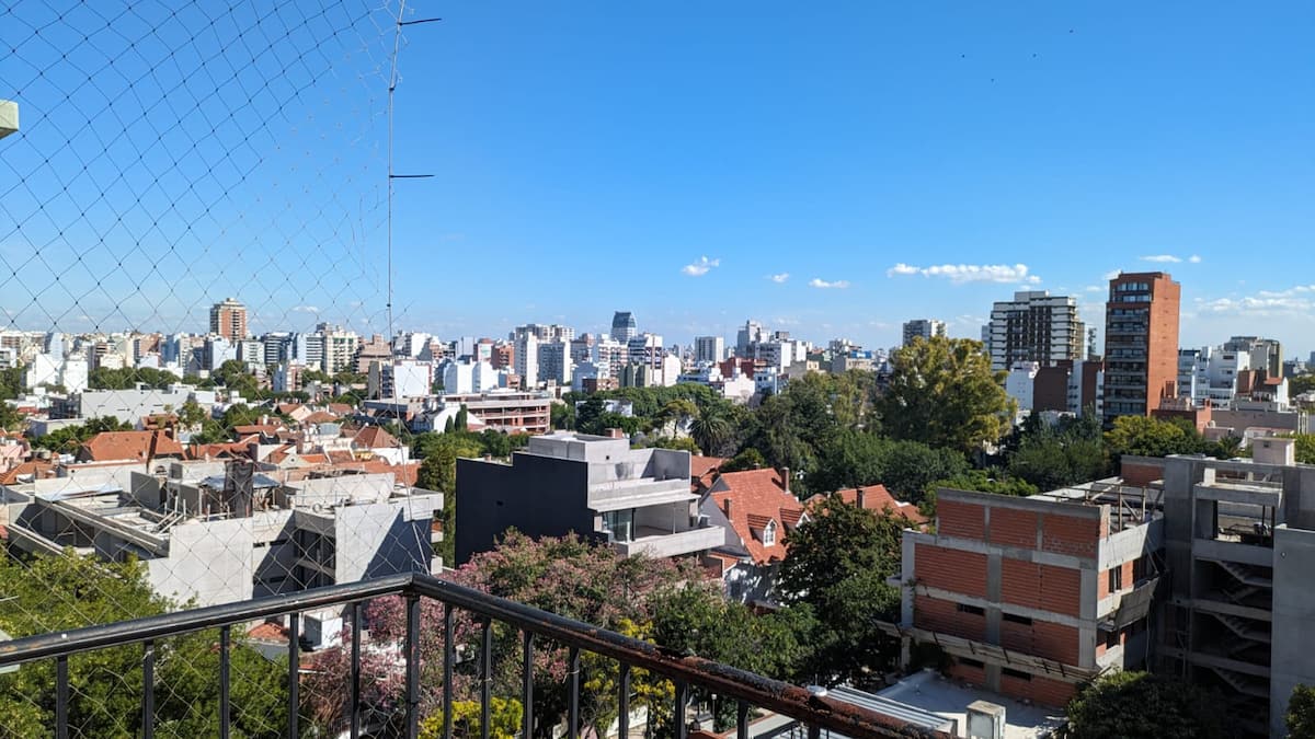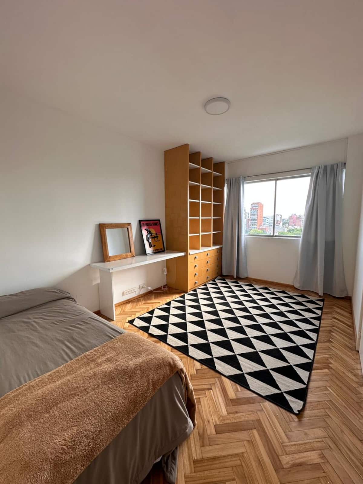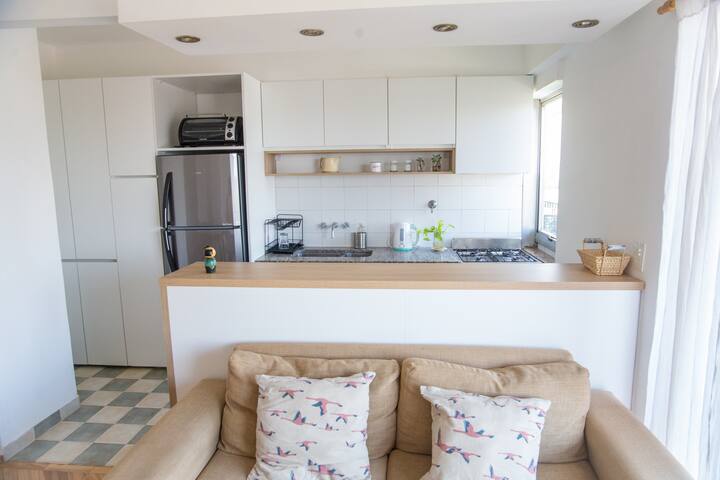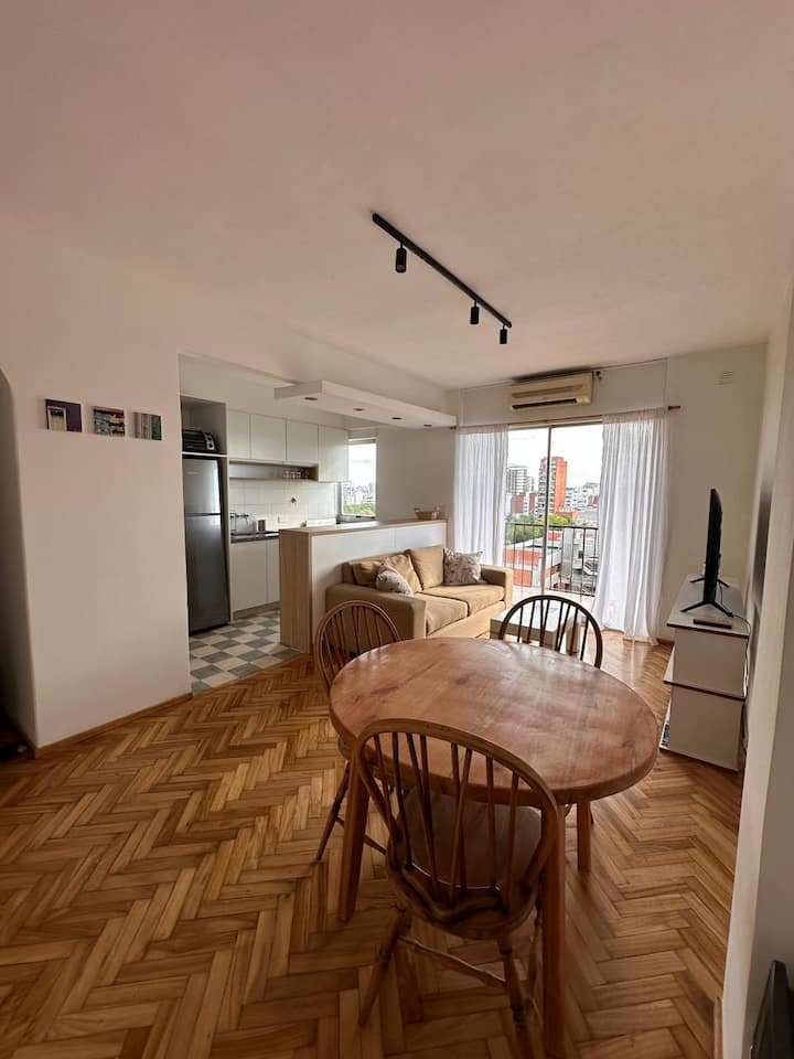 Two-bedroom apartment in Núñez, Buenos Aires, with 65 m² and recent refurbishment. The living room has a built-in kitchen with a washing machine and a breakfast bar. Both bedrooms include built-in closets, with the second bedroom also featuring a desk. There is an open balcony and clear open views from all spaces.