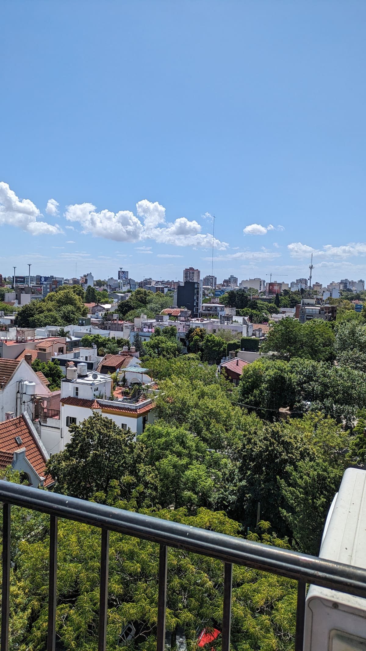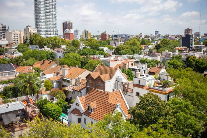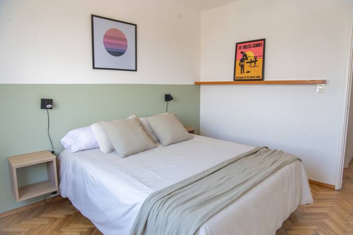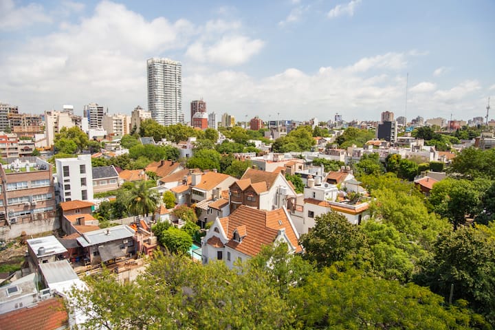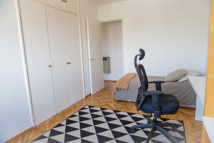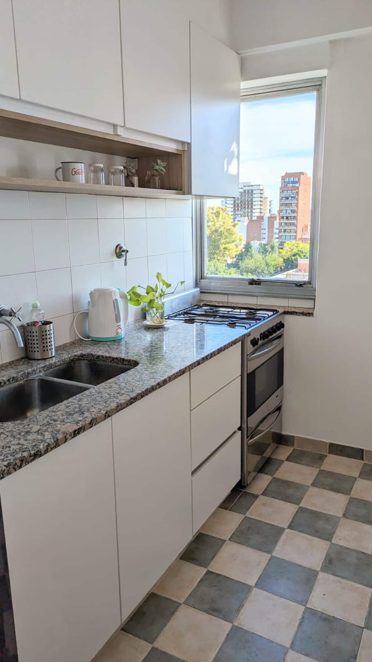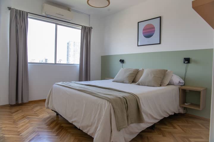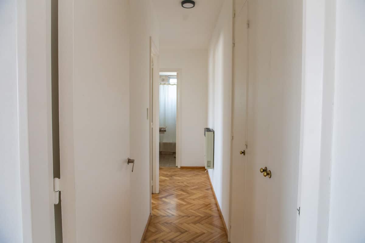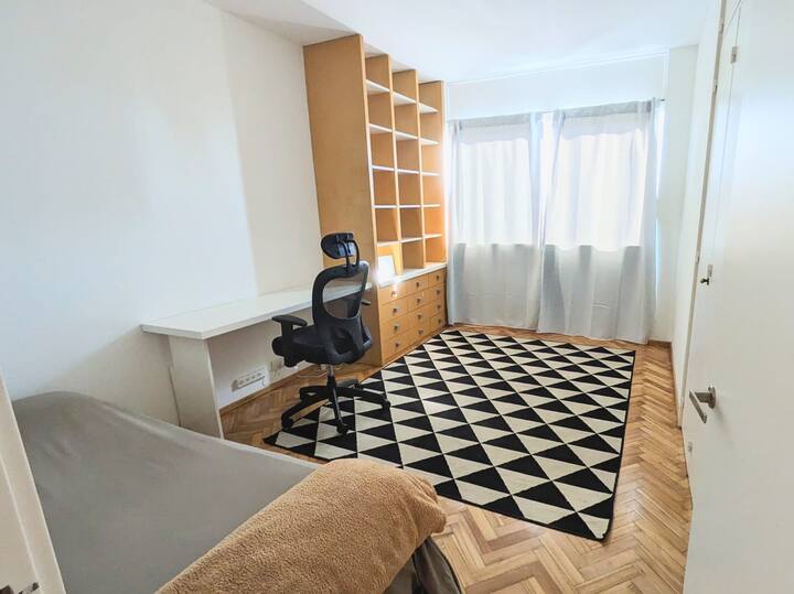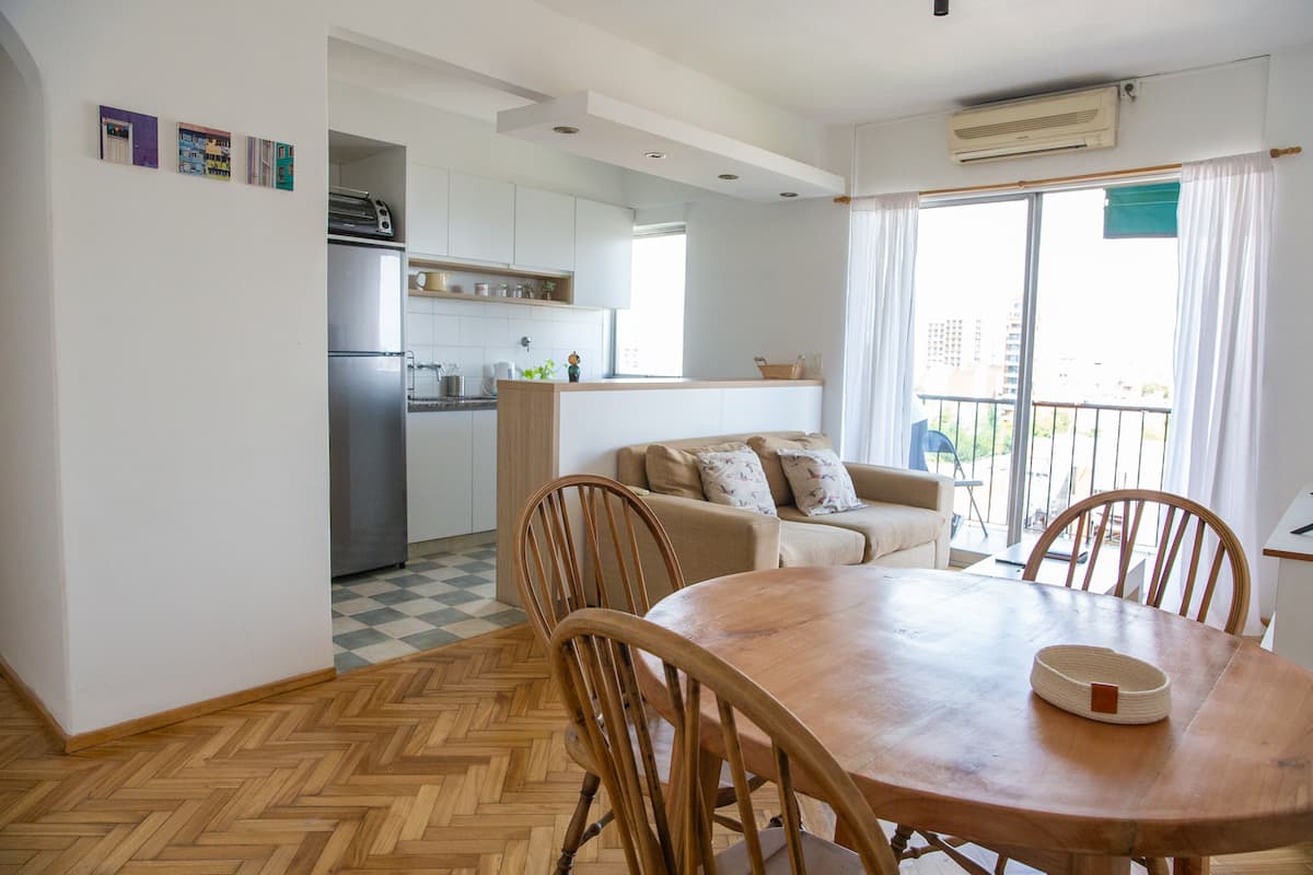 Two-bedroom apartment in Núñez, Buenos Aires, with 65 m² and recent refurbishment. The living room has a built-in kitchen with a washing machine and a breakfast bar. Both bedrooms include built-in closets, with the second bedroom also featuring a desk. There is an open balcony and clear open views from all spaces.