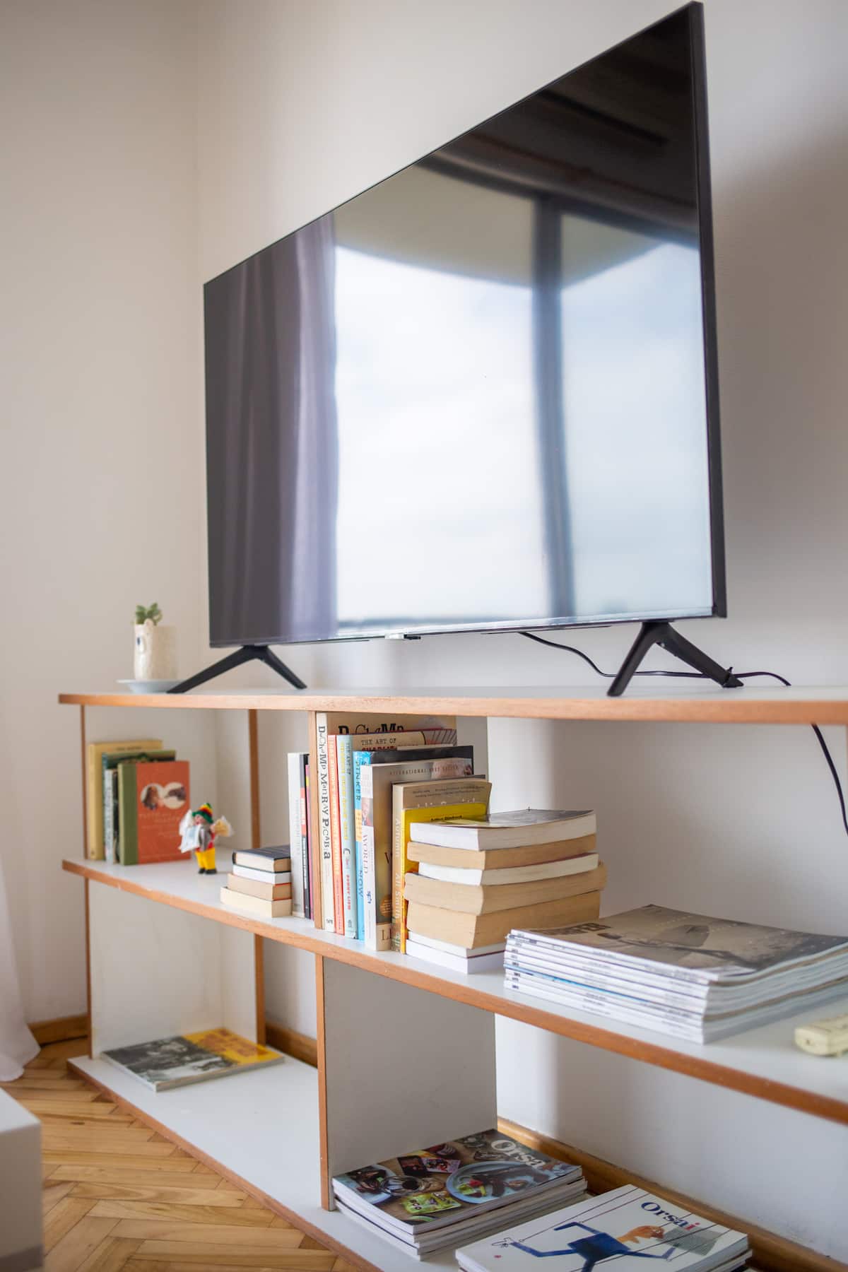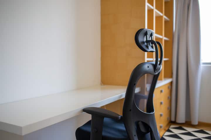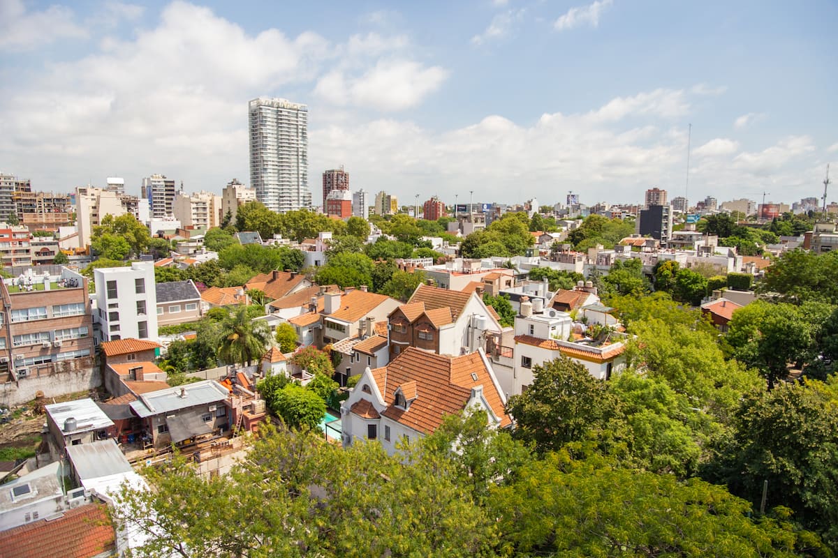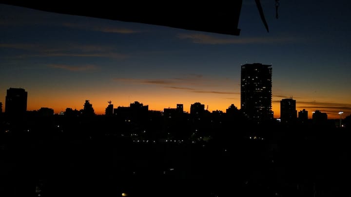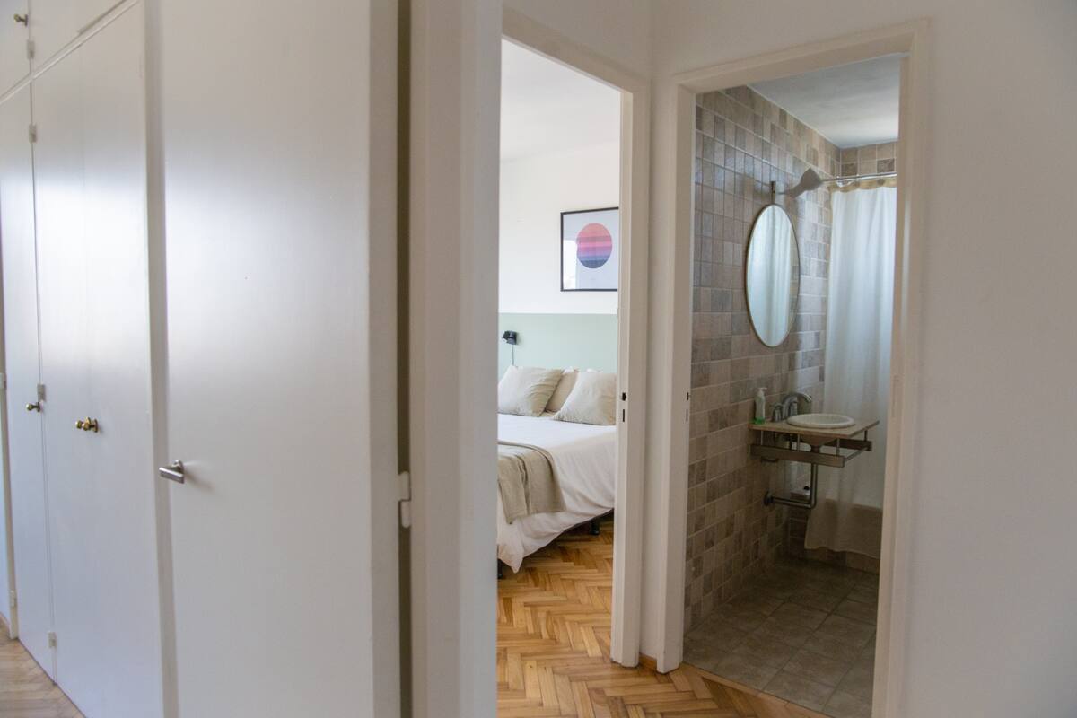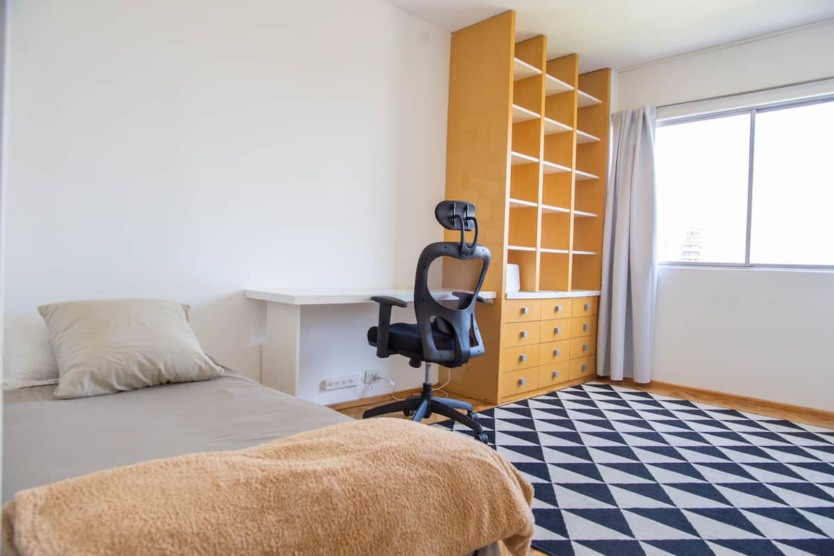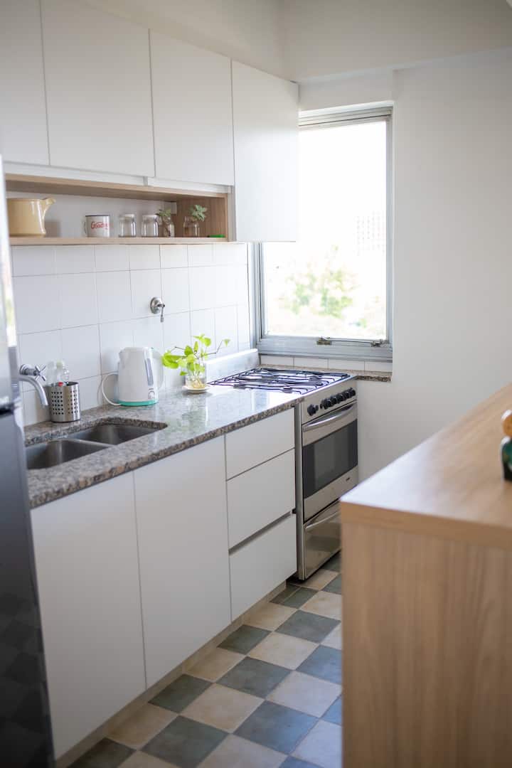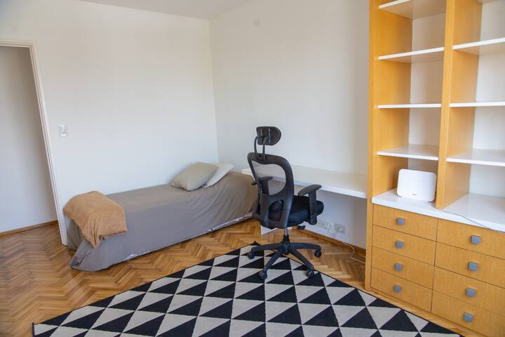 Two-bedroom apartment in Núñez, Buenos Aires, with 65 m² and recent refurbishment. The living room has a built-in kitchen with a washing machine and a breakfast bar. Both bedrooms include built-in closets, with the second bedroom also featuring a desk. There is an open balcony and clear open views from all spaces.
