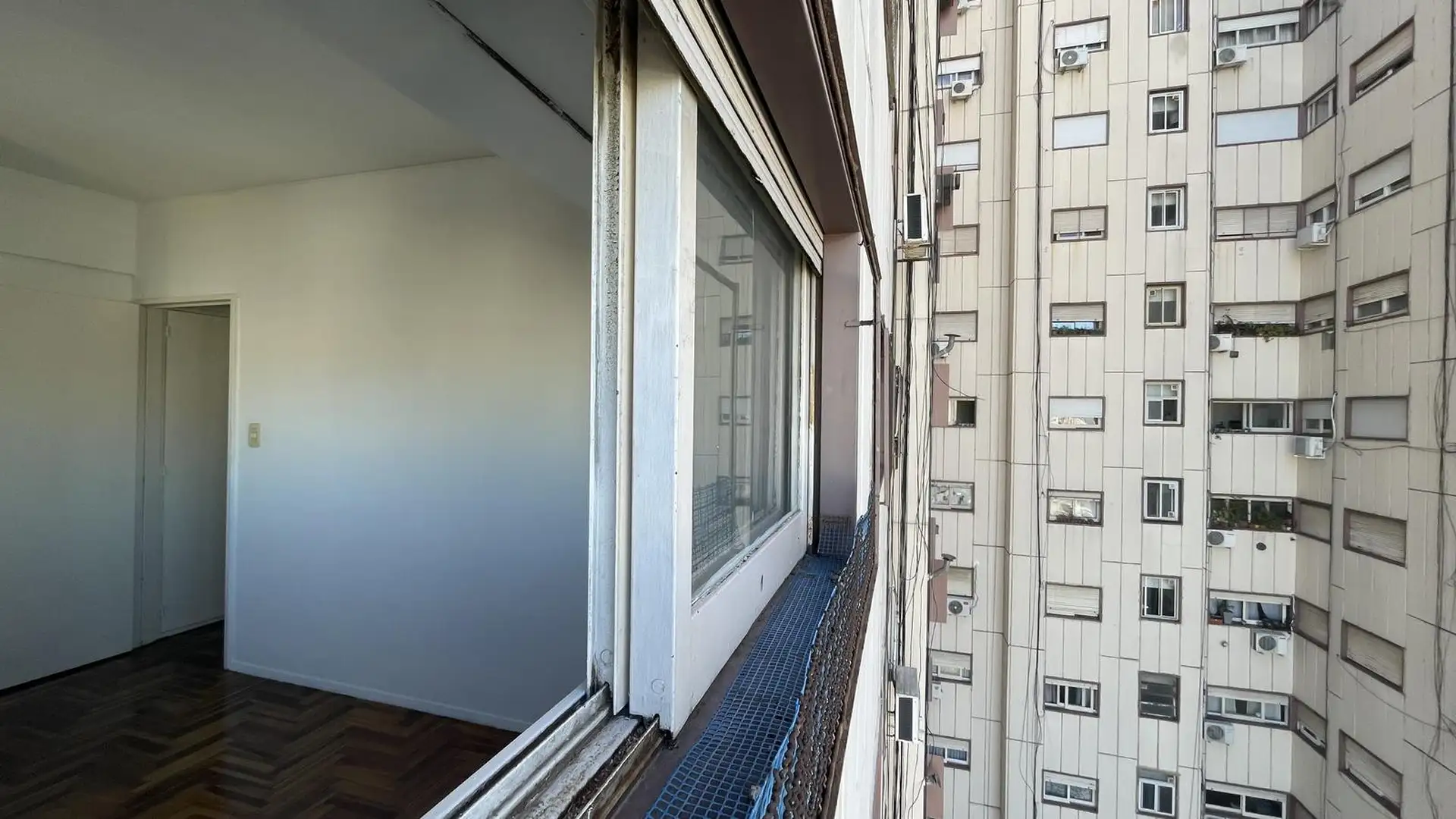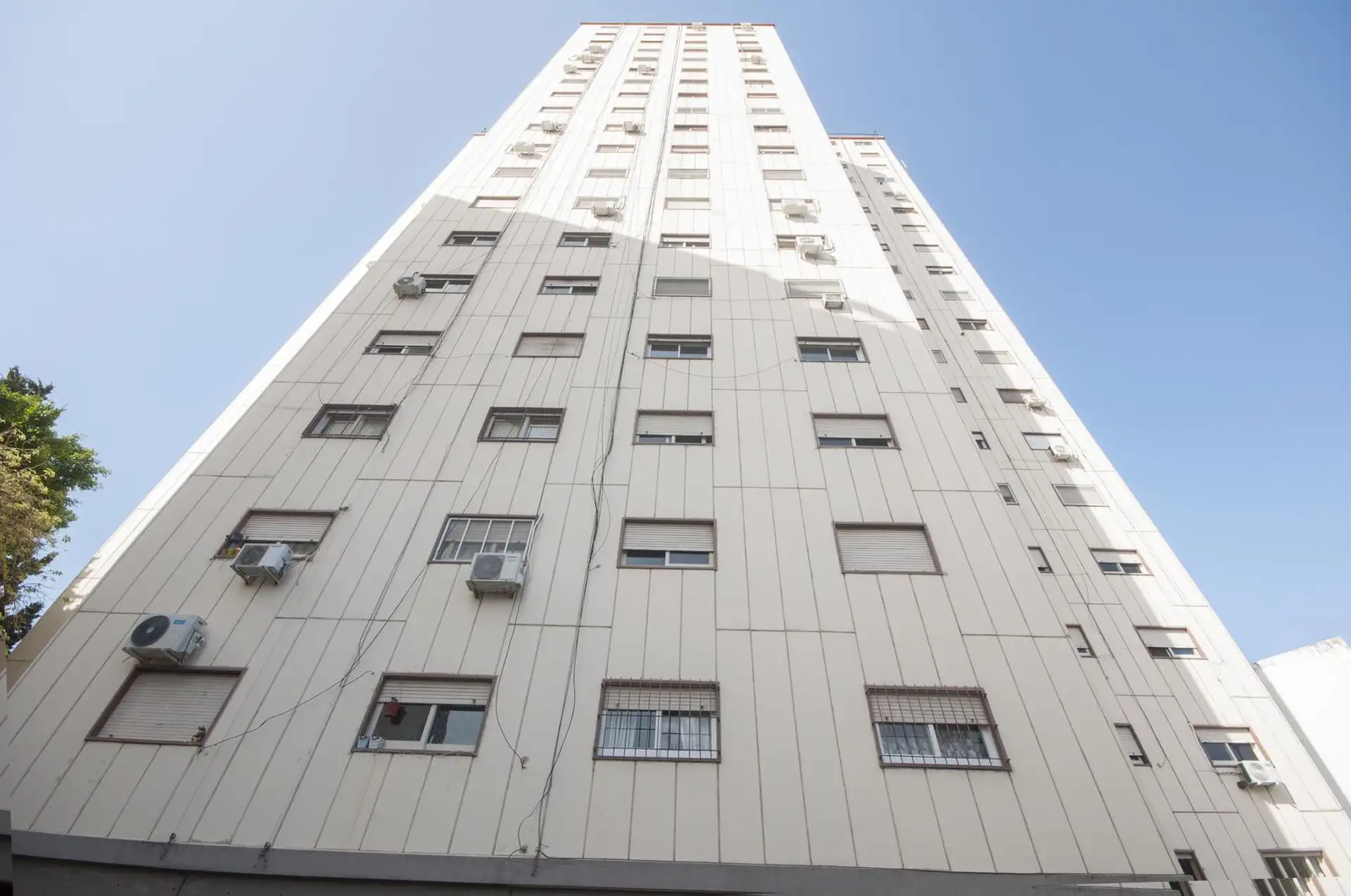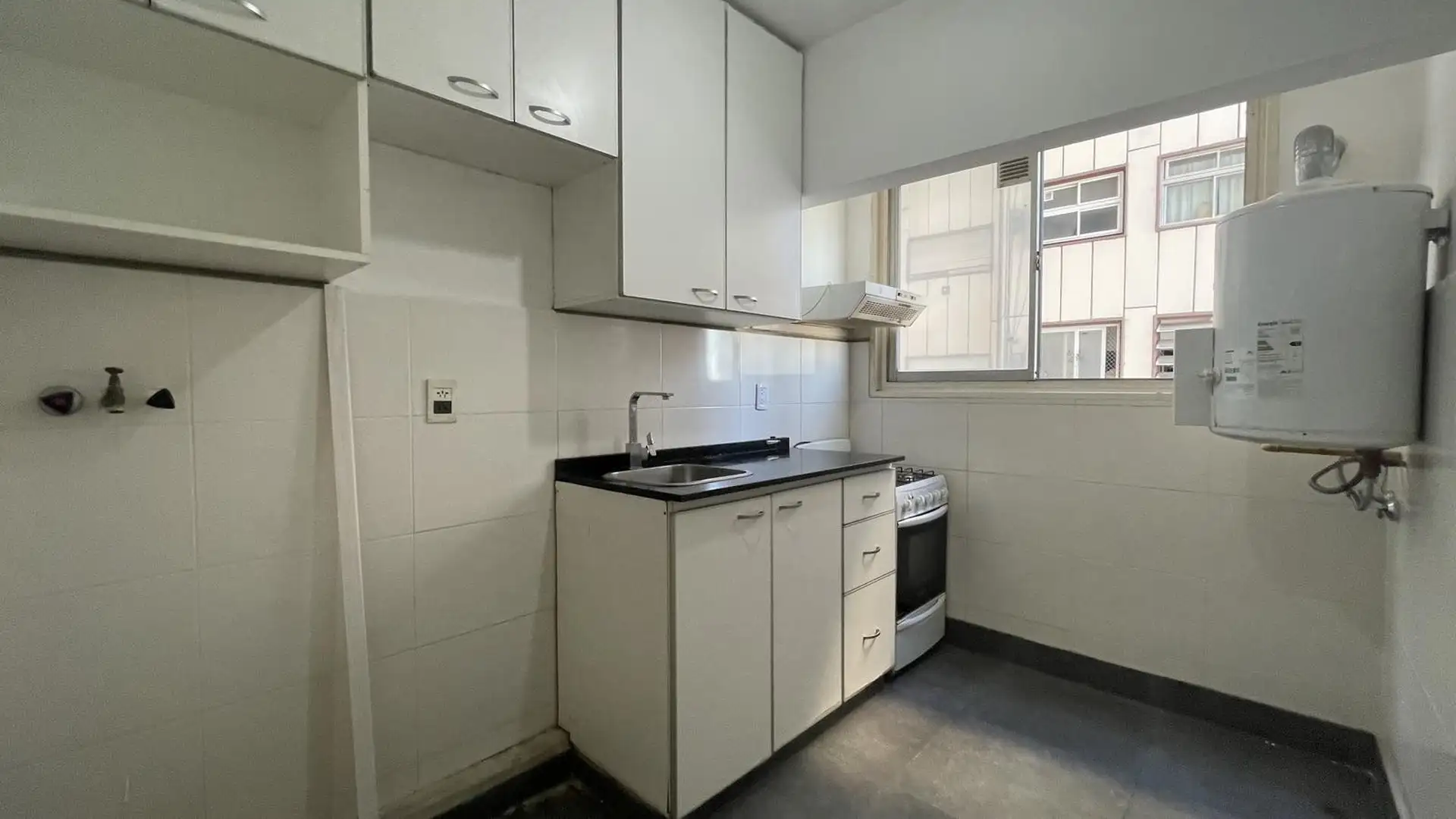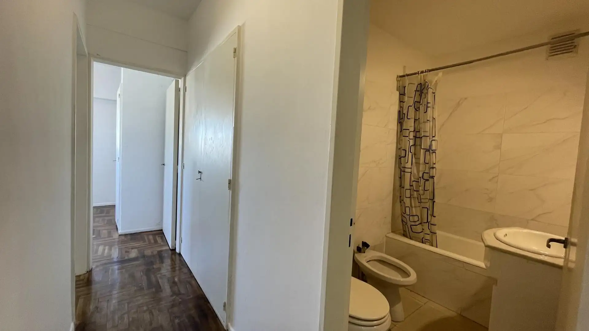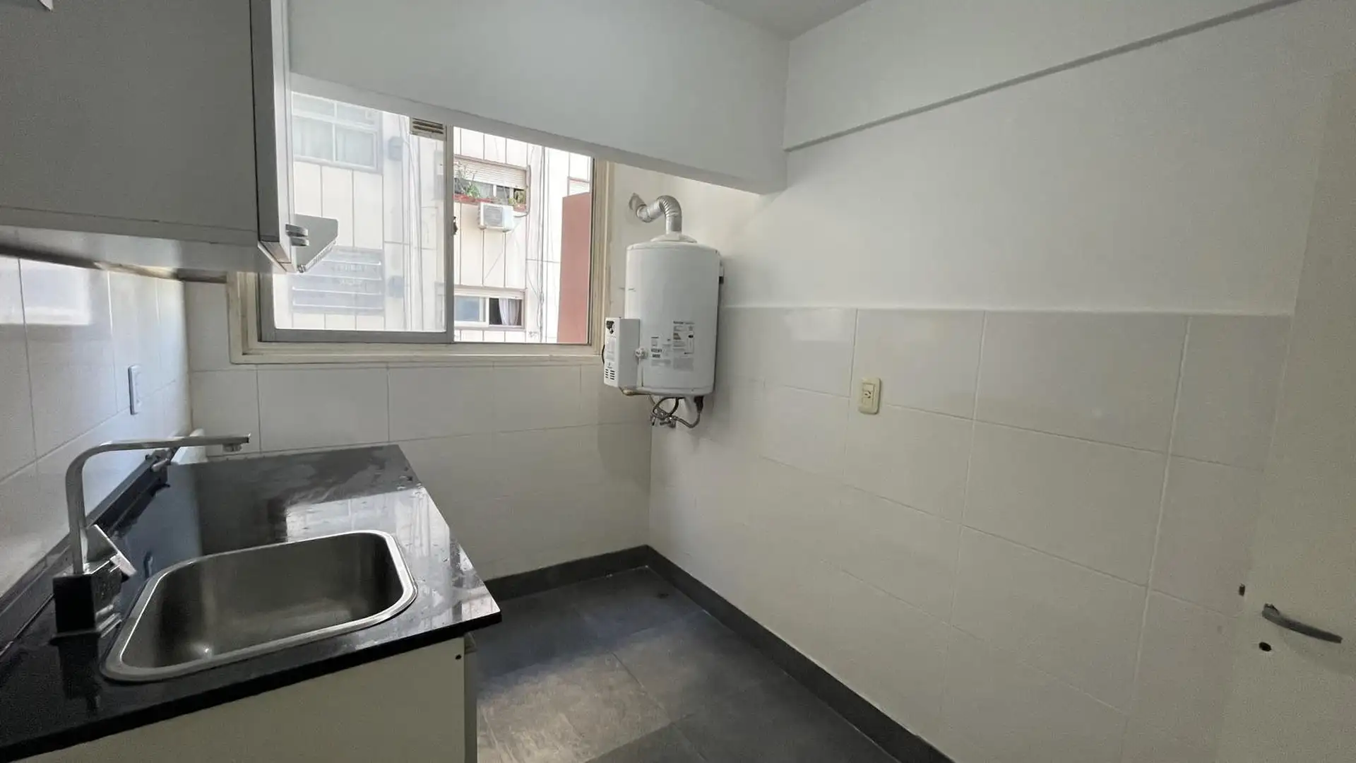 High-floor apartment in Núñez with 2 bedrooms and 3 rooms. The layout includes an entrance hall leading to a living-dining area and an independent kitchen. The kitchen is gas-powered and has a newly installed hot-water system, with space for a breakfast nook or small daily dining area; there is also space and plumbing for a washing machine and room to set up a ceiling drying rack. Living-dining room has recently refinished parquet floors, and there is a full bathroom with a vanity and bathtub. T