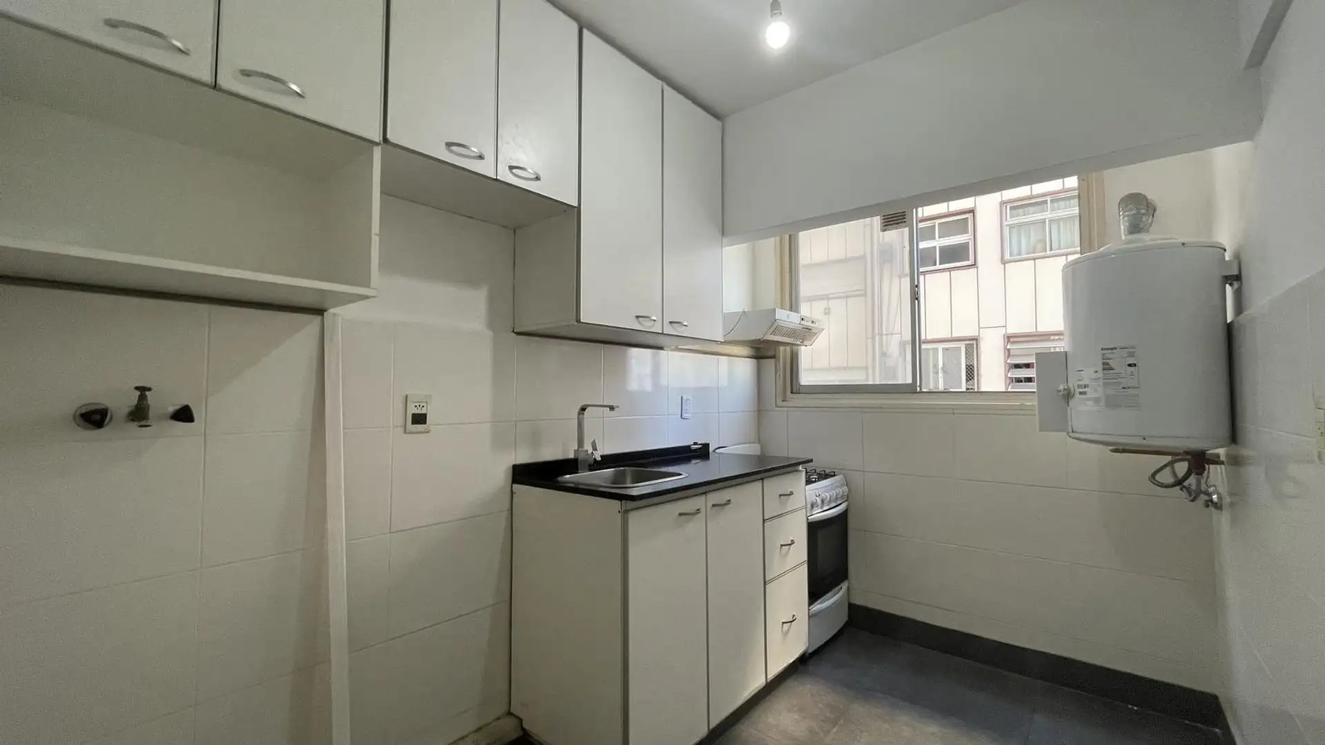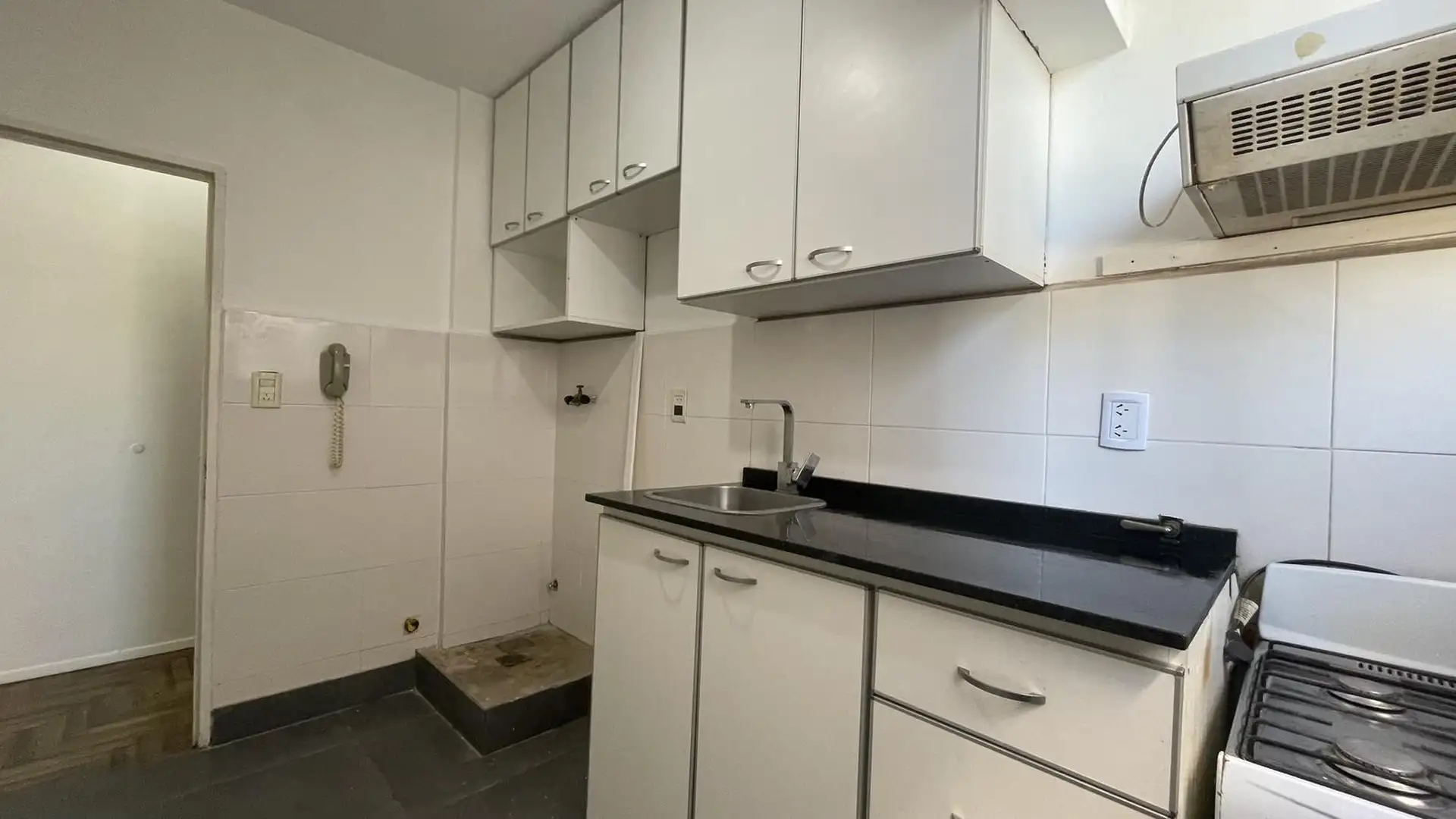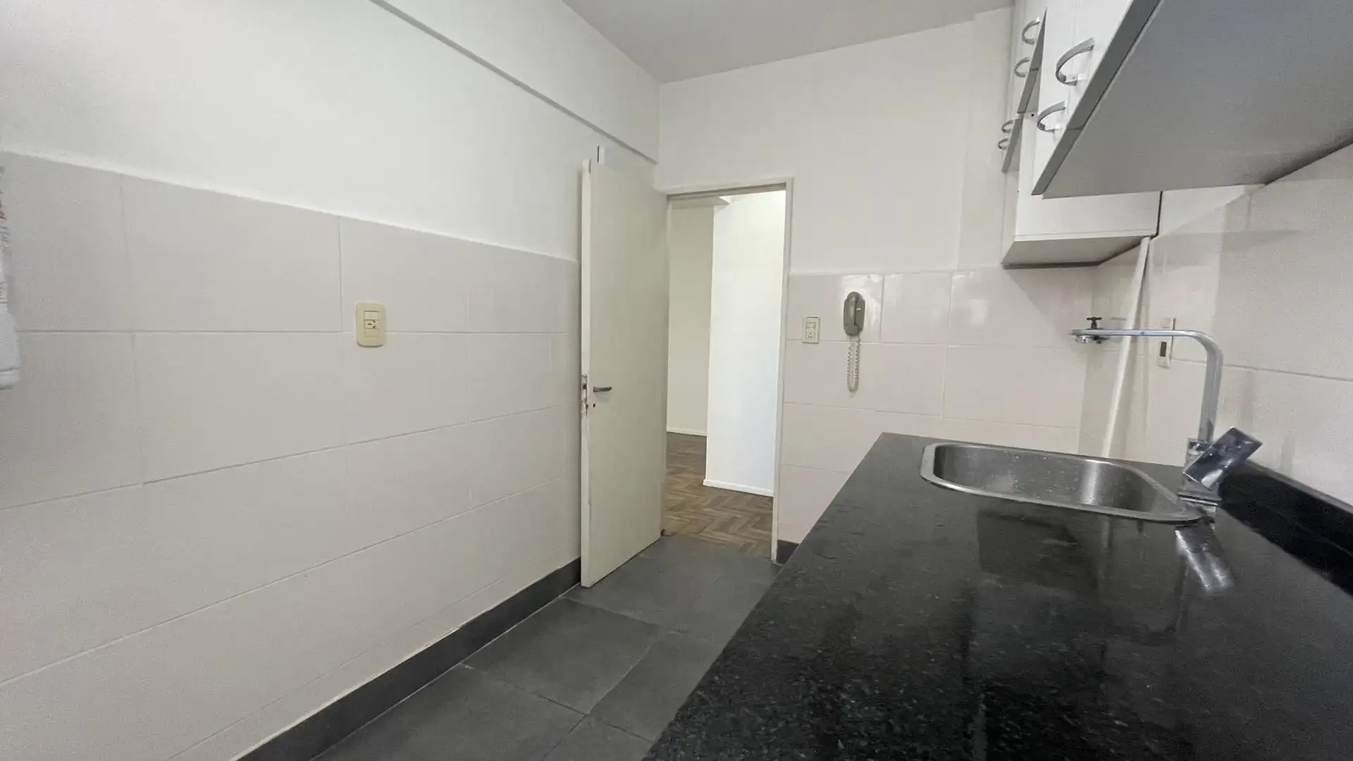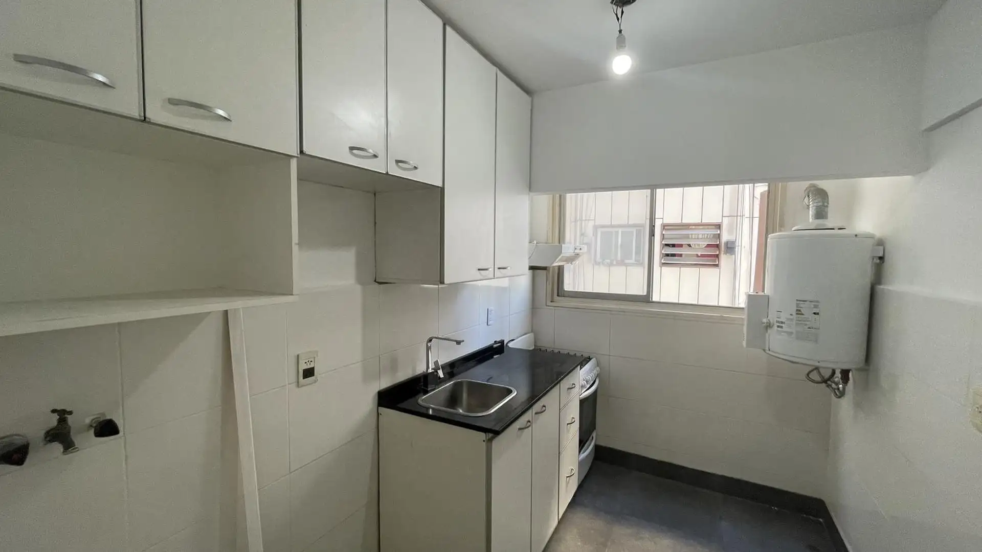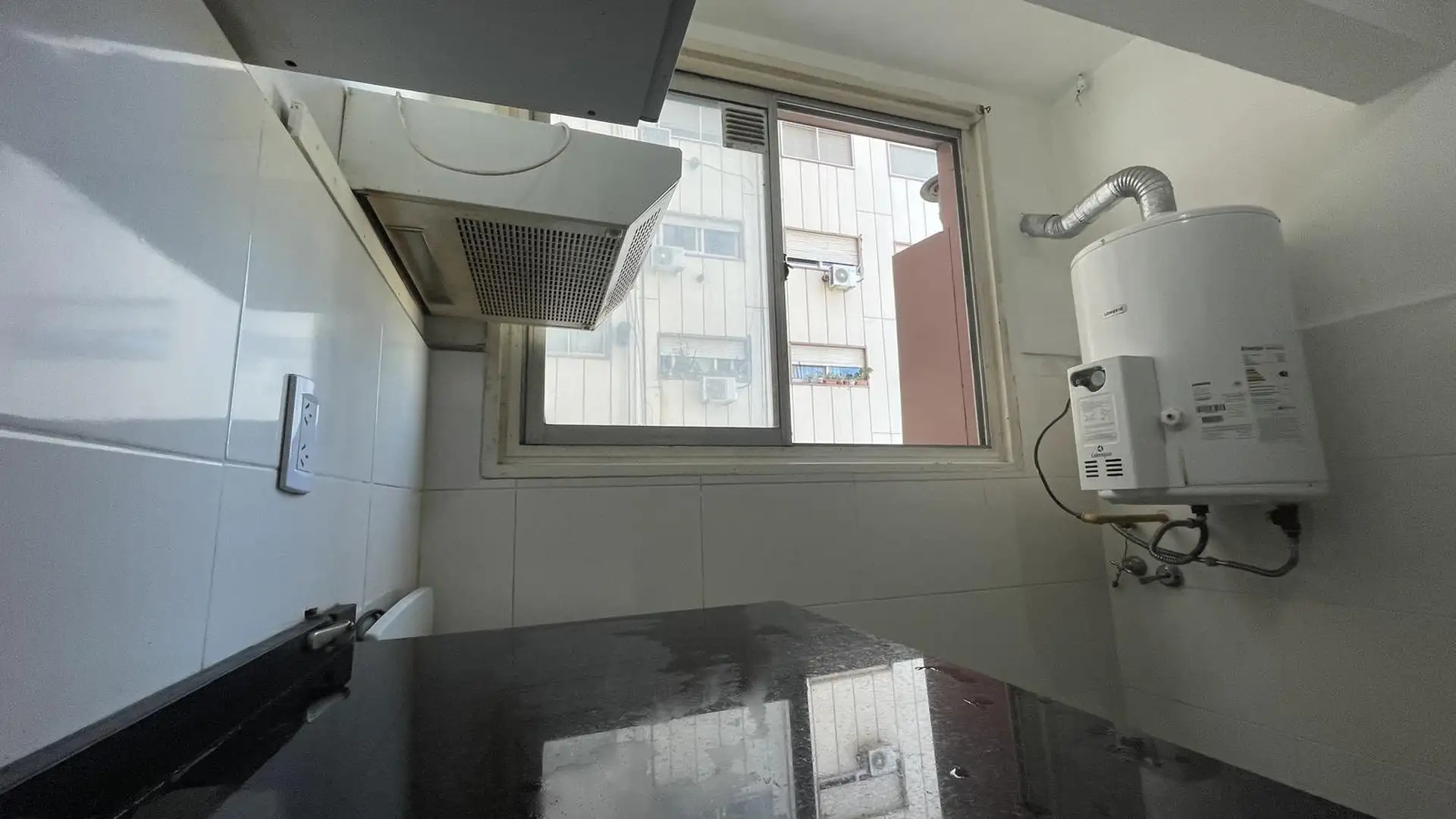 High-floor apartment in Núñez with 2 bedrooms and 3 rooms. The layout includes an entrance hall leading to a living-dining area and an independent kitchen. The kitchen is gas-powered and has a newly installed hot-water system, with space for a breakfast nook or small daily dining area; there is also space and plumbing for a washing machine and room to set up a ceiling drying rack. Living-dining room has recently refinished parquet floors, and there is a full bathroom with a vanity and bathtub. T