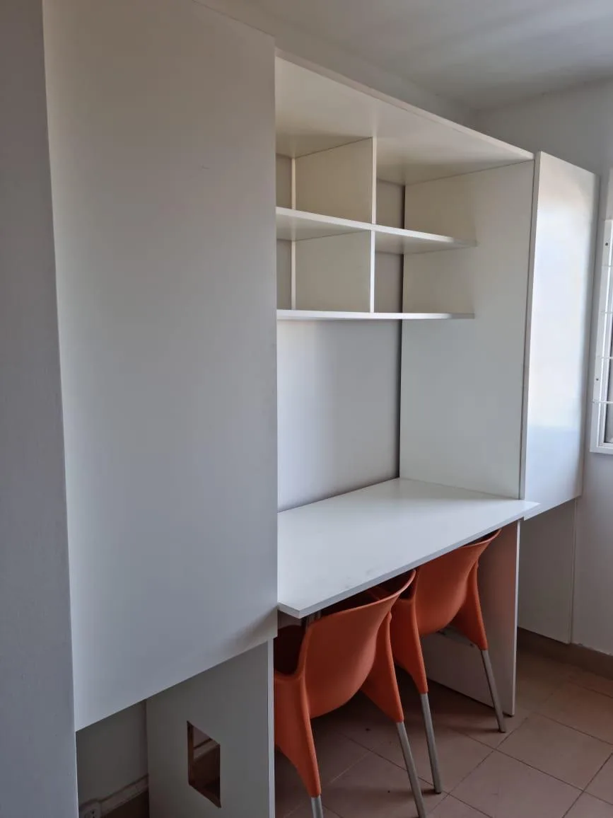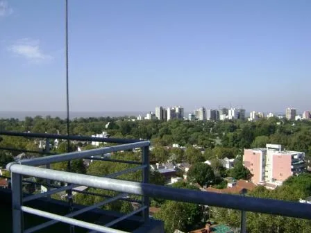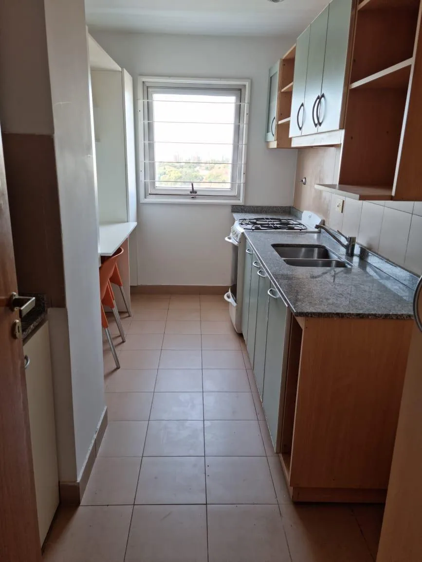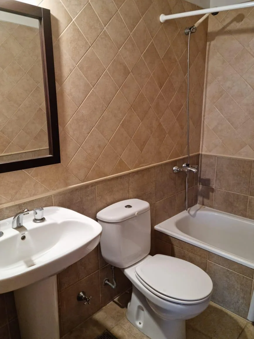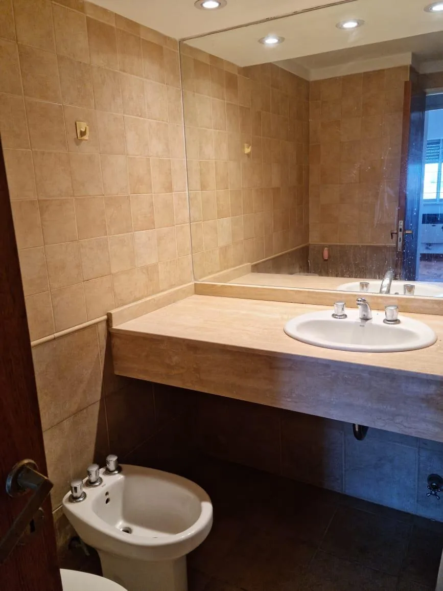 Three-room apartment in a modern building with a terrace, solarium, jacuzzi and laundry, plus on-site security. The living-dining room measures 7.2 x 3 m with parquet floors. There are two 3.10 x 3 m bedrooms with built-in wardrobes and parquet floors, and two 2 x 2 full bathrooms. The kitchen is 2.10 x 3.20 m with upper and lower cabinets and a countertop. The balcony measures 3 x 2 m. Assigned covered parking is in the basement level. Covered laundry is located in the kitchen.