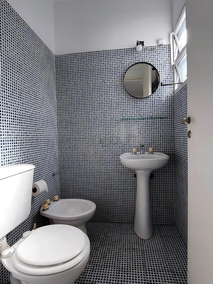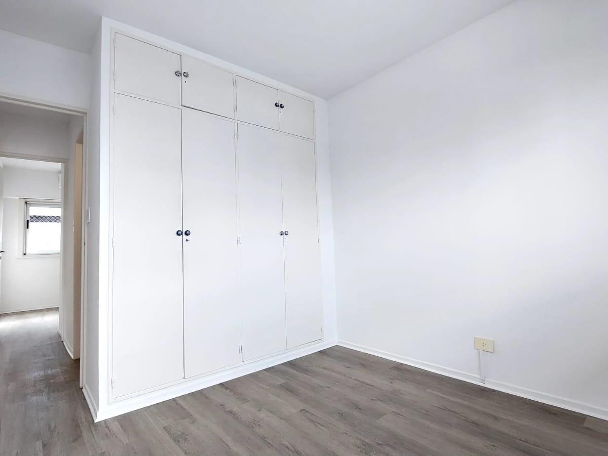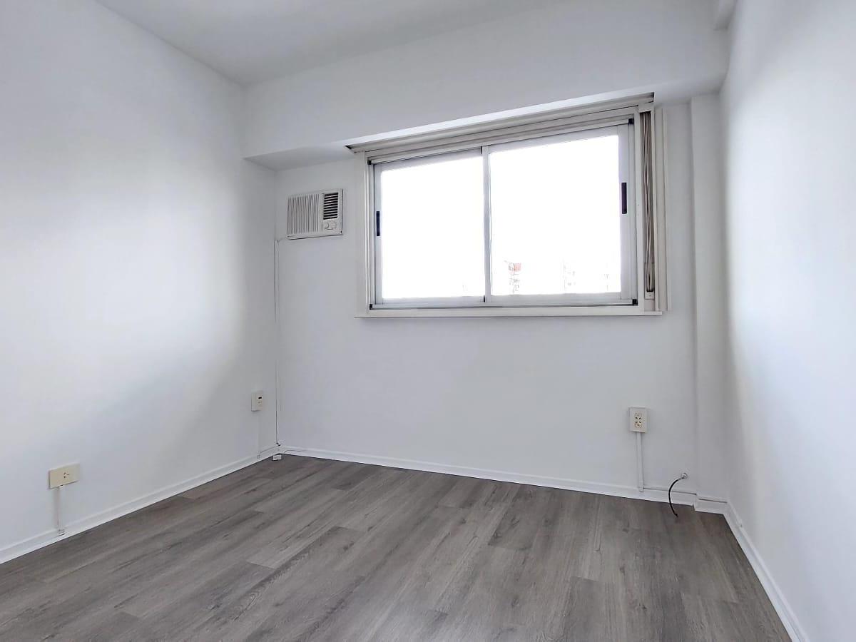 Apartment with 3 rooms and 2 bedrooms, courtyard-facing (contrafrente), with open views. There is a living and dining area with access to a long balcony that also connects to the main bedroom; the second bedroom looks onto the building’s interior courtyard. Two bathrooms (a full bathroom and a toilet) have external ventilation; the kitchen has lower and upper cabinets, space for a fridge and a washing machine, plus a separate laundry room with ventilation and access to the balcony. The unit is f
