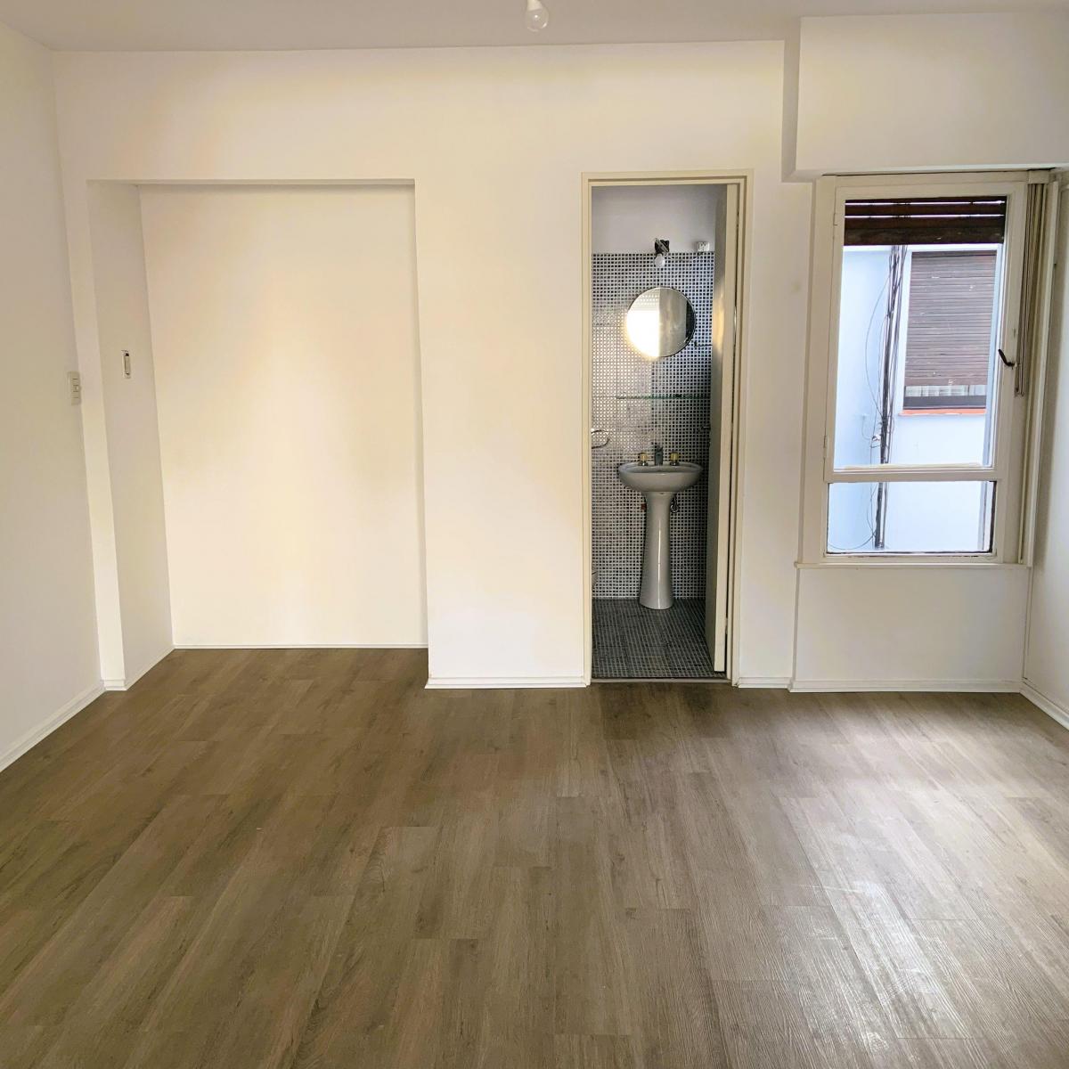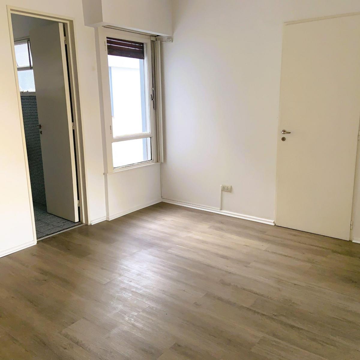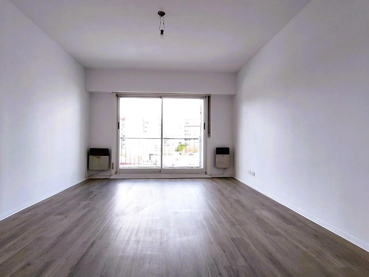 Apartment with 3 rooms and 2 bedrooms, courtyard-facing (contrafrente), with open views. There is a living and dining area with access to a long balcony that also connects to the main bedroom; the second bedroom looks onto the building’s interior courtyard. Two bathrooms (a full bathroom and a toilet) have external ventilation; the kitchen has lower and upper cabinets, space for a fridge and a washing machine, plus a separate laundry room with ventilation and access to the balcony. The unit is f