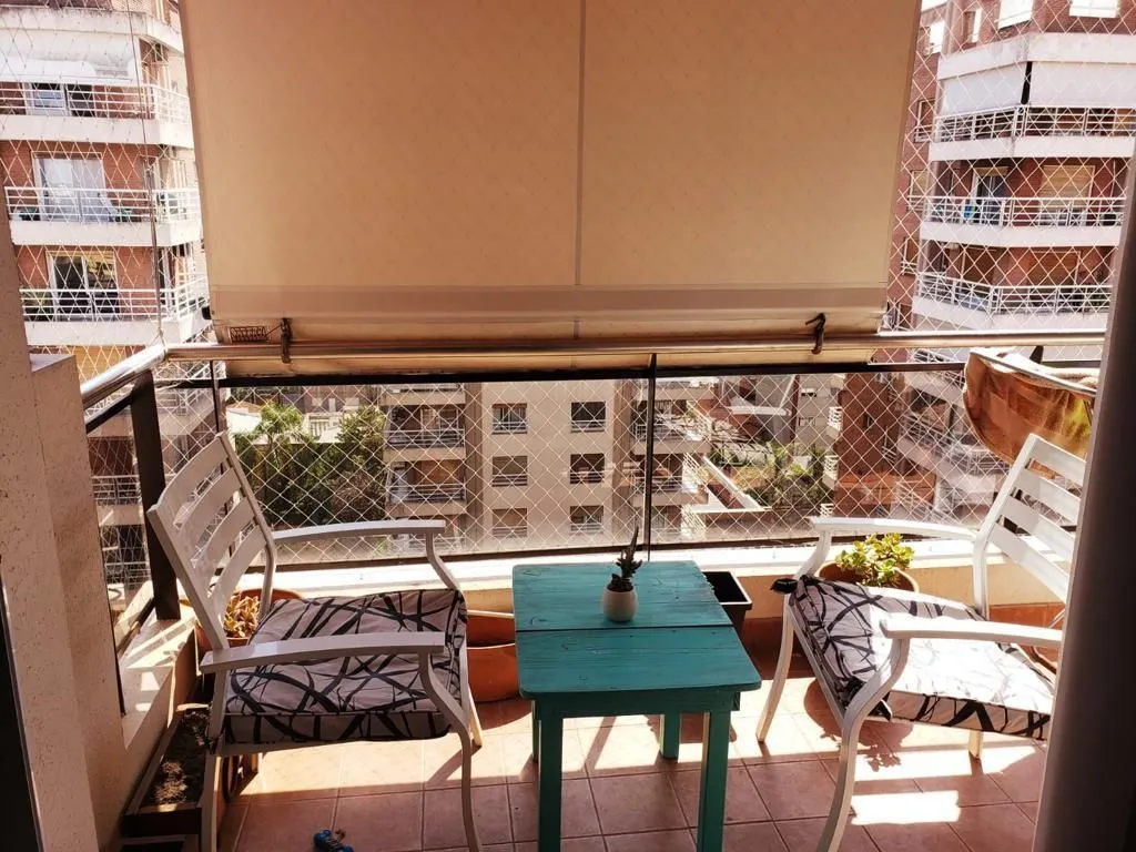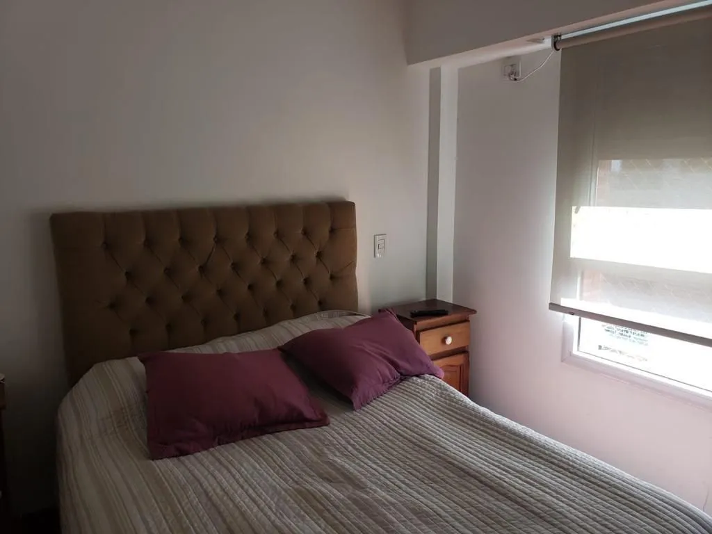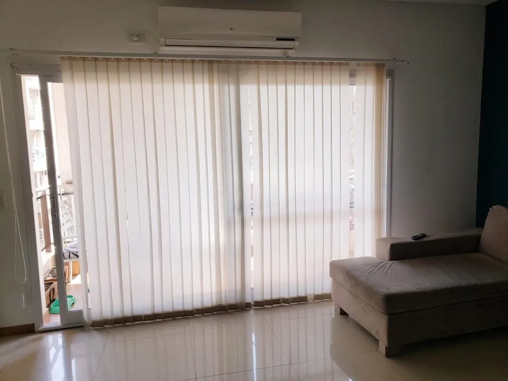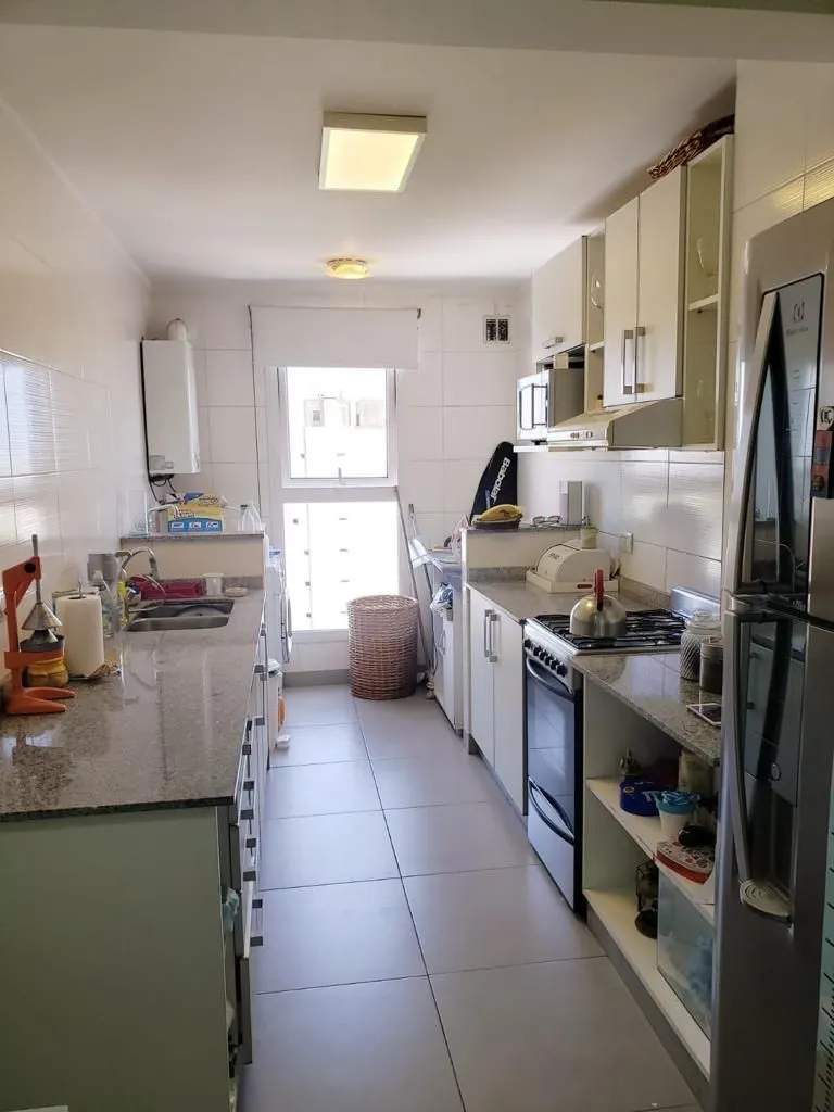 Three-room apartment in Quilmes Centro with a double parking space in the basement. It has 2 bedrooms, a living-dining room opening to a wide front balcony with a covered terrace ceiling, a reception toilet, an independent eat-in kitchen, a laundry area, and a full bathroom with a bathtub. Fully furnished with kitchen cabinetry, granite countertops, a double stainless-steel sink, a four-burner stove with oven and electronic ignition, air conditioning in all rooms, and underfloor heating via a se