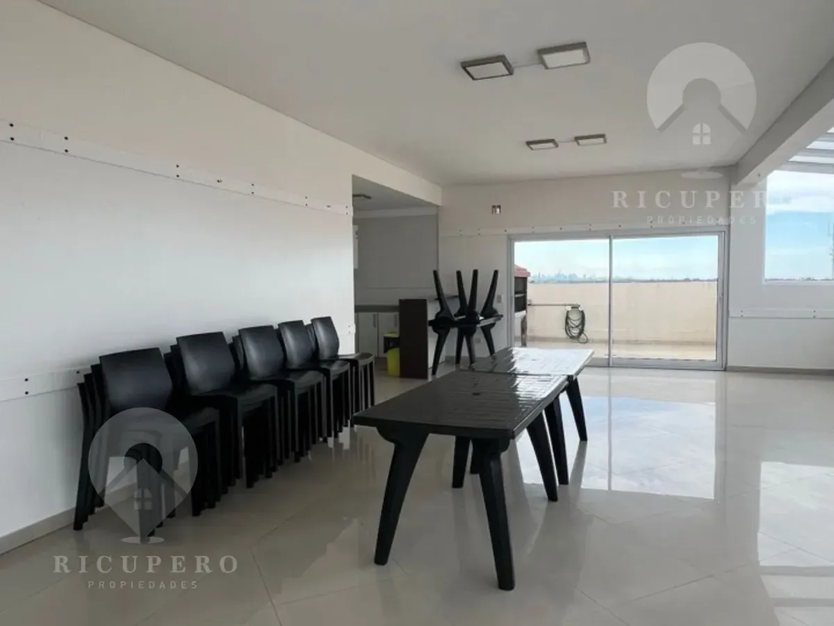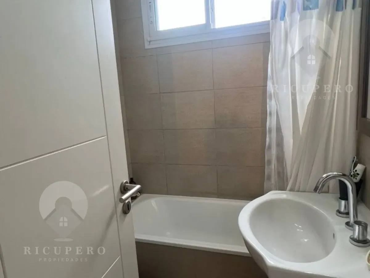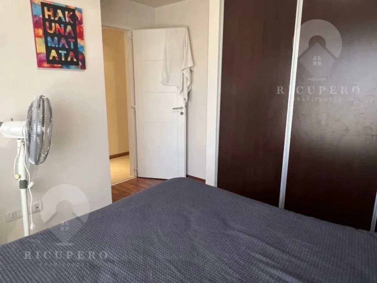 Three-room apartment in Quilmes Centro with a double parking space in the basement. It has 2 bedrooms, a living-dining room opening to a wide front balcony with a covered terrace ceiling, a reception toilet, an independent eat-in kitchen, a laundry area, and a full bathroom with a bathtub. Fully furnished with kitchen cabinetry, granite countertops, a double stainless-steel sink, a four-burner stove with oven and electronic ignition, air conditioning in all rooms, and underfloor heating via a se