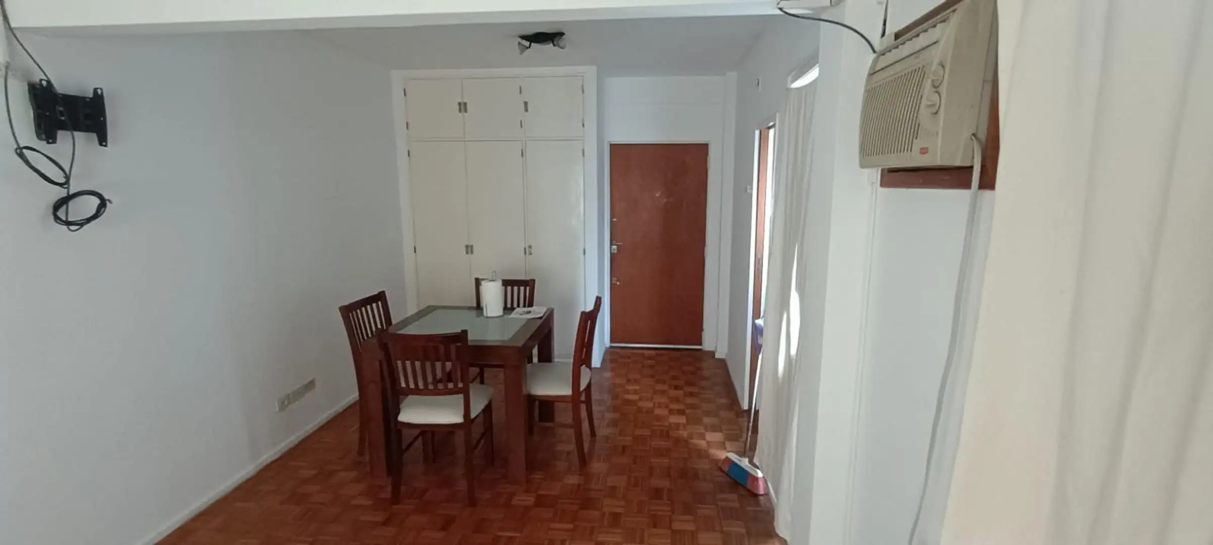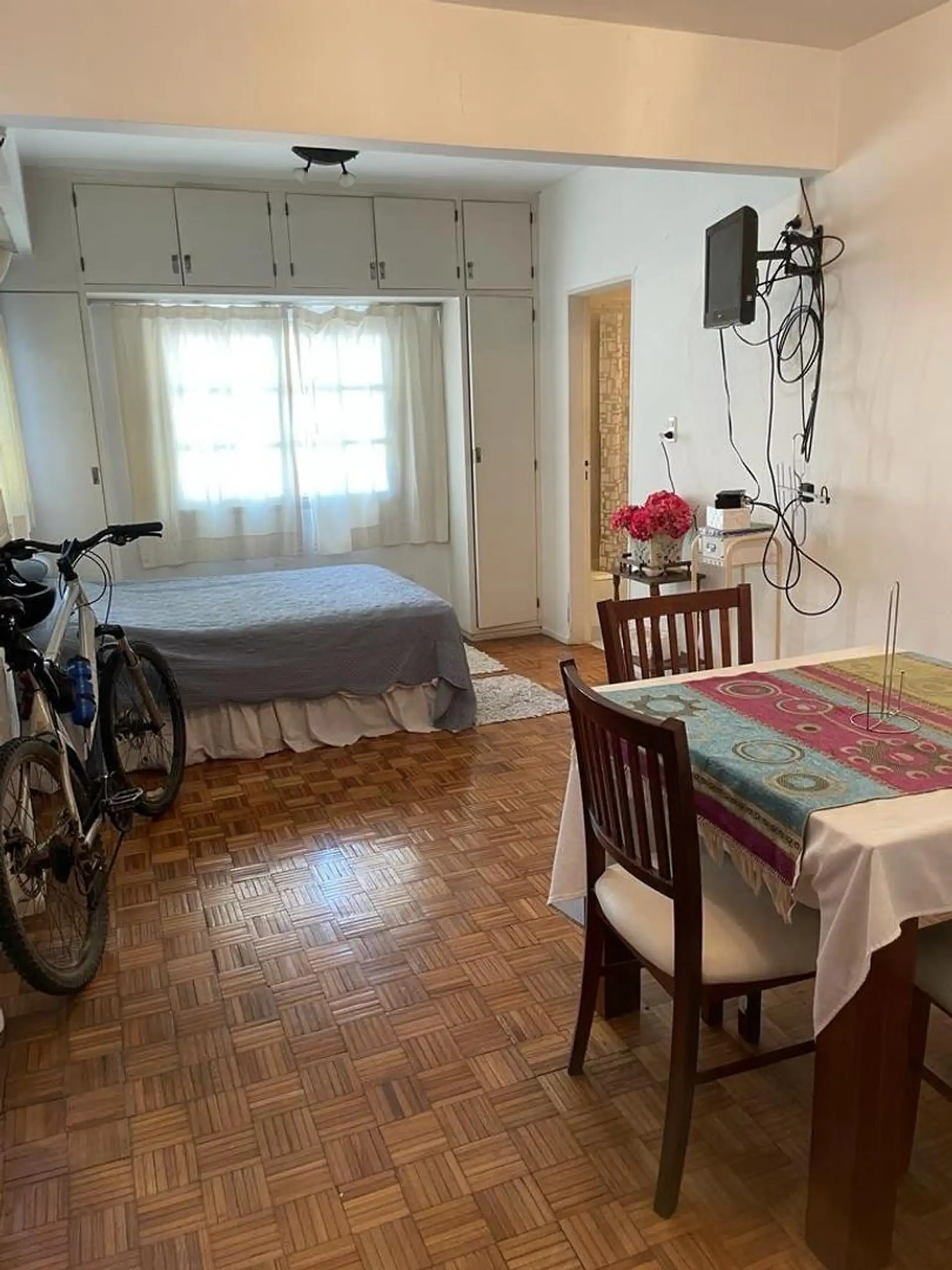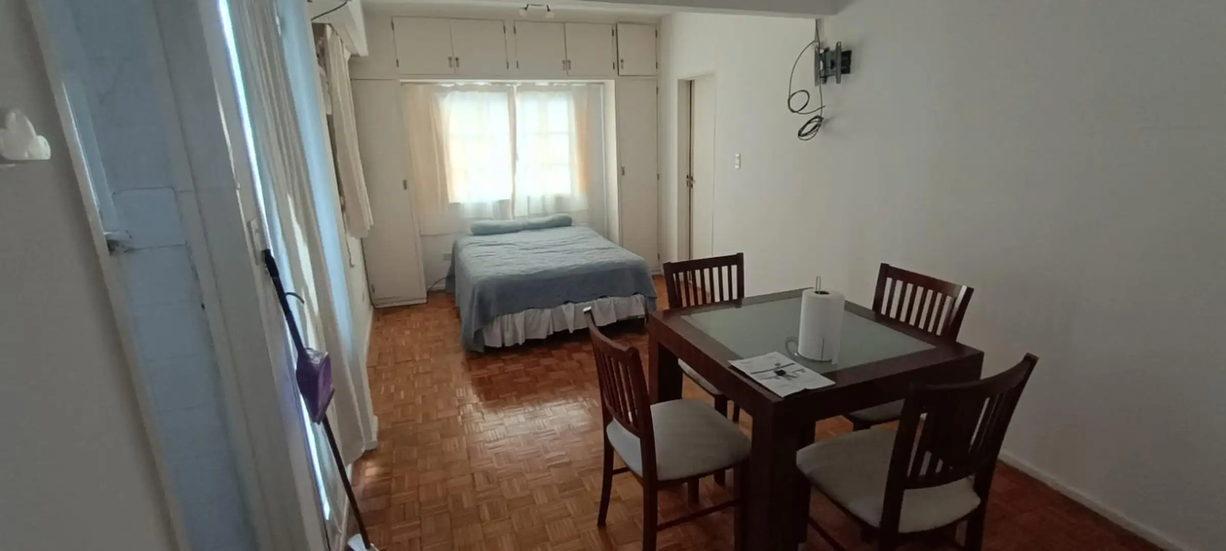 Studio apartment on the 7th floor, courtyard-facing, with plenty of windows. Independent kitchen and a bathroom with a bathtub. Large fitted wardrobe; includes a table, chairs, bed base and microwave. Building has two elevators. Rental terms are for 2 years; owner guarantee is required and pets are not accepted.