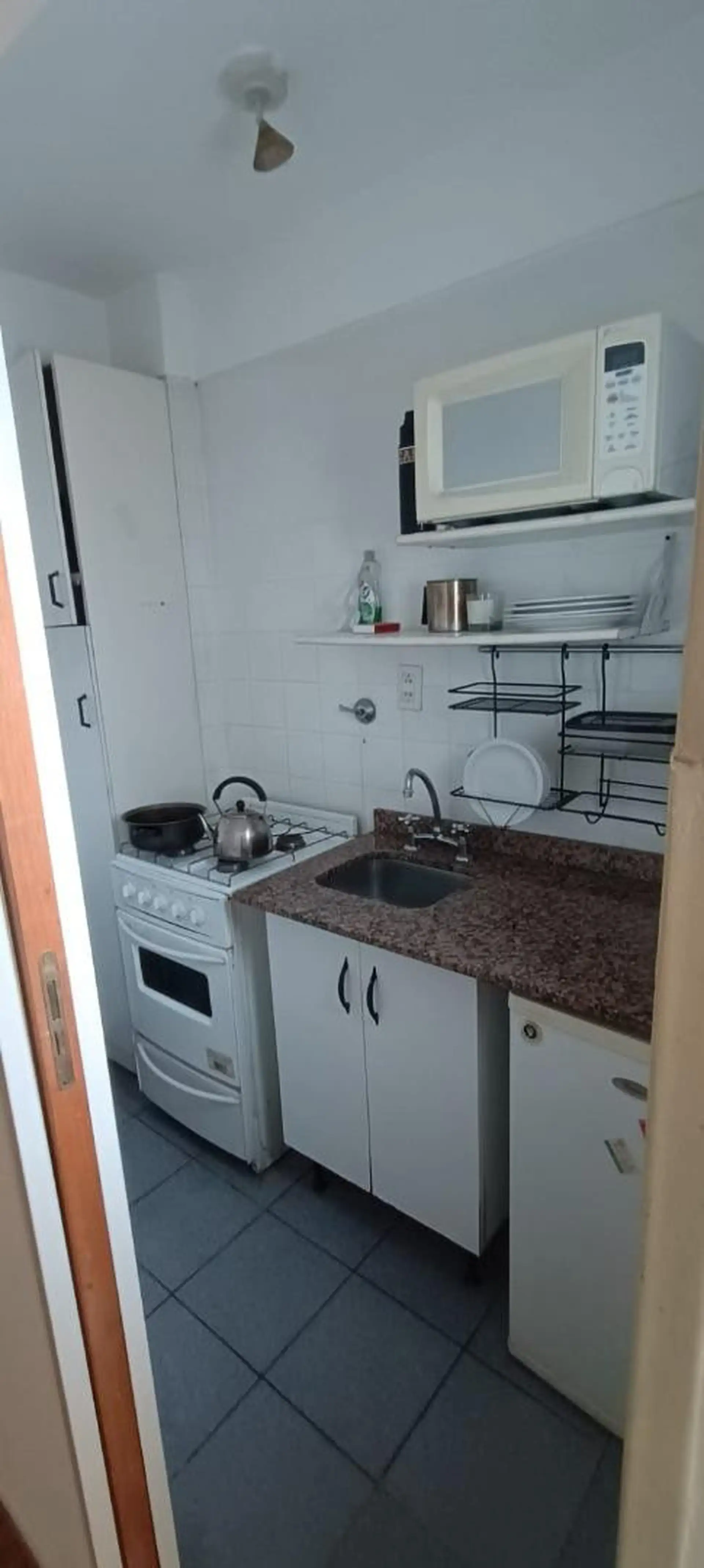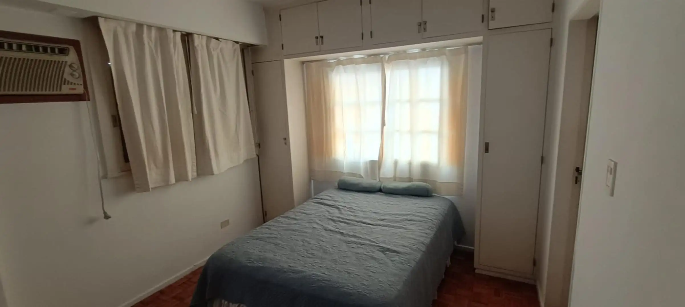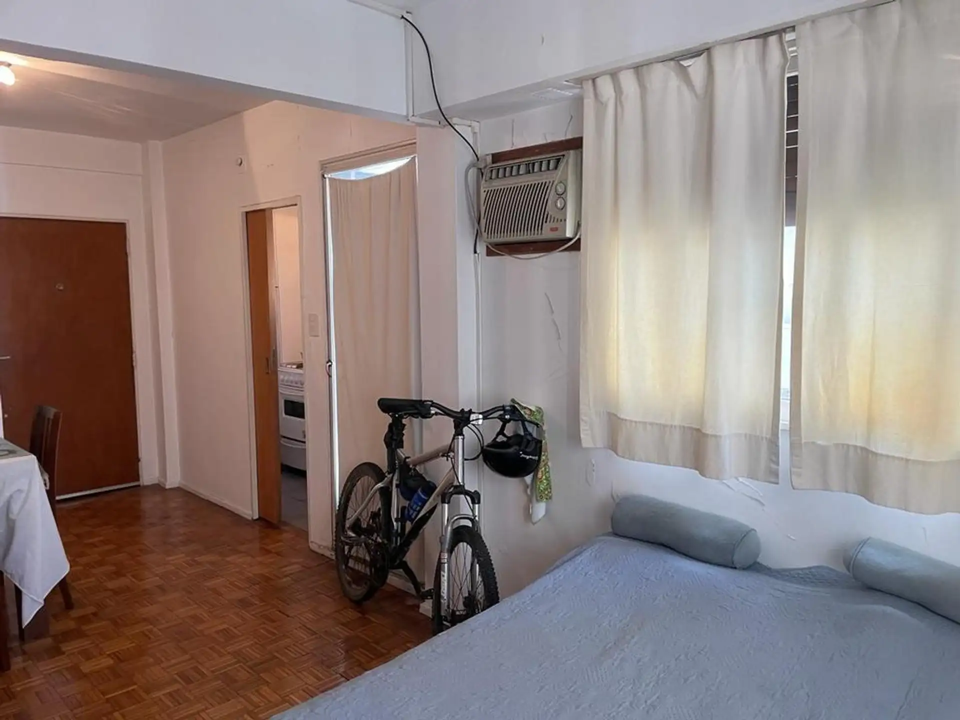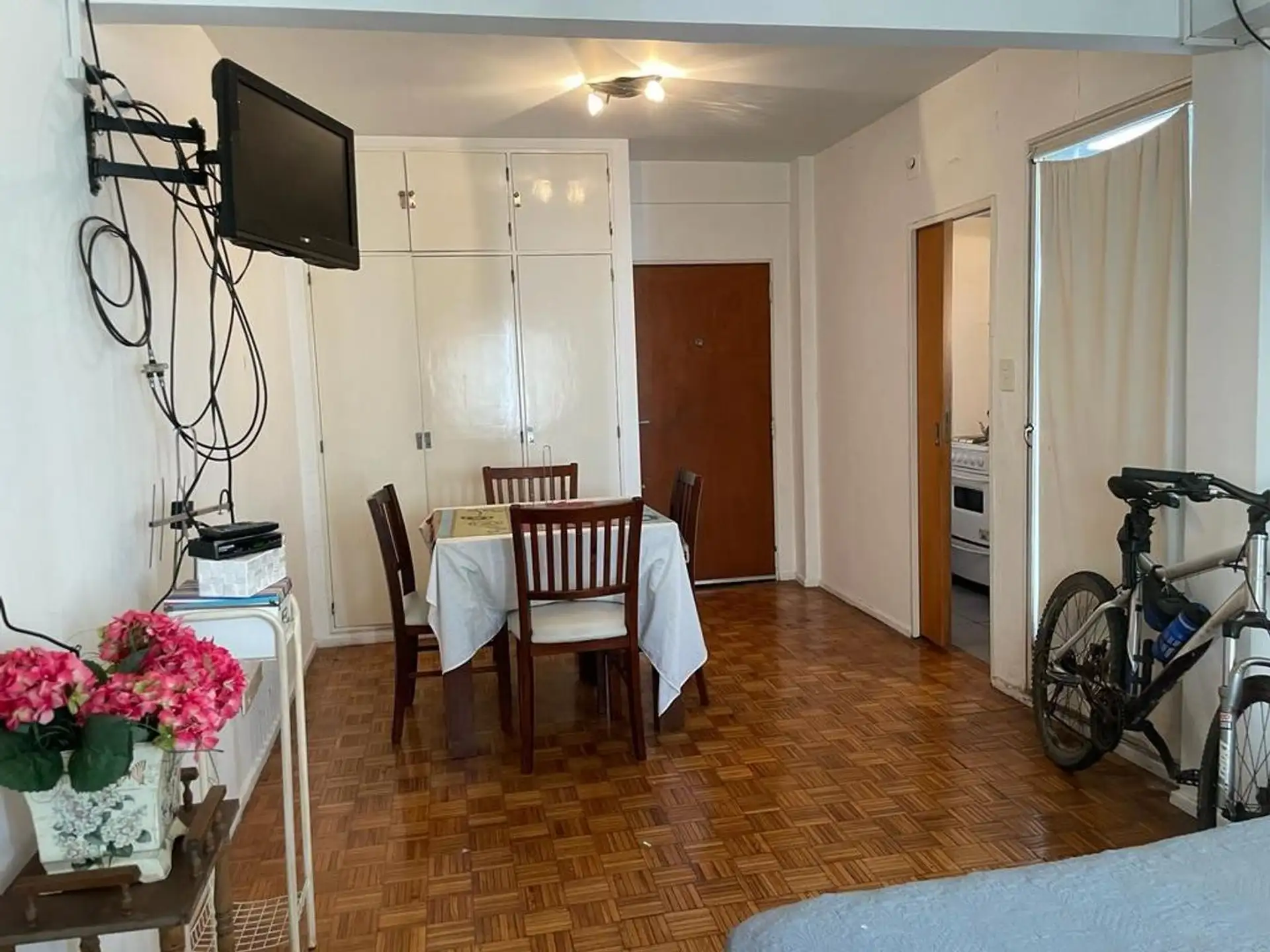 Studio apartment on the 7th floor, courtyard-facing, with plenty of windows. Independent kitchen and a bathroom with a bathtub. Large fitted wardrobe; includes a table, chairs, bed base and microwave. Building has two elevators. Rental terms are for 2 years; owner guarantee is required and pets are not accepted.
