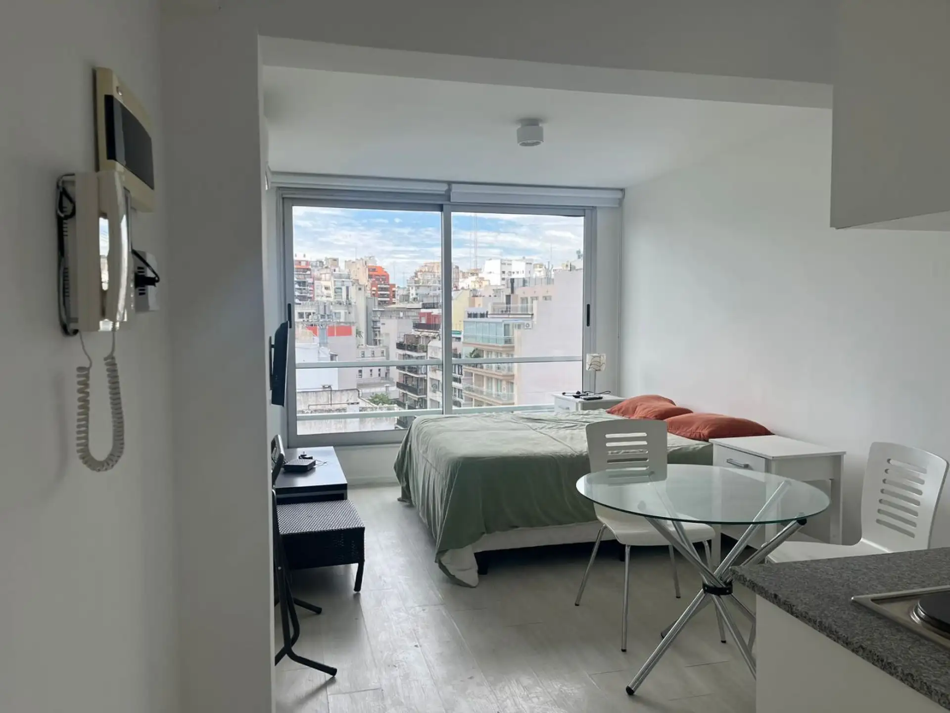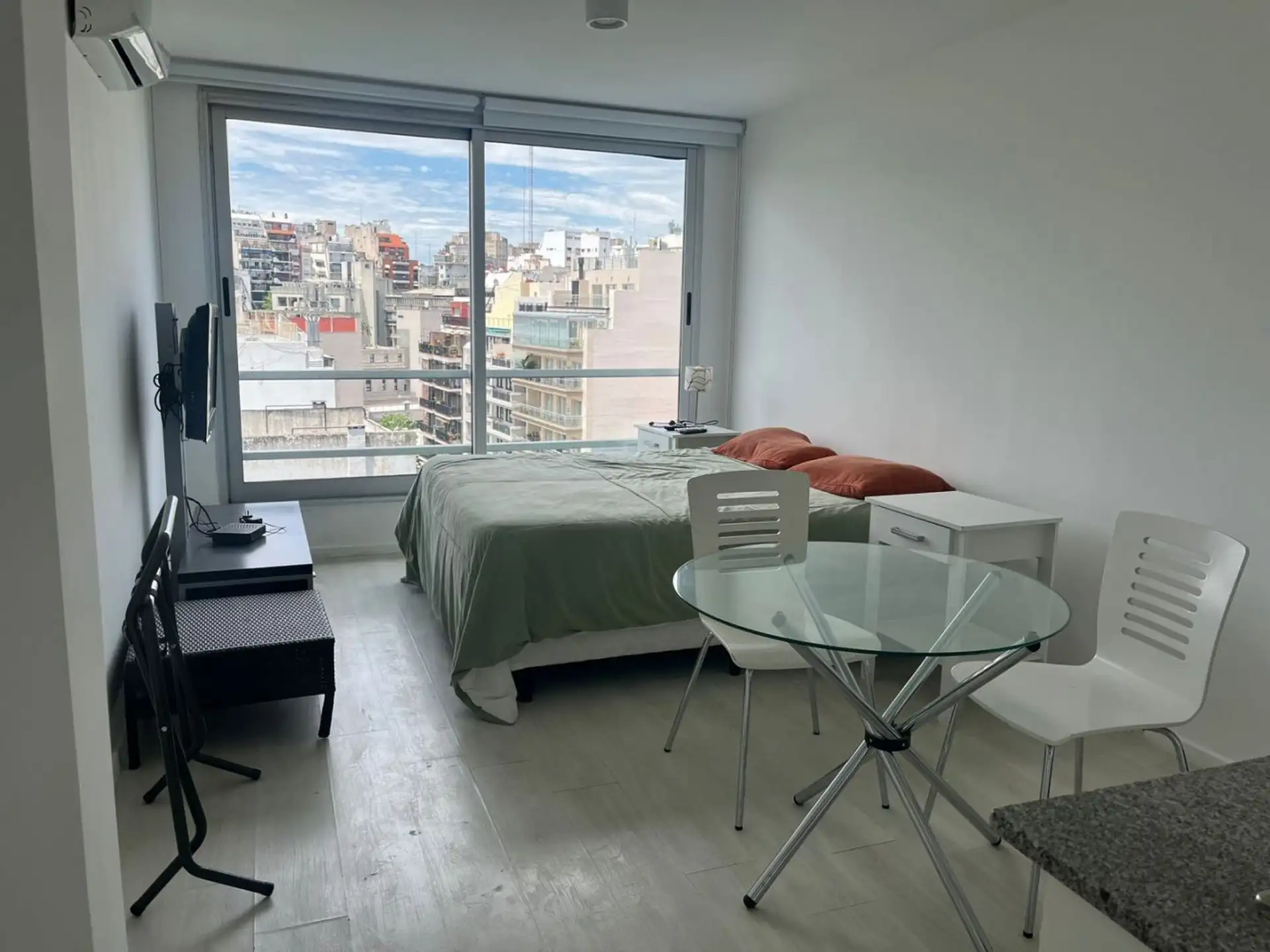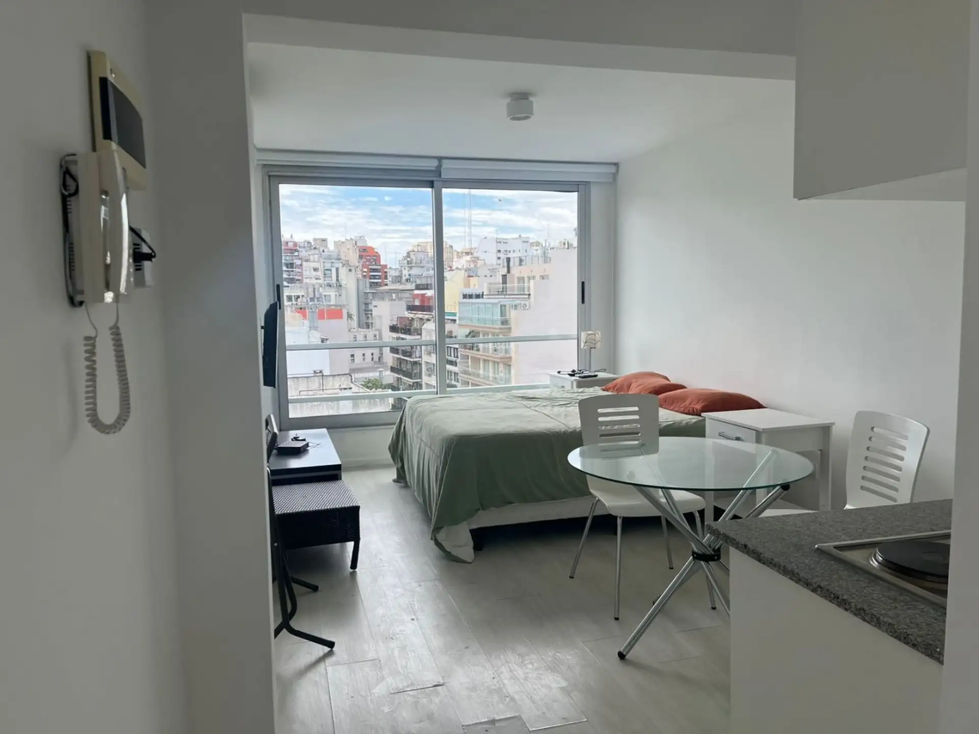 Studio apartment in Recoleta, 10th floor. Furnished, with an integrated kitchen equipped with electric burners and a full bathroom with a bathtub. The main room has a built-in wardrobe, cold/warm air conditioning, and central hot water. The unit has no balcony; the lift reaches the 9th floor and the 10th is accessed via one flight of stairs.