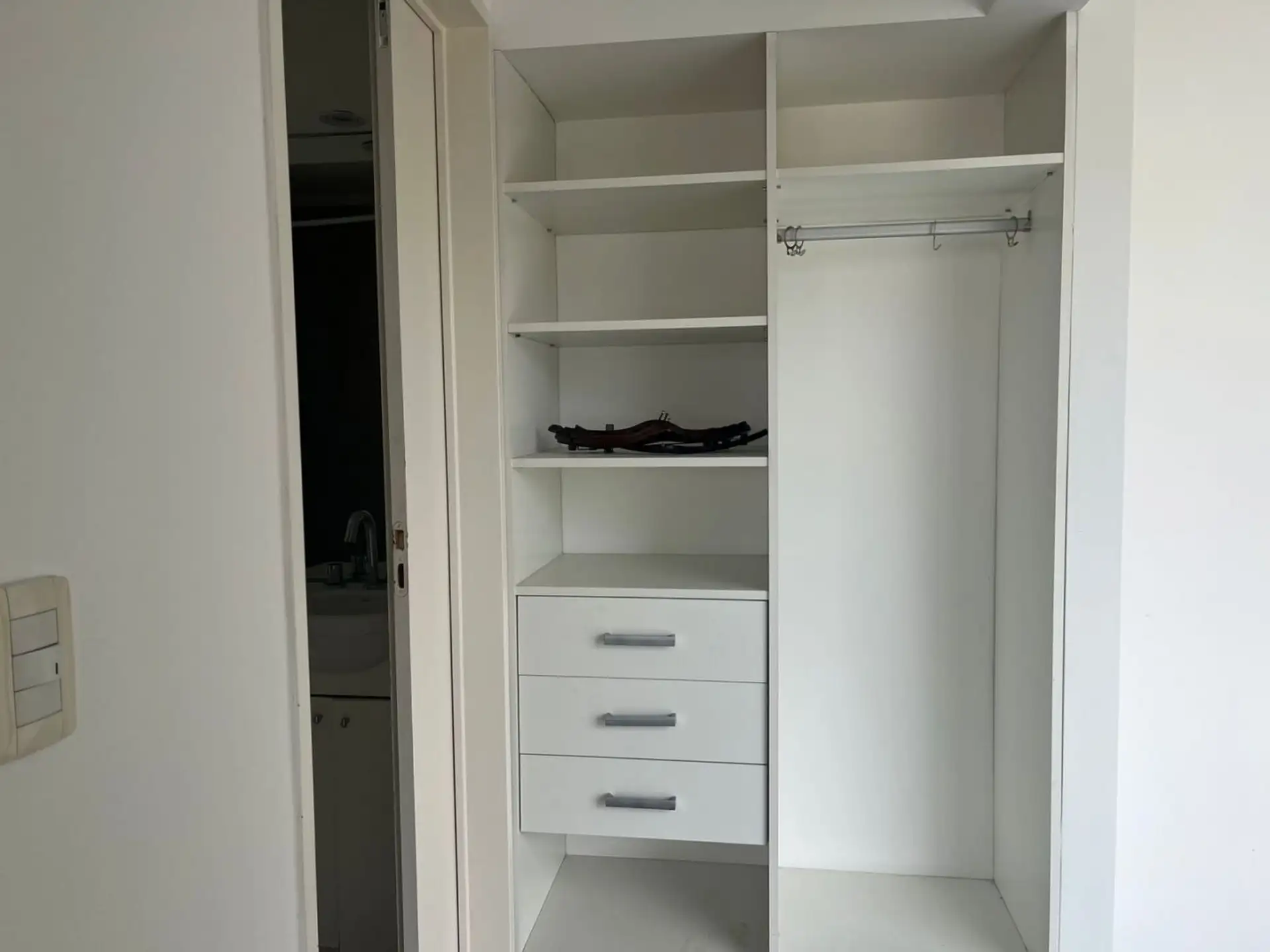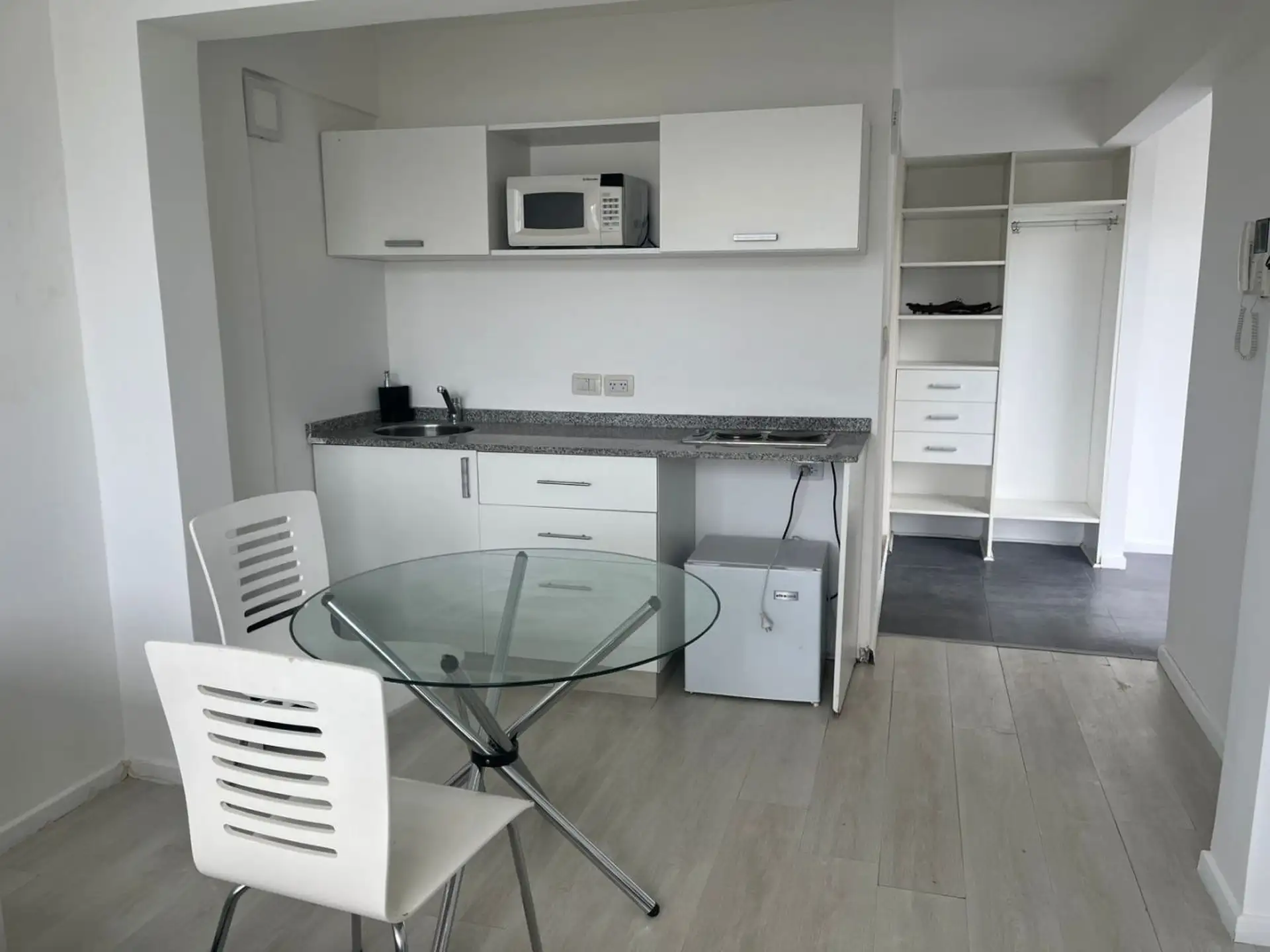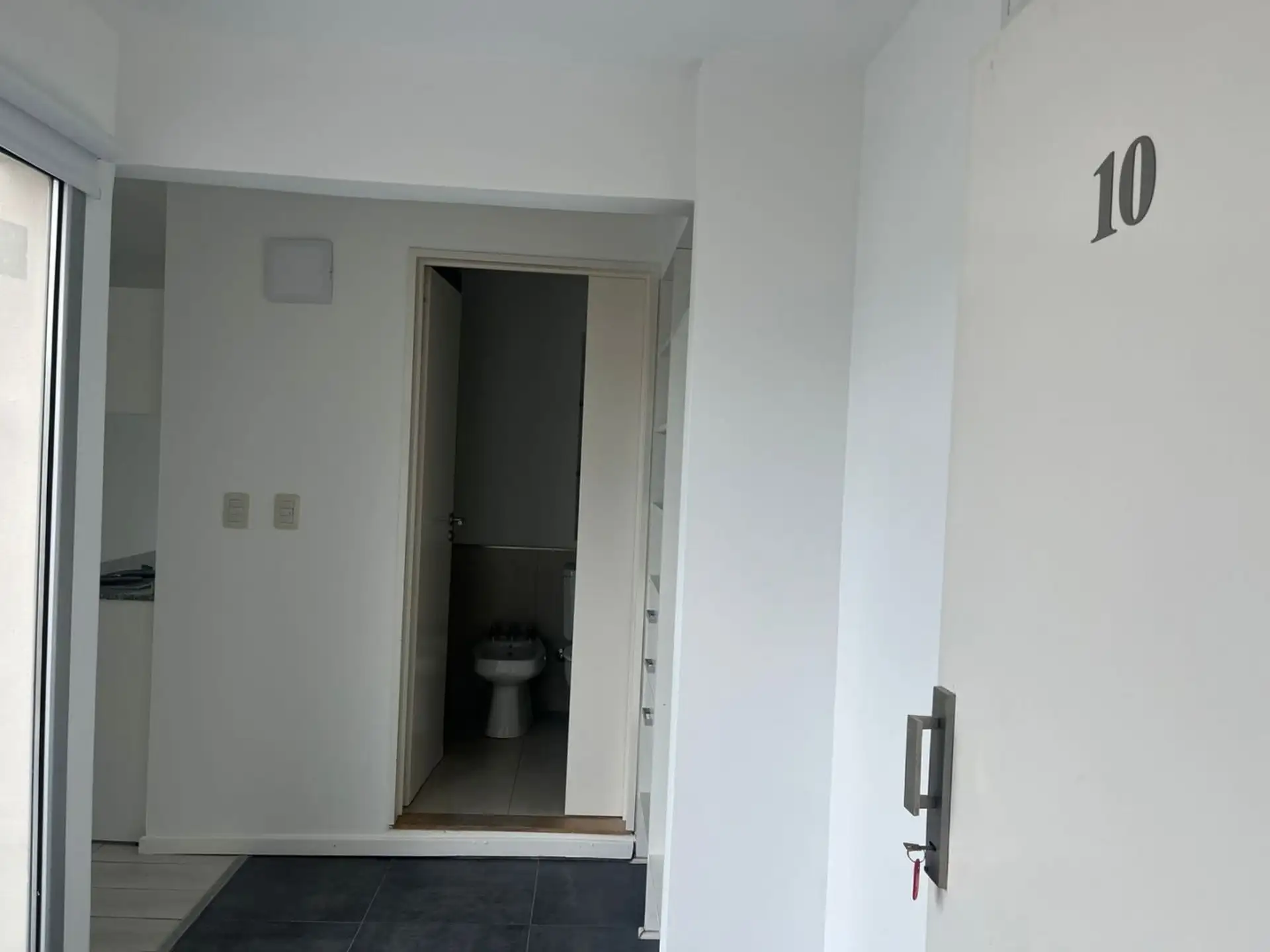 Studio apartment in Recoleta, 10th floor. Furnished, with an integrated kitchen equipped with electric burners and a full bathroom with a bathtub. The main room has a built-in wardrobe, cold/warm air conditioning, and central hot water. The unit has no balcony; the lift reaches the 9th floor and the 10th is accessed via one flight of stairs.