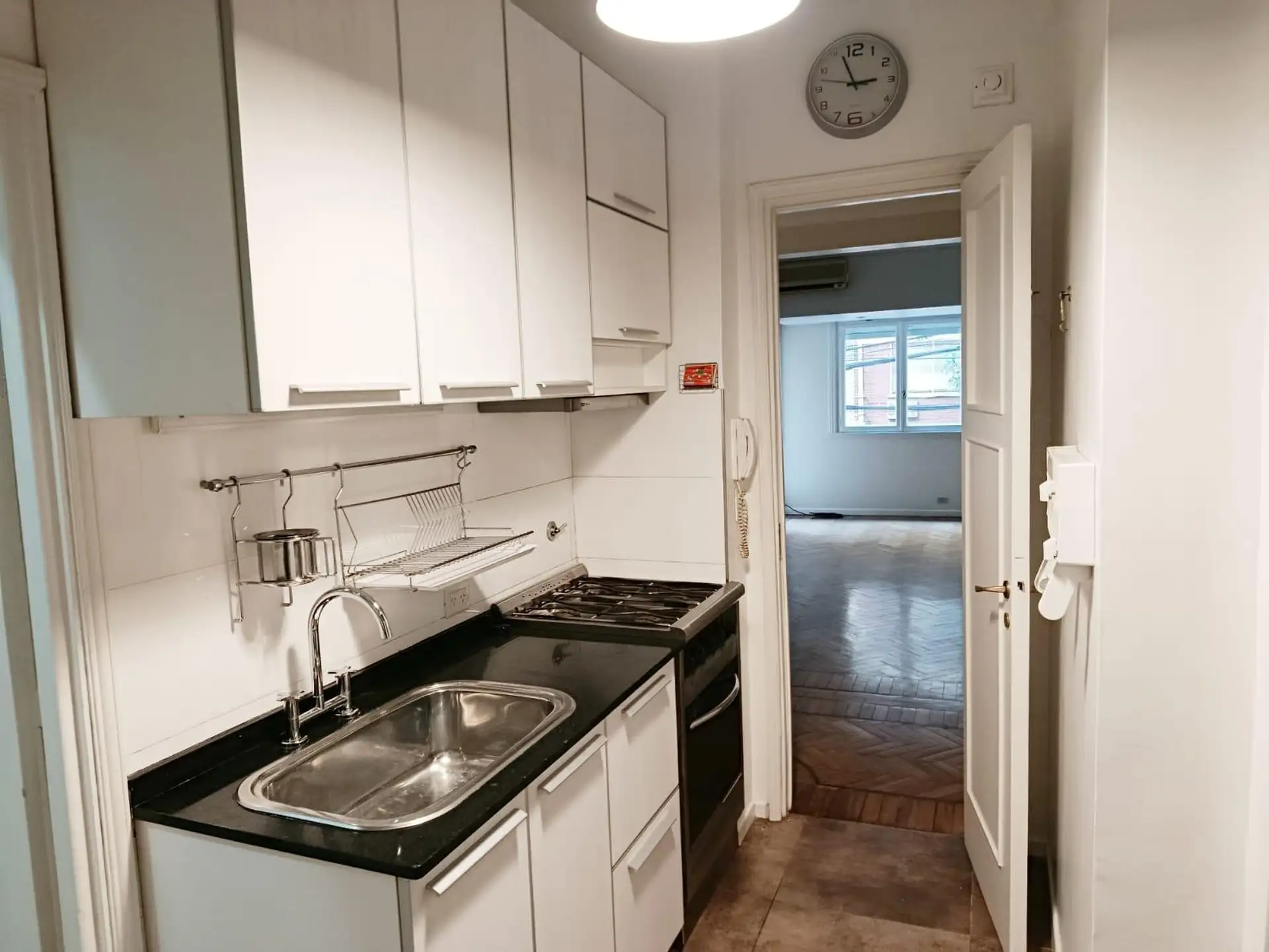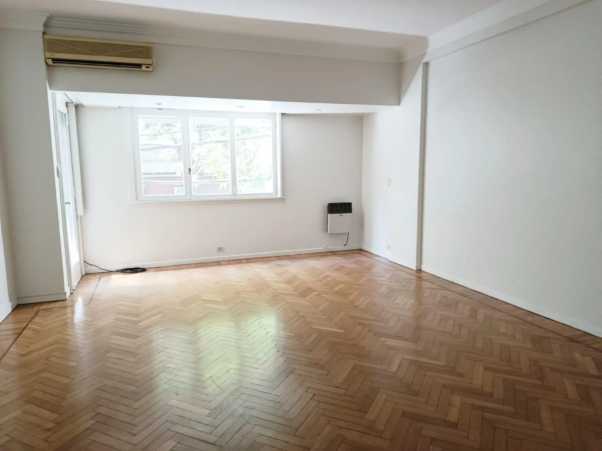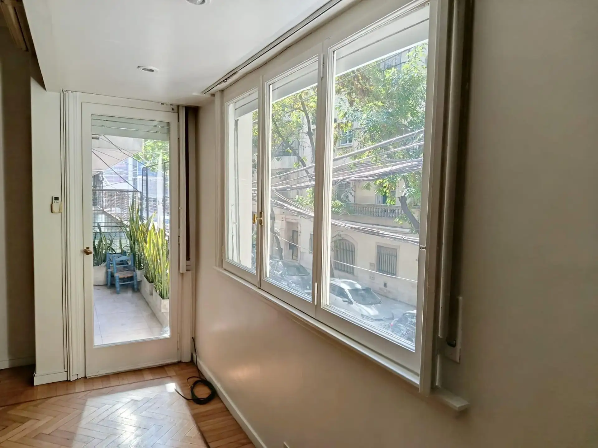 Two-bedroom, three-room half-floor apartment in Recoleta on the corner of Arenales and Billinghurst, street-facing with a continuous balcony. The unit has a front living-dining room, two bedrooms with built-in closets, a main fully refurbished bathroom with bathtub and natural ventilation, and a refurbished kitchen with gas industrial-style stove, cooktop, extractor hood, storage space and room for a fridge. There are two air-conditioning units (living room and main bedroom) and balanced-flue he